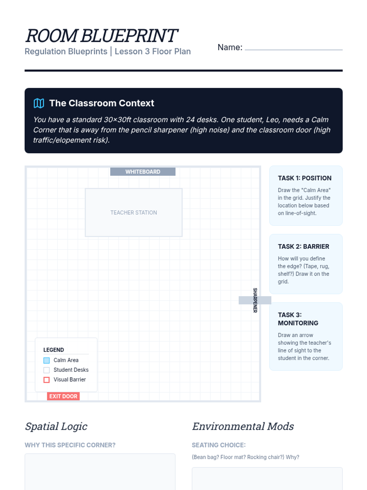 Focusing on the physical environment, students design safe and effective 'Calm Corners' that balance accessibility with classroom management needs.
