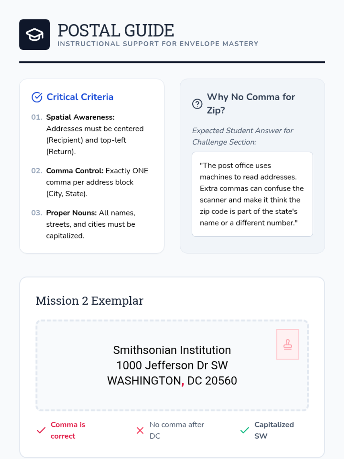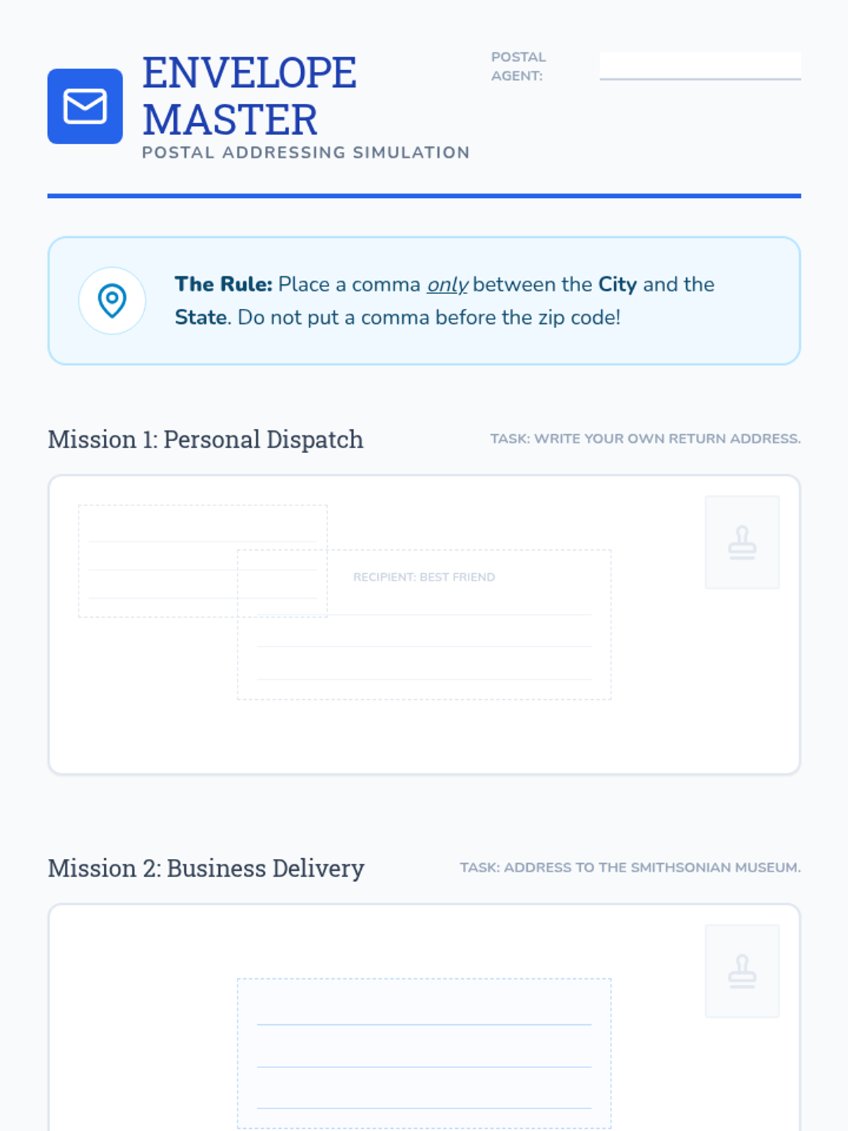Students learn the spatial layout of an envelope and practice capitalization and comma rules for addresses.