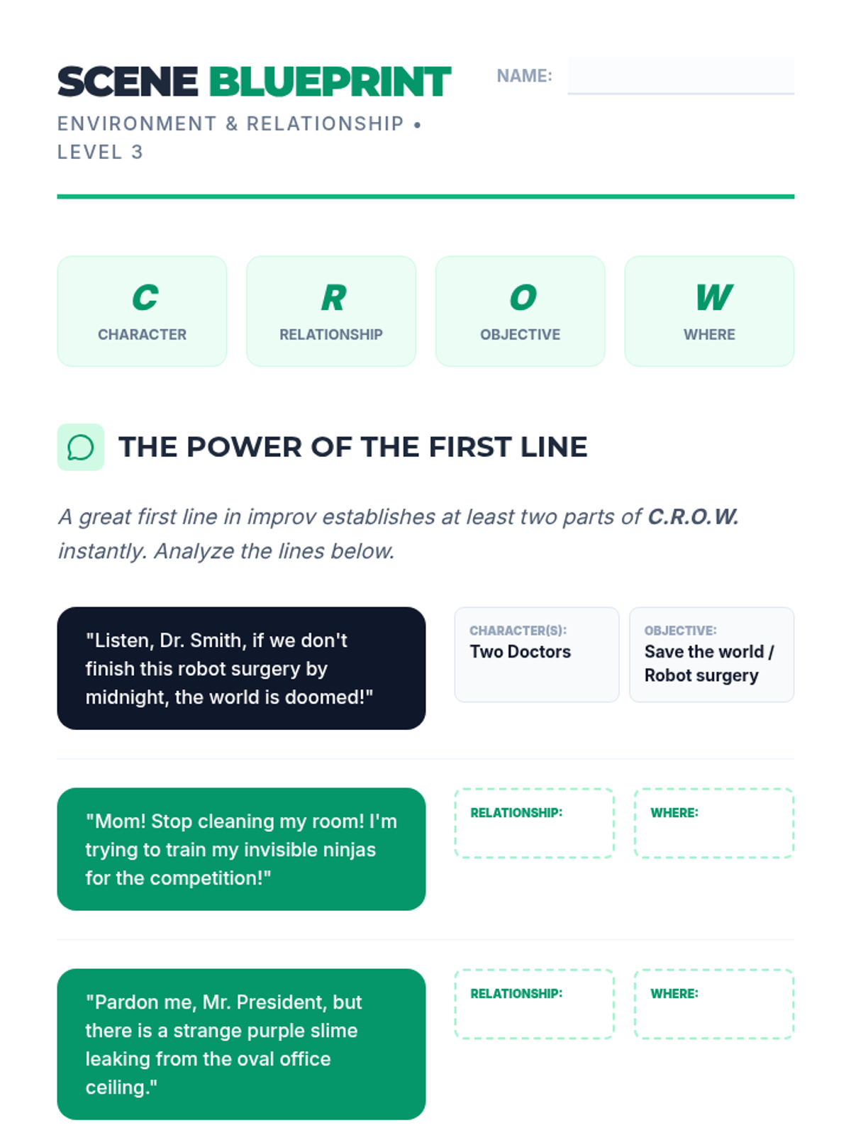 Students learn to establish 'CROW' (Character, Relationship, Objective, Where) quickly in an improv scene. They practice starting scenes with physical activity that defines the location without using words.