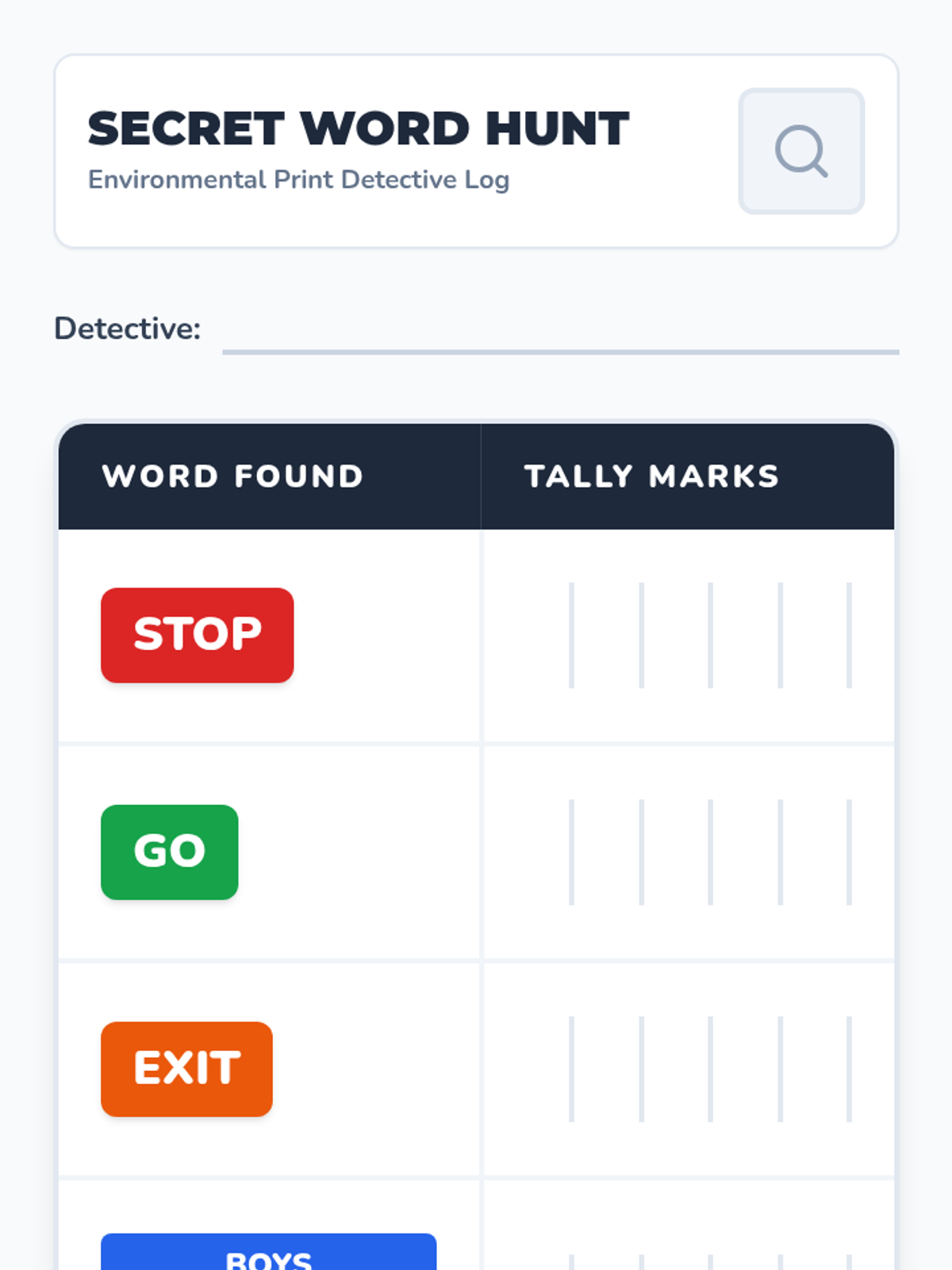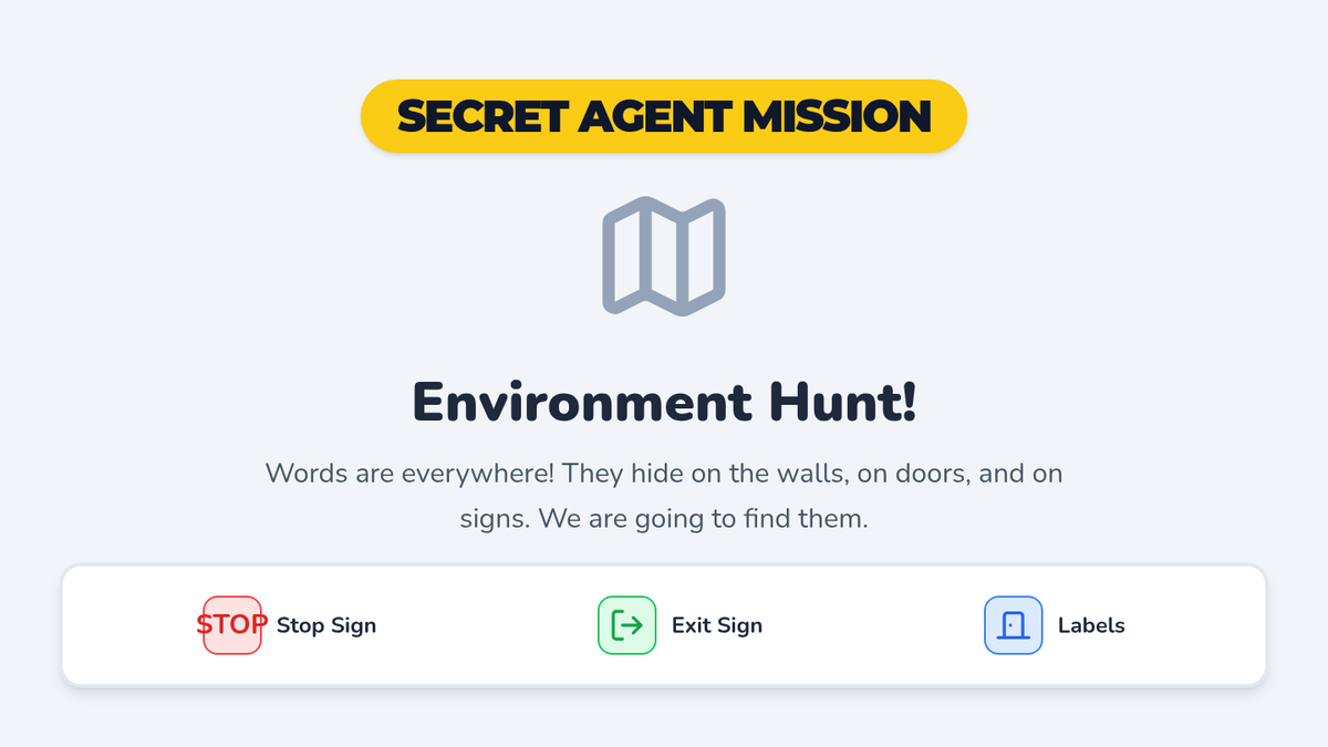 The class explores the environment to find high-frequency words on signs and labels, using detective hats and tally sheets.