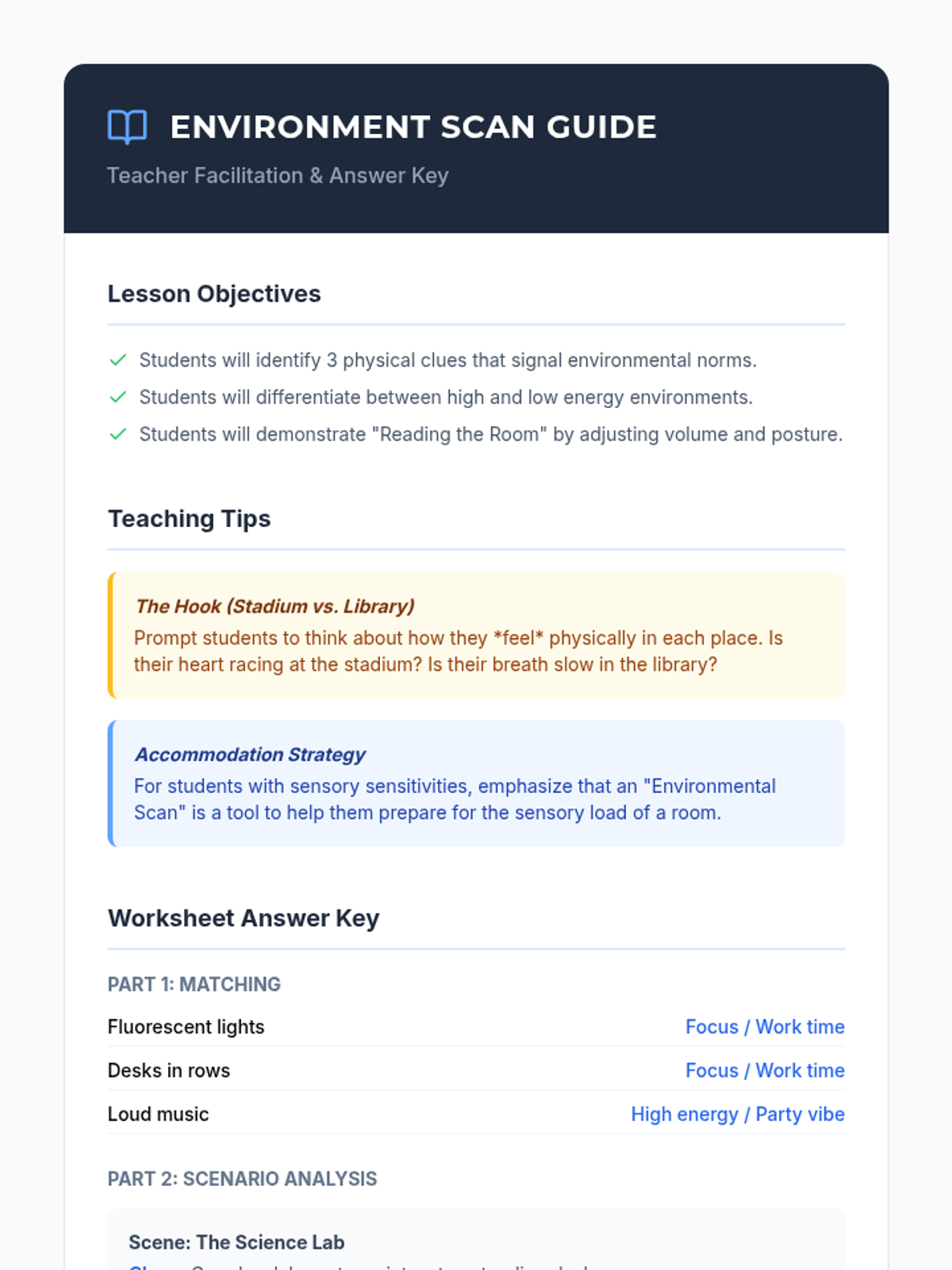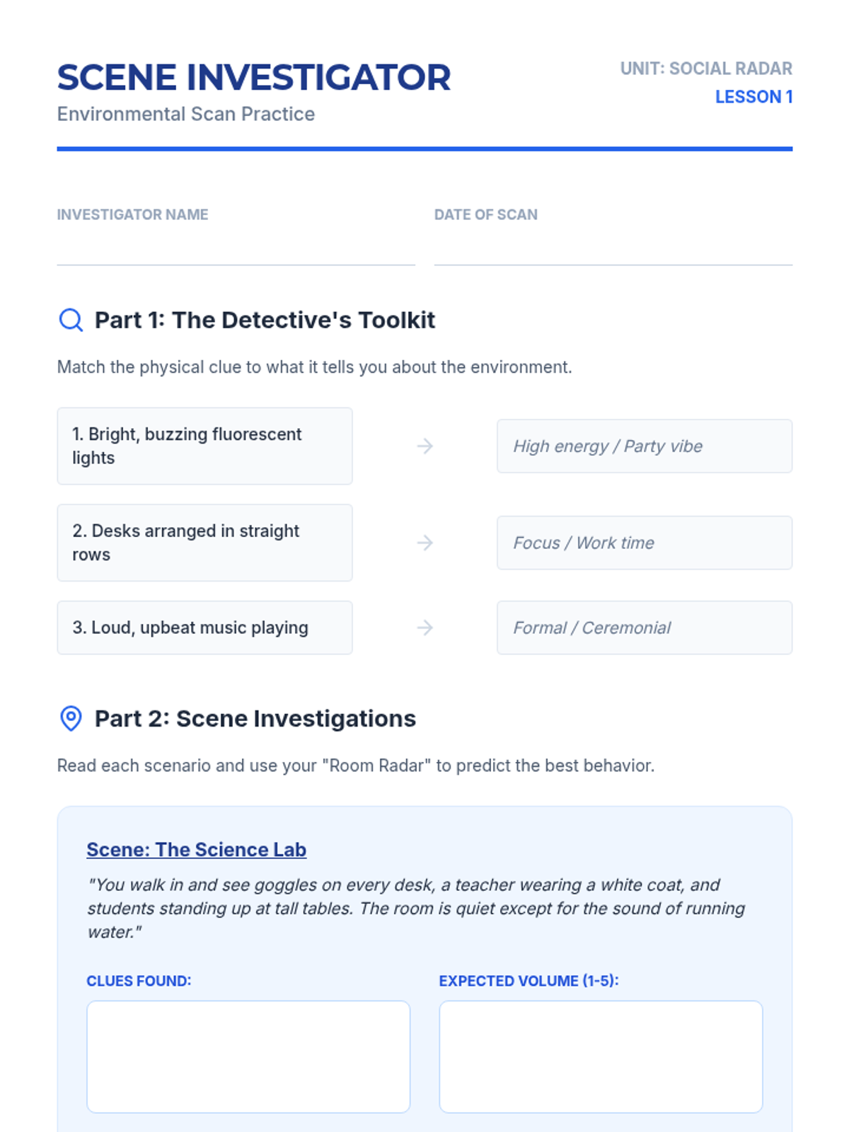 Students learn to identify physical indicators in various environments to predict expected social behaviors and volume levels.