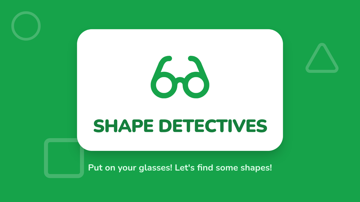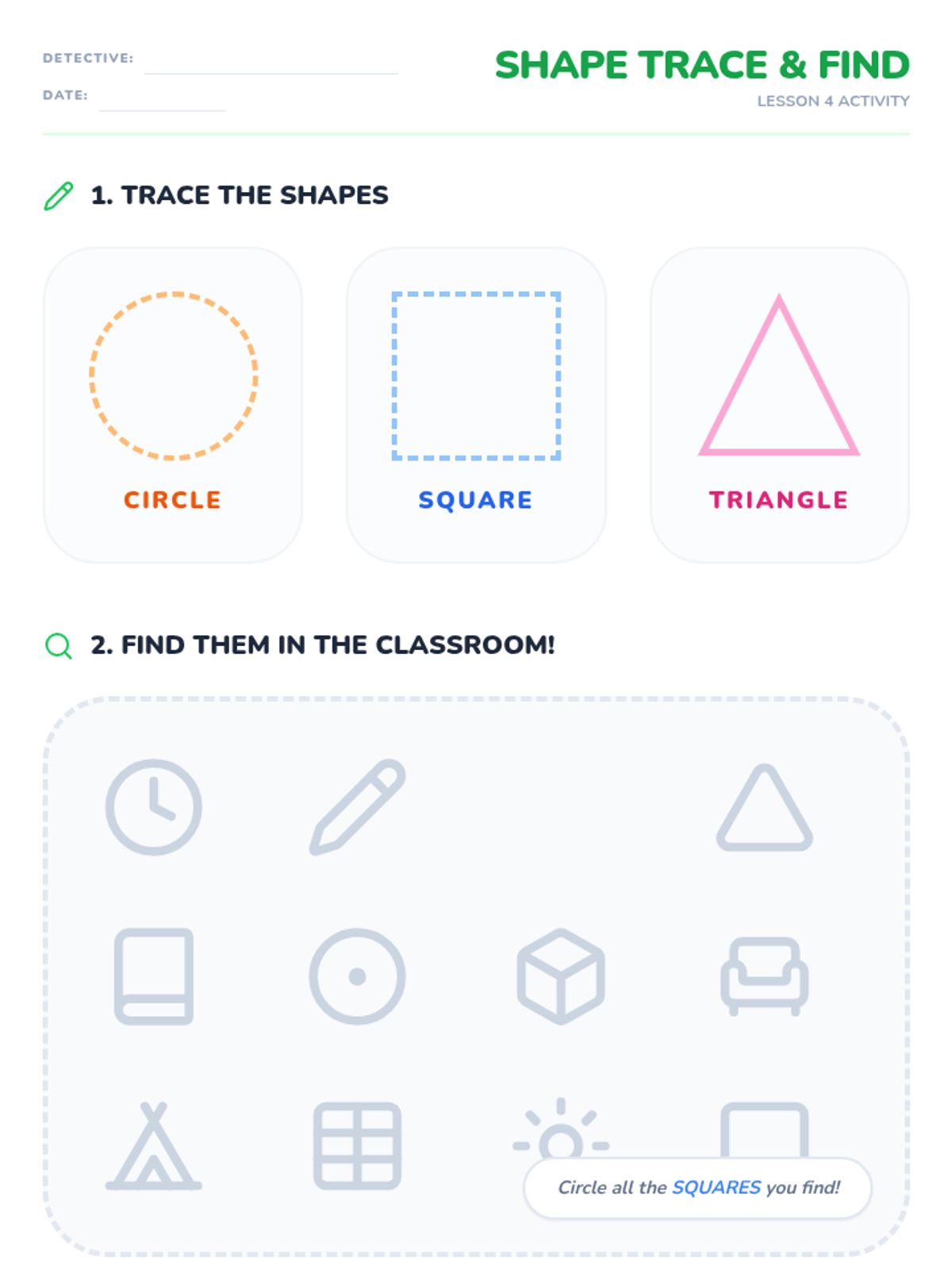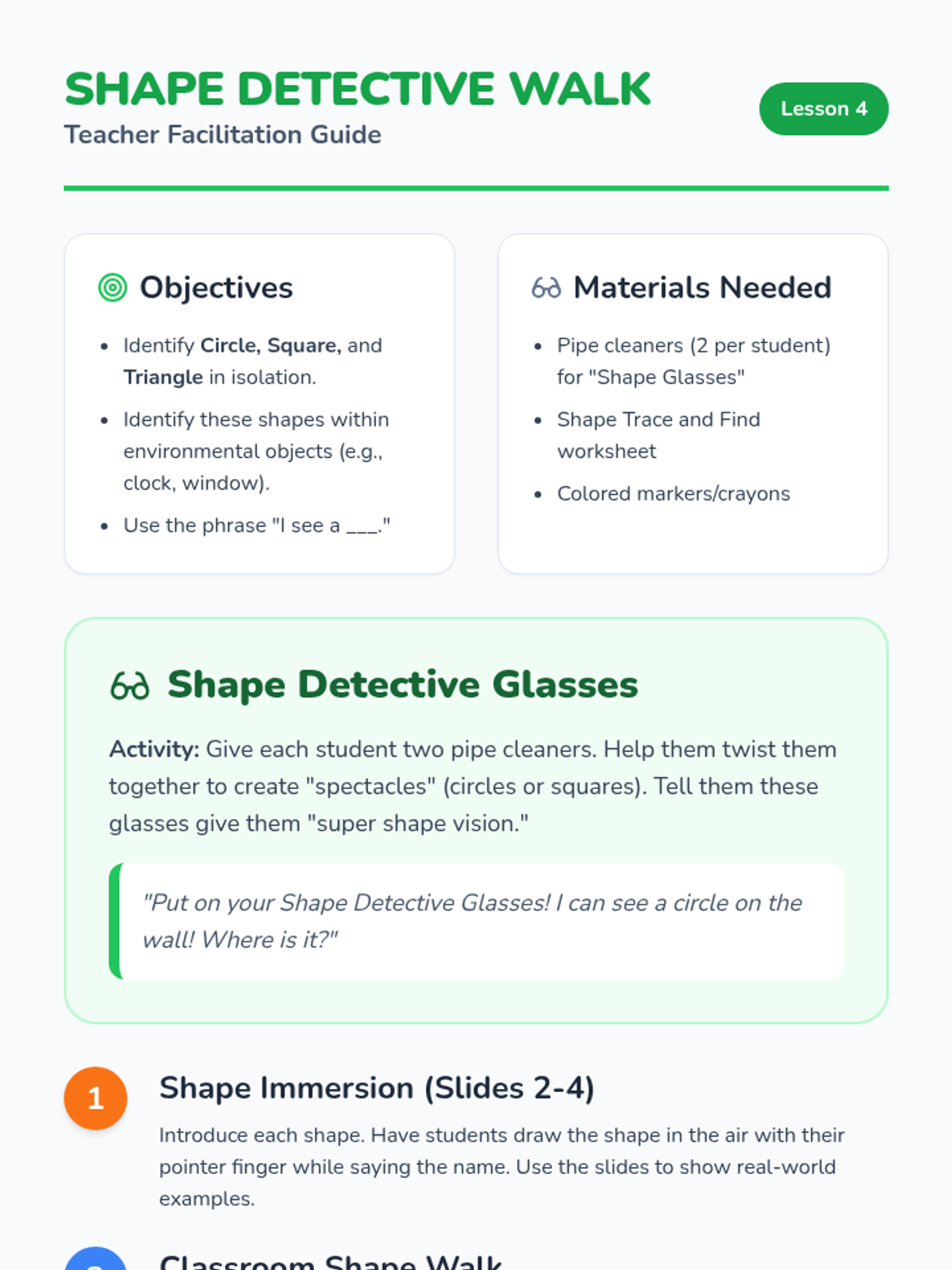 This lesson introduces circle, square, and triangle shapes, connecting them to classroom objects via a 'Shape Walk' with detective glasses.