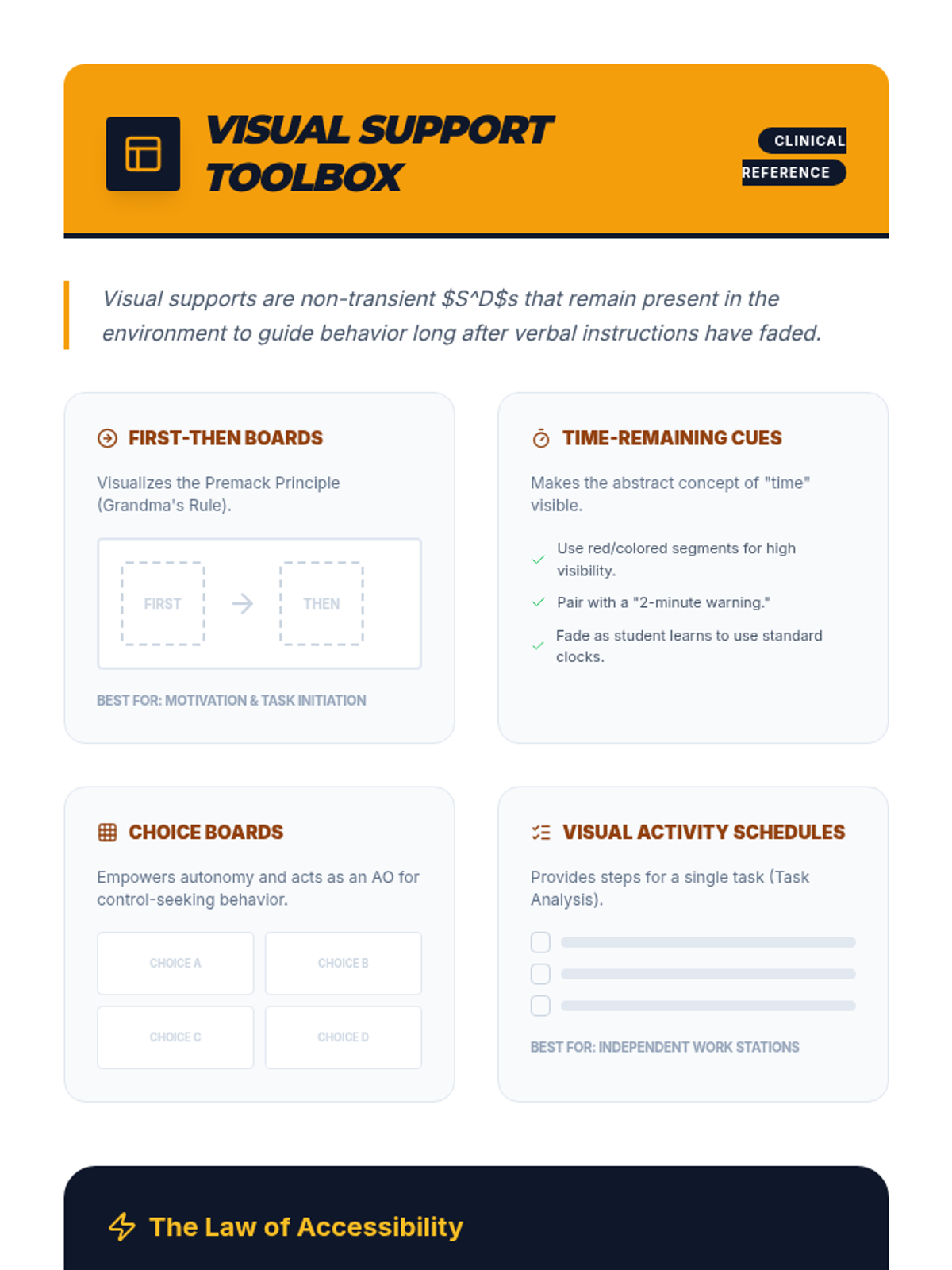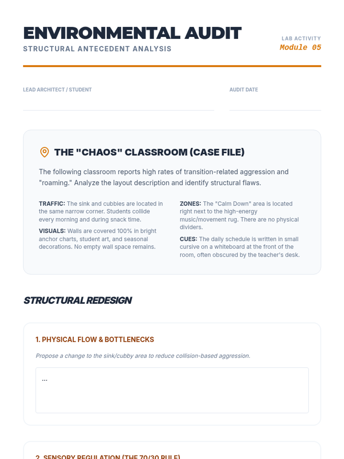Designing visual schedules, environmental cues, and physical arrangements to support executive functioning and reduce transition-related problem behaviors.