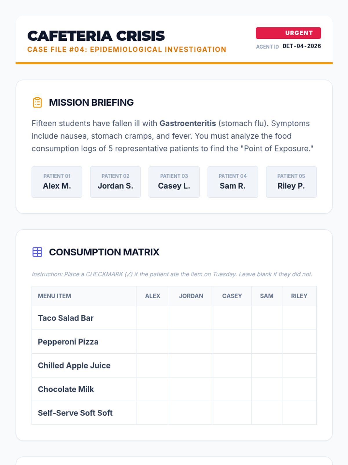 Students analyze historical outbreak data and solve a fictional school-based case study to understand epidemiological patterns and public health responses.