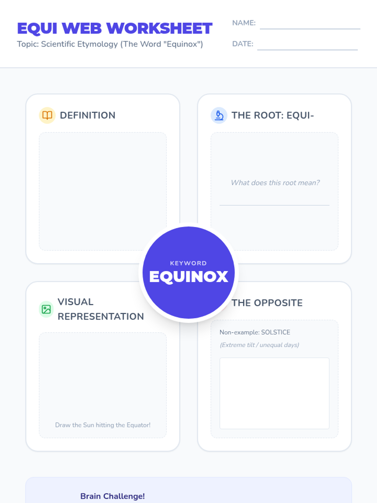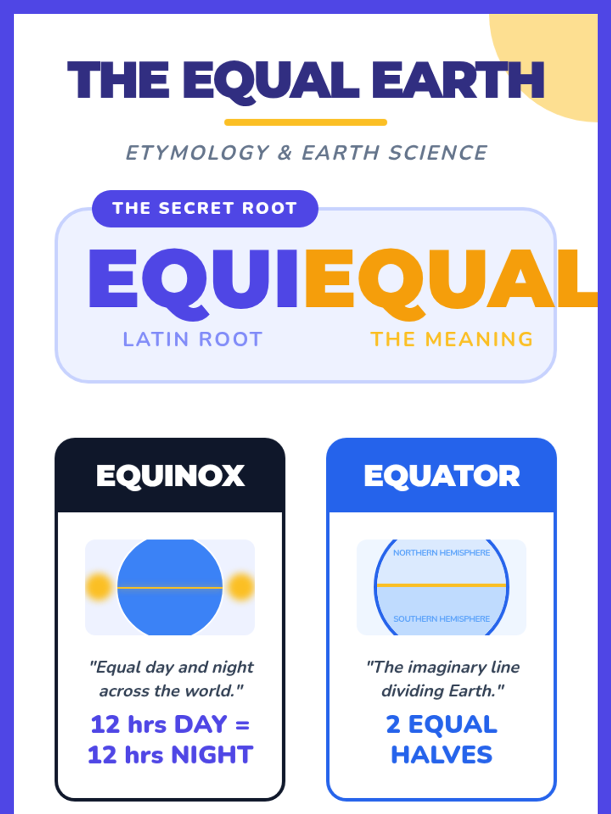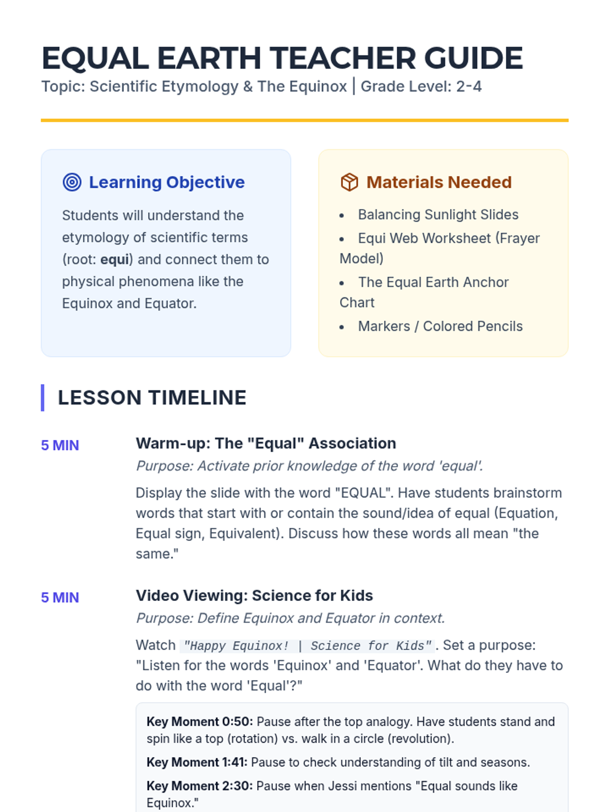 A science and language arts integrated lesson where students explore the Latin root 'equi' to understand the Earth's equinox and equator. Students will use the 'Happy Equinox!' video to define key terms and create vocabulary webs.