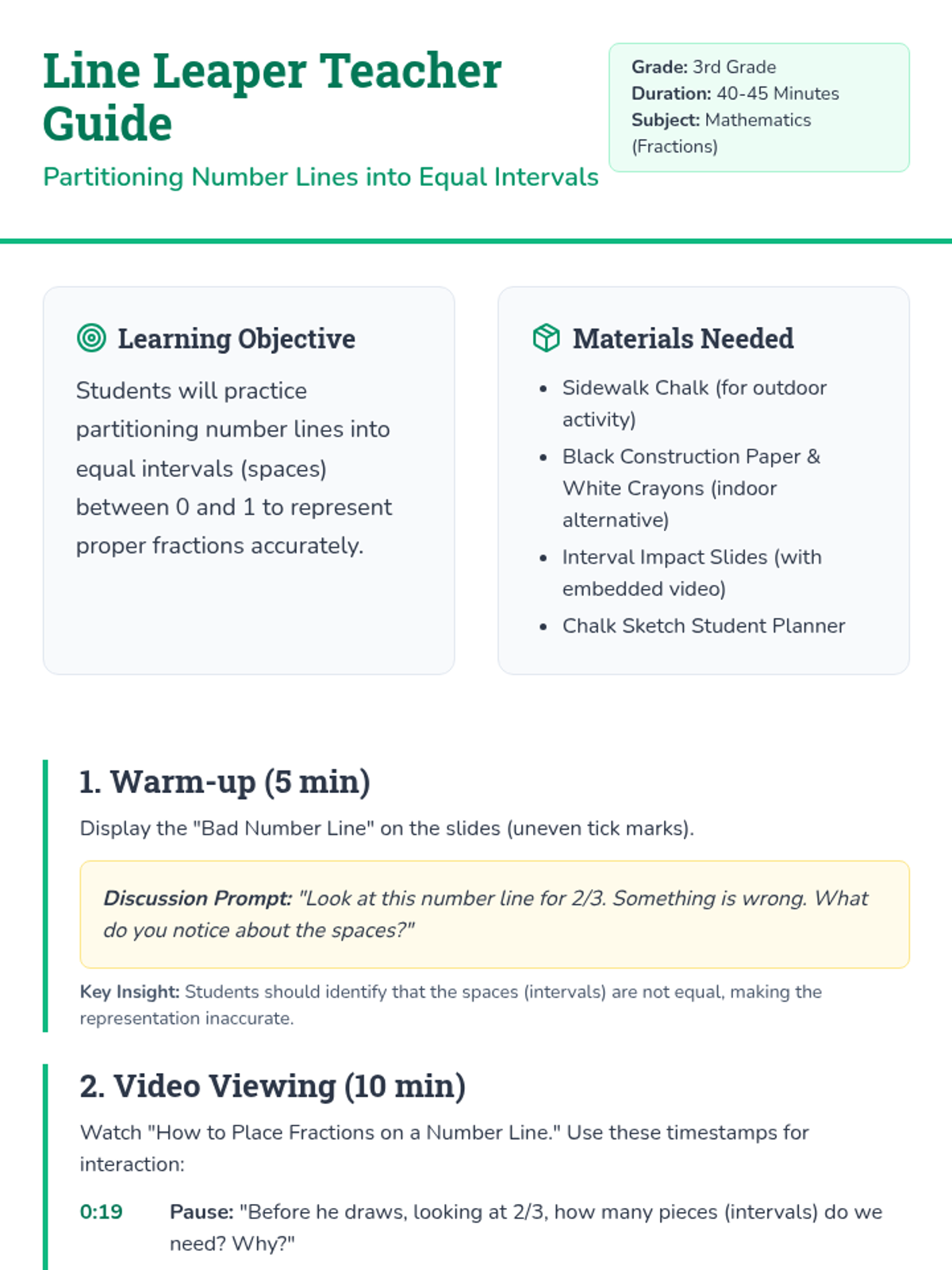 Students learn to partition number lines into equal intervals by analyzing a video and creating large-scale number lines using sidewalk chalk or black paper. This hands-on lesson emphasizes counting spaces rather than tick marks.