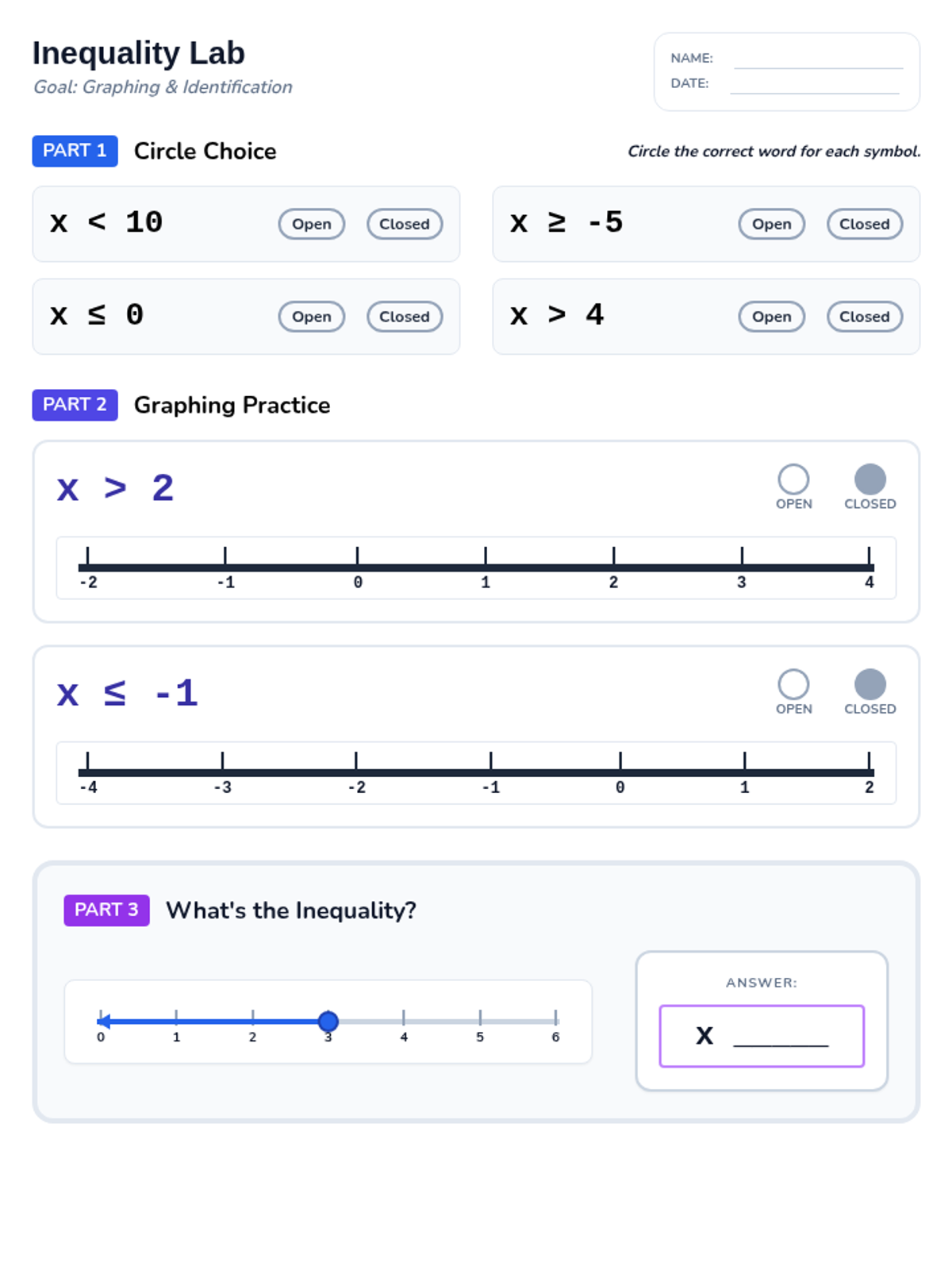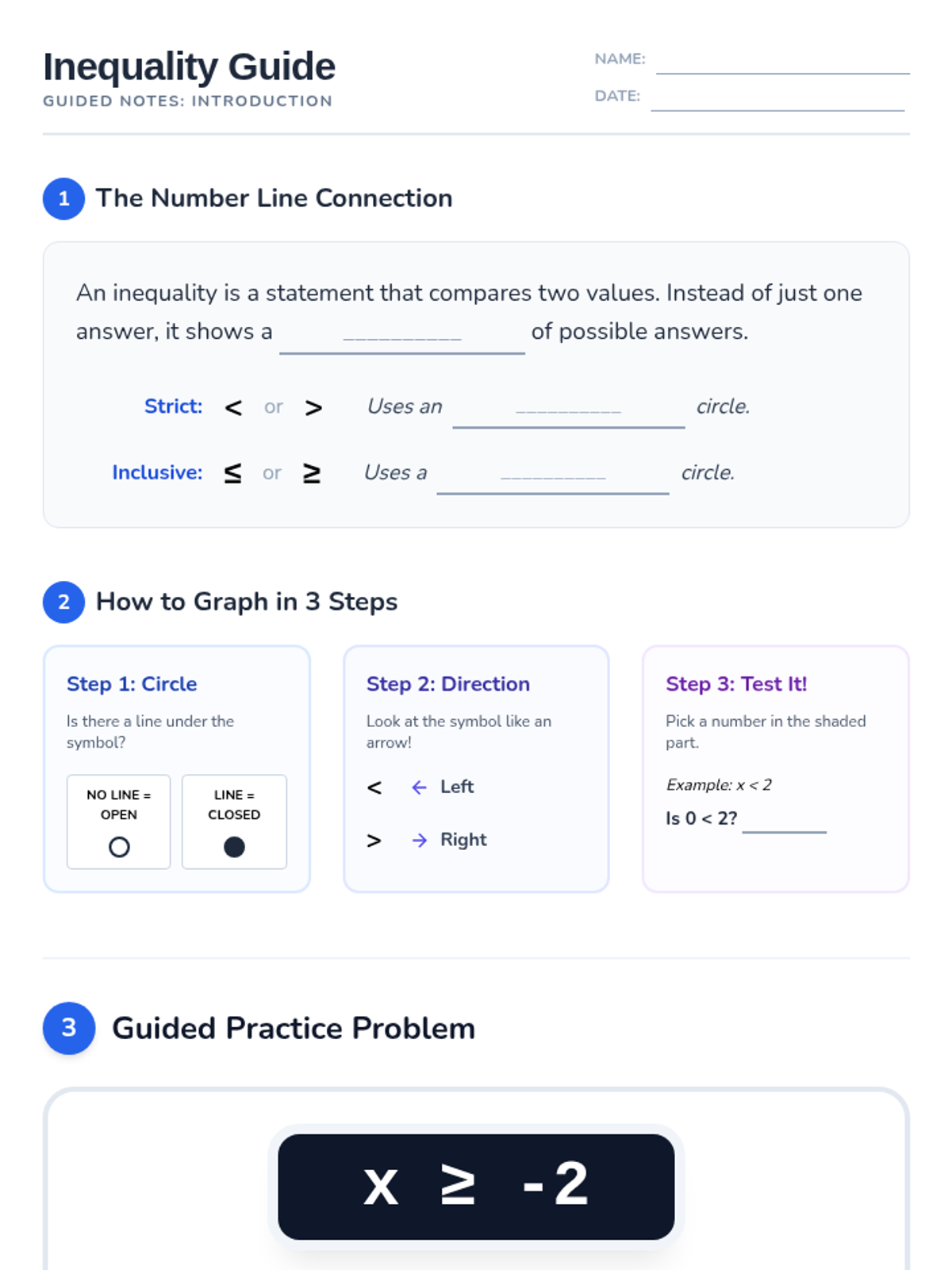 A comprehensive set of resources for IEP students to master graphing simple inequalities, featuring visual scaffolds, step-by-step guided notes, and a scaffolded practice worksheet.
