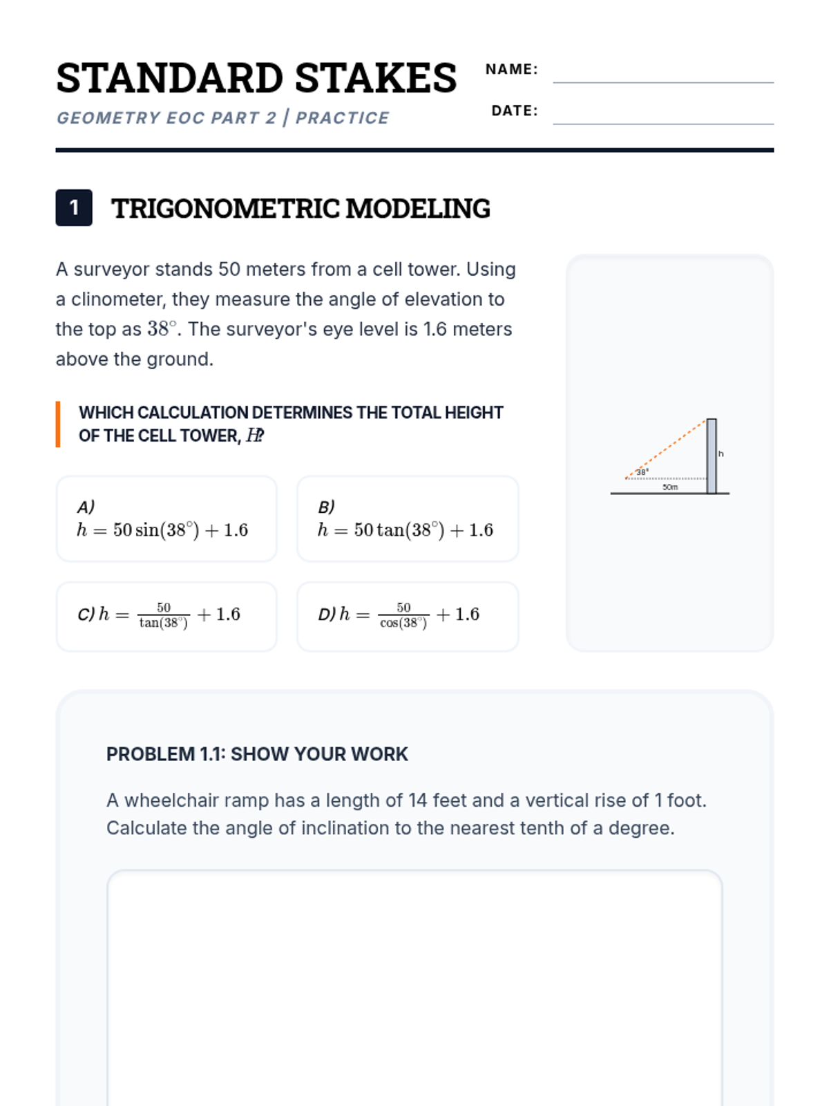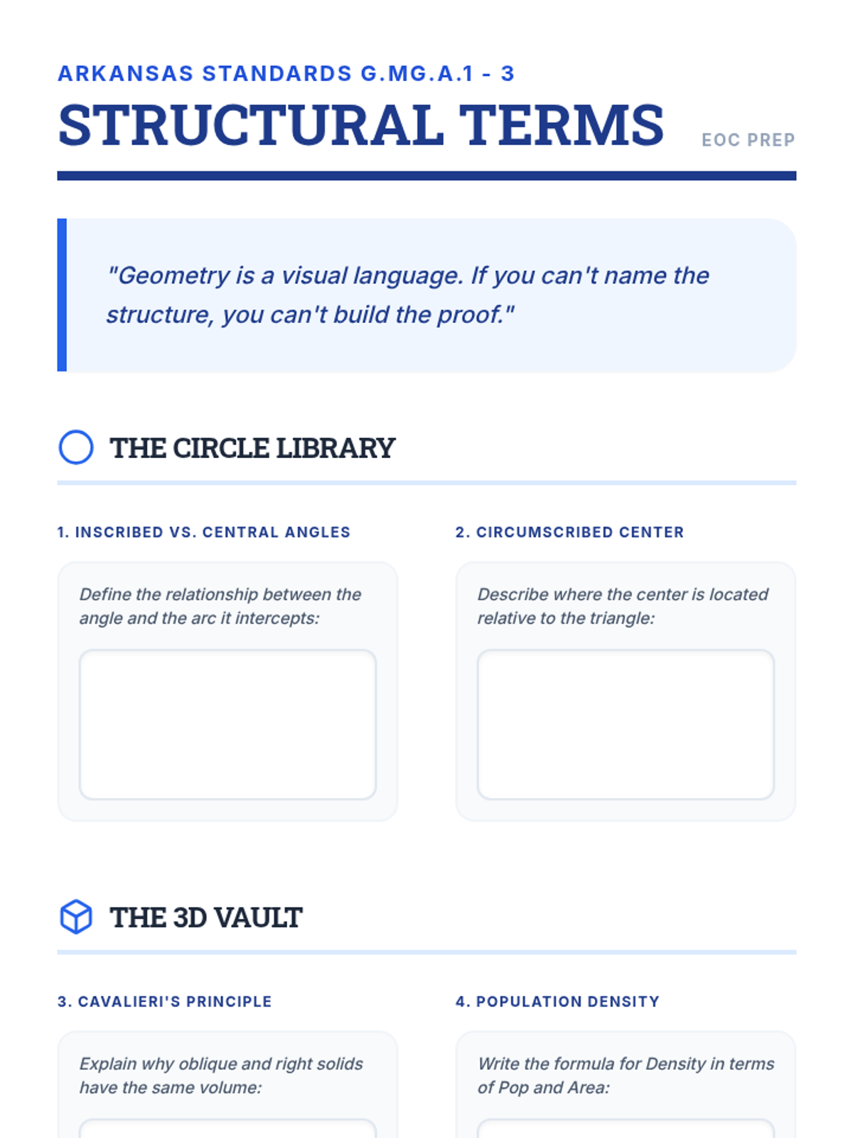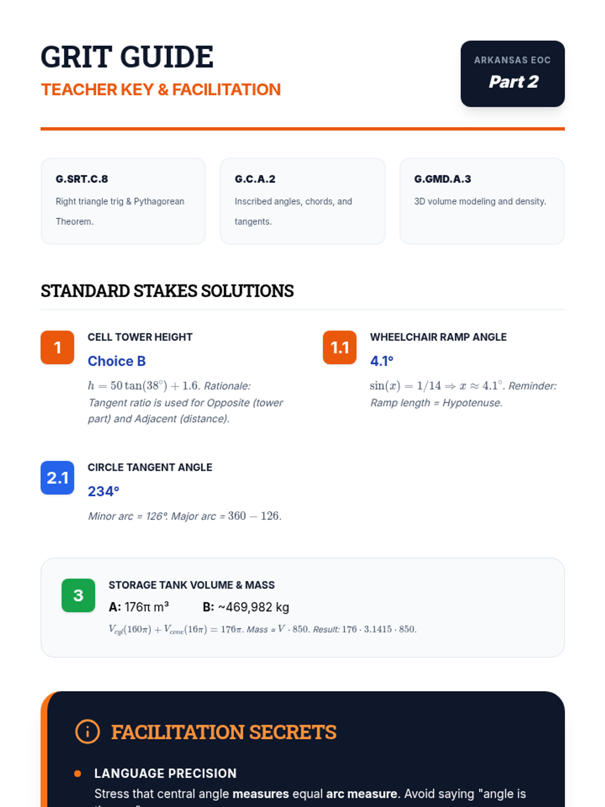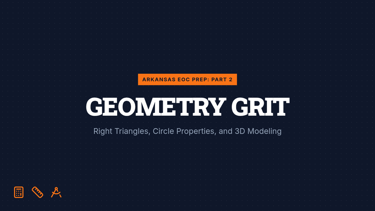 A high-intensity EOC prep lesson for Arkansas Geometry standards, focusing on trigonometry, circle properties, and 3D geometry through diagram-heavy practice.