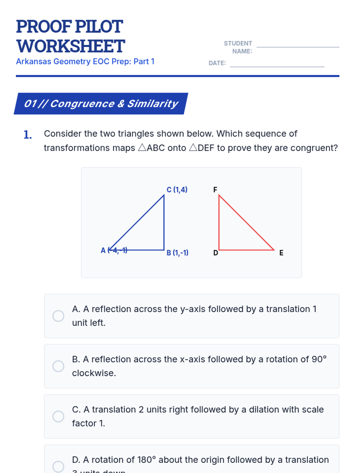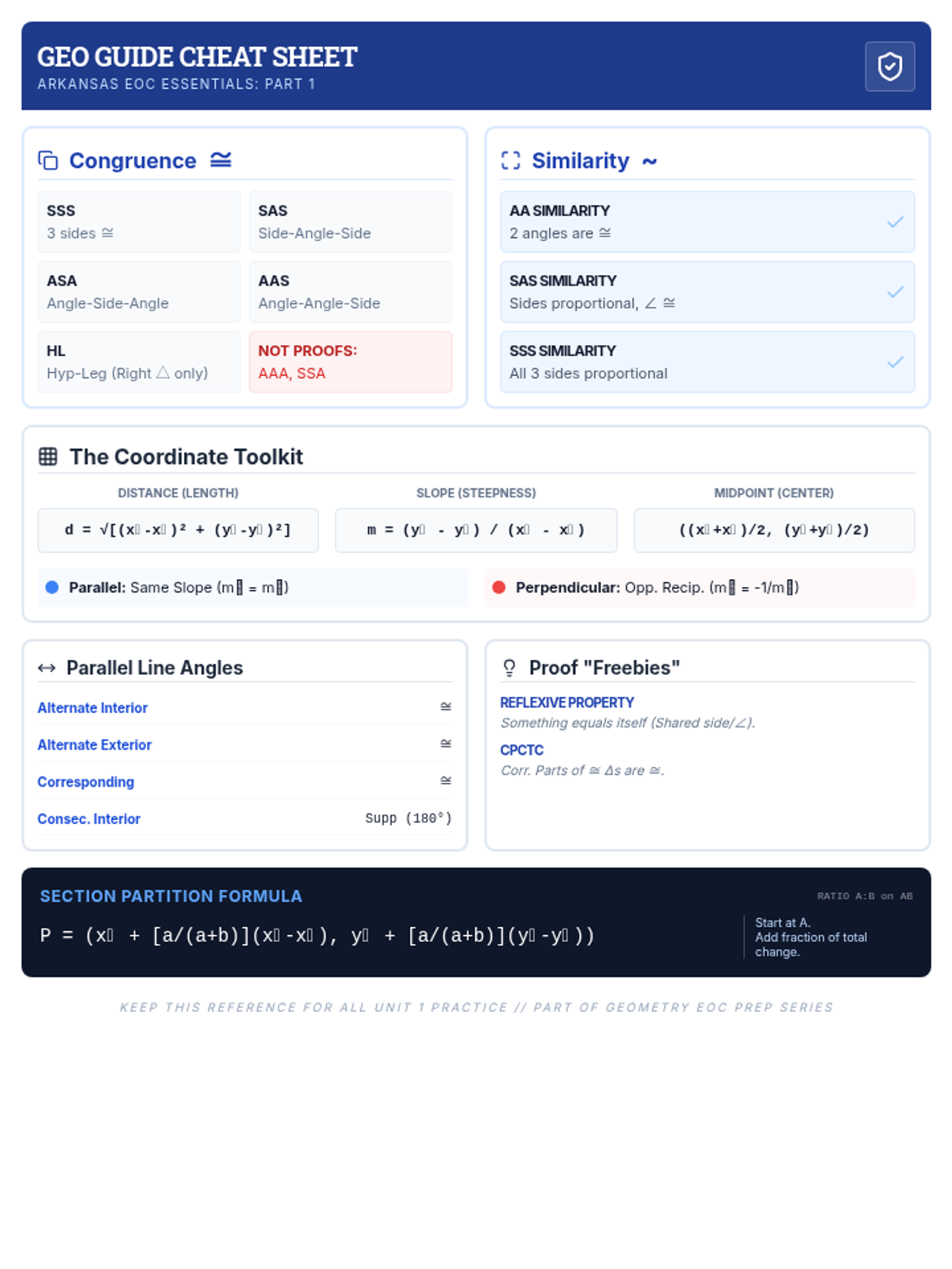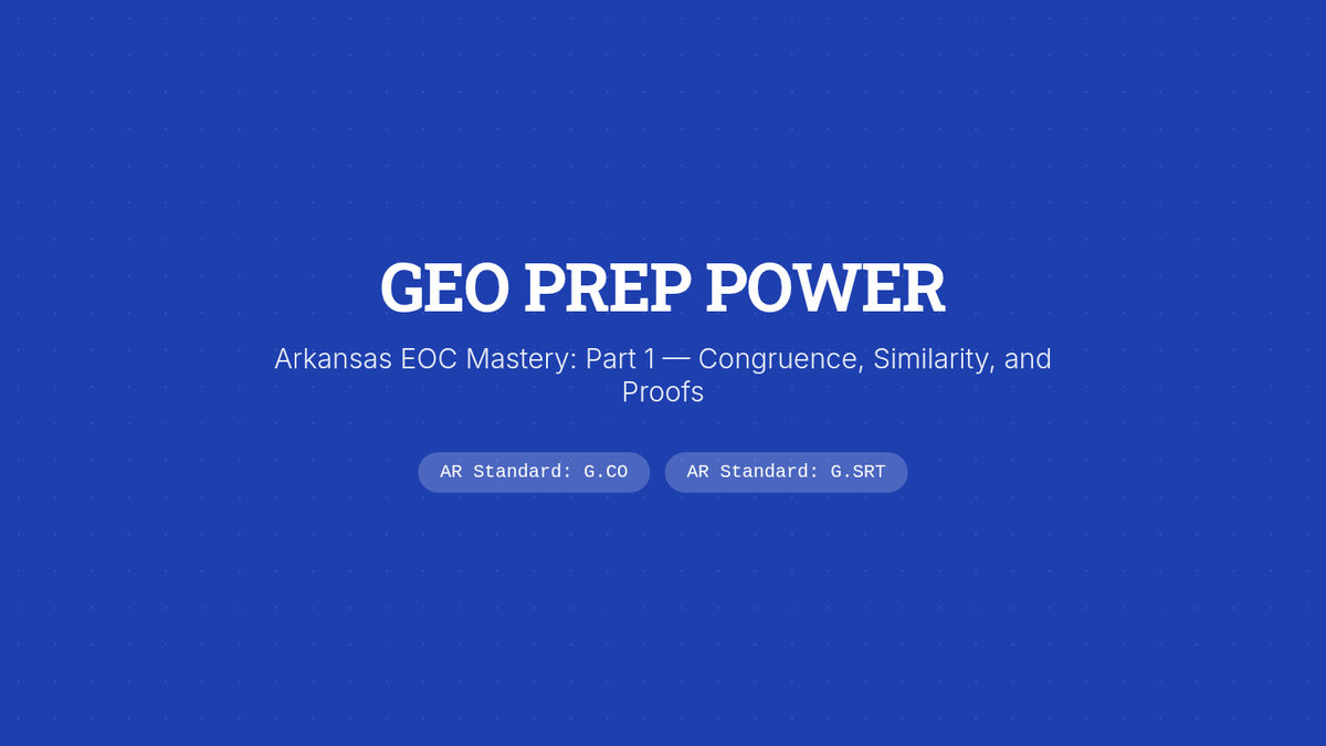 This lesson provides targeted test preparation for the Arkansas Geometry End-of-Course (EOC) exam, focusing on congruence, similarity, proofs, and coordinate geometry through diagram-heavy practice and strategic review.