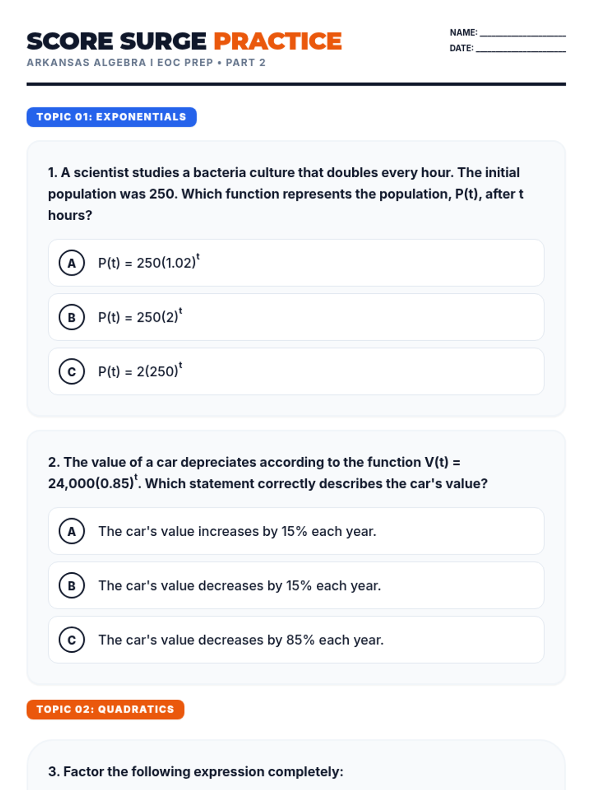 The first part of a comprehensive Algebra I EOC prep series focusing on linear foundations, graphing, and systems of equations, aligned to Arkansas ATLAS standards. Students practice through real-world scenarios and test-style questions designed for 8th and 9th graders.
