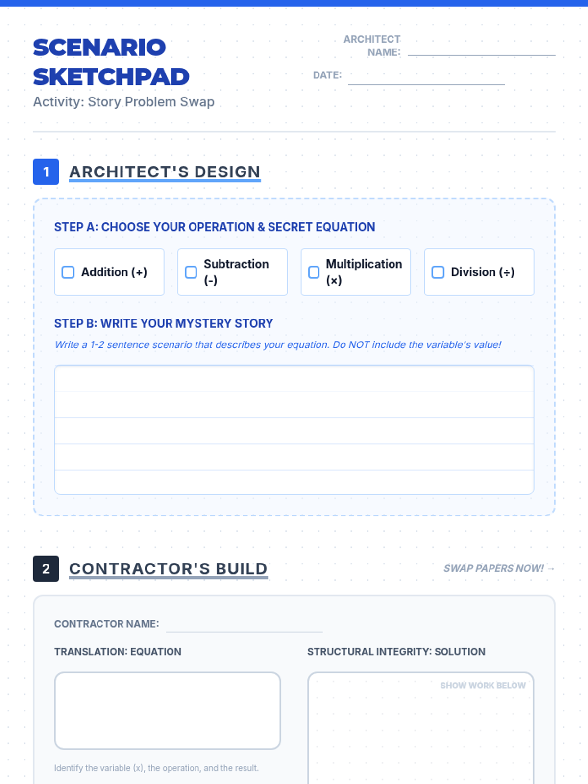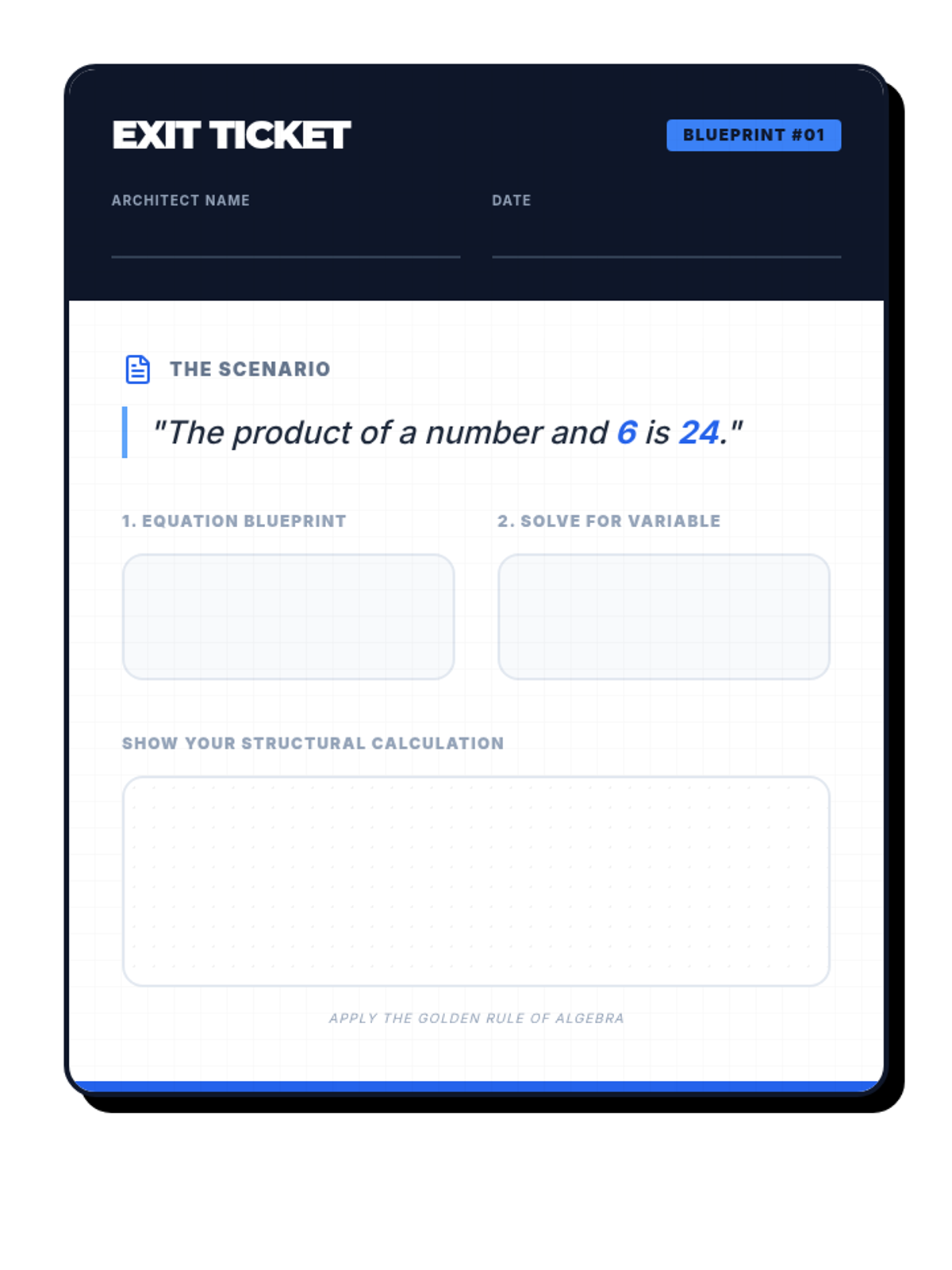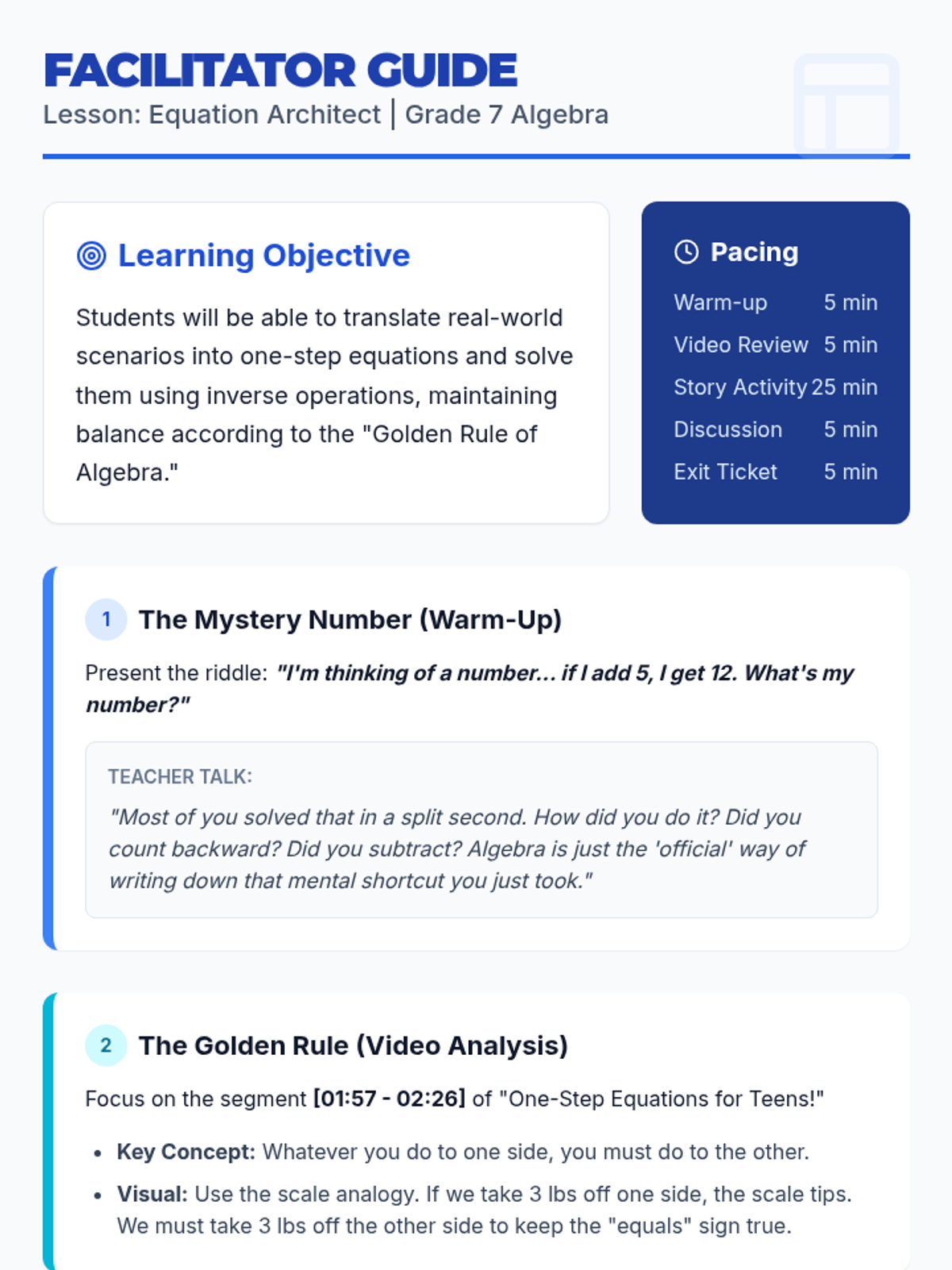 Students learn to translate real-world scenarios into one-step equations using the 'Golden Rule of Algebra' (keeping the balance). The lesson includes a warm-up, video analysis, a collaborative story-writing activity, and an exit ticket.