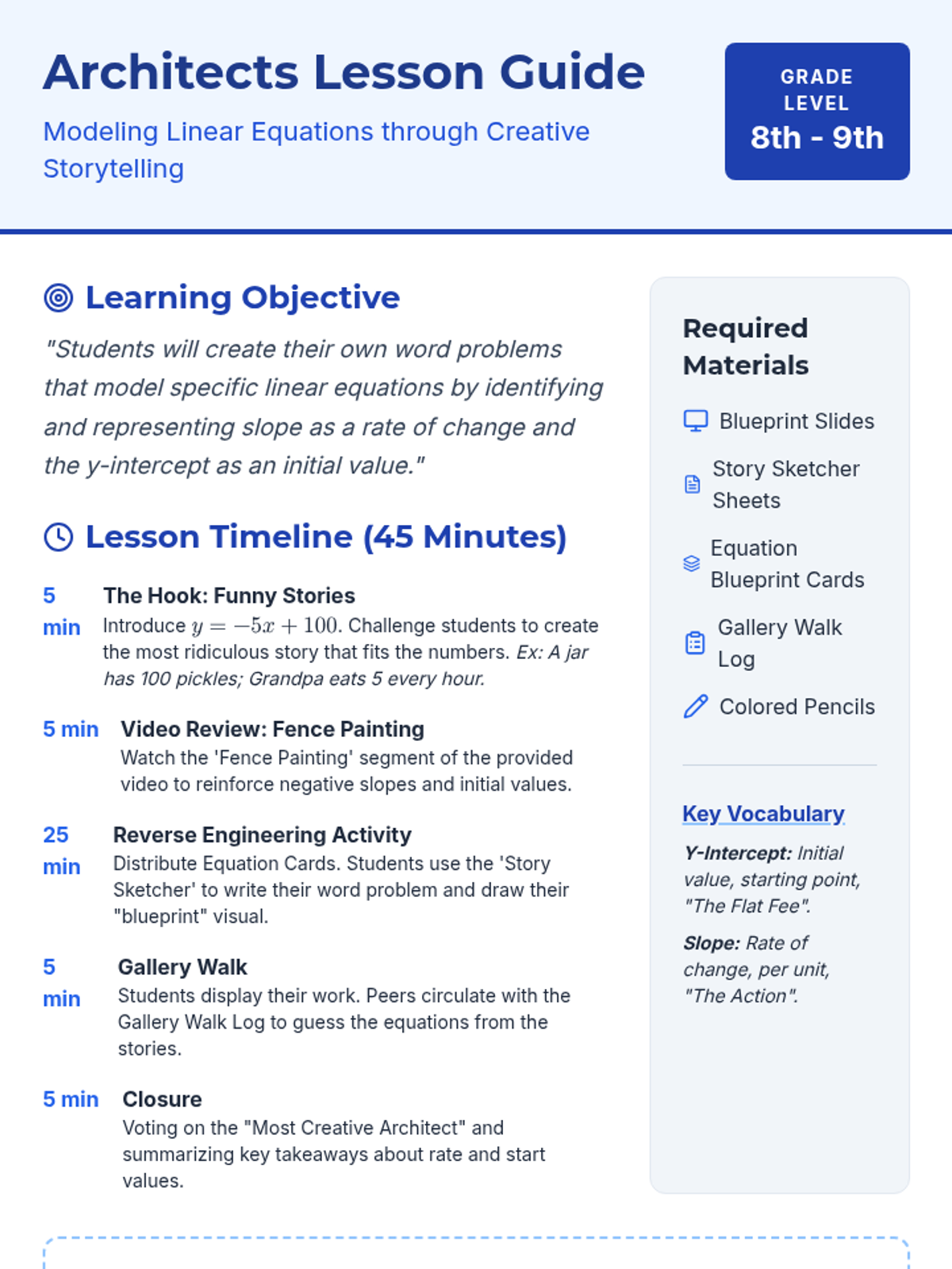 Students step into the role of 'Equation Architects' to reverse-engineer linear equations. They will transform abstract algebra into creative stories and visual blueprints, then test their peers' decoding skills in a gallery walk.