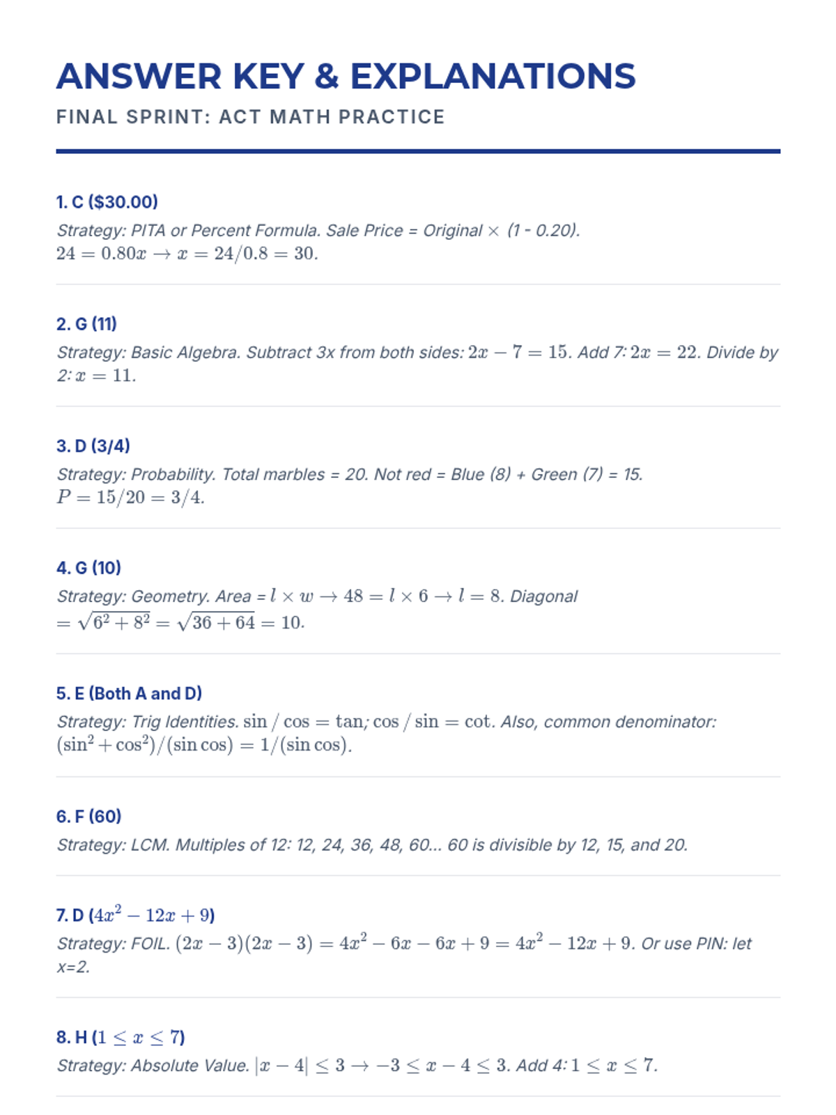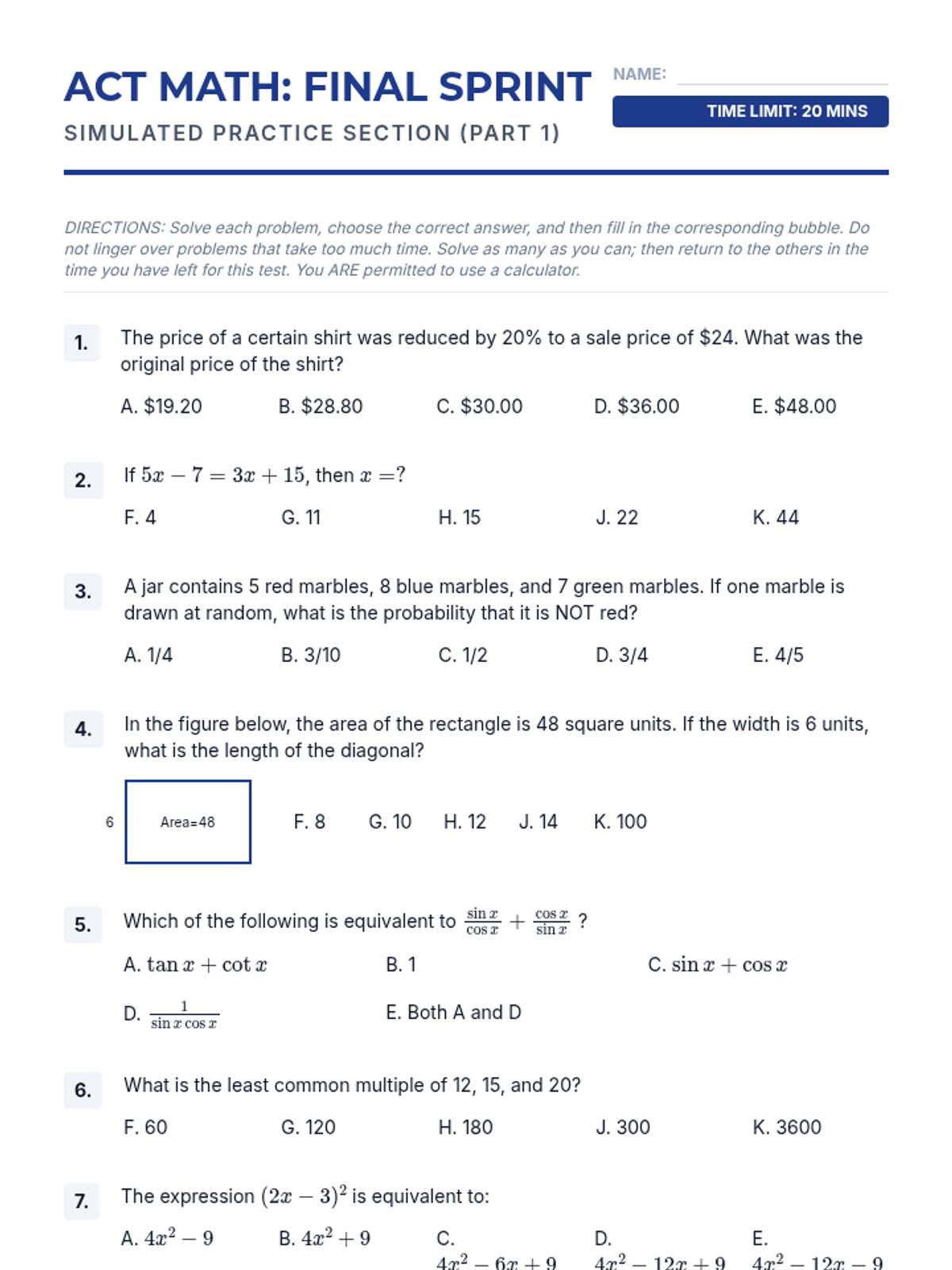 Apply strategies and knowledge in a timed practice environment with a representative ACT Math question set.