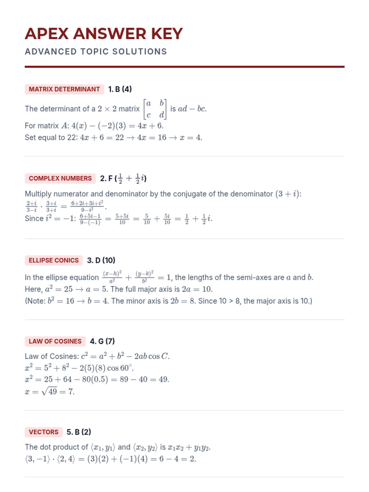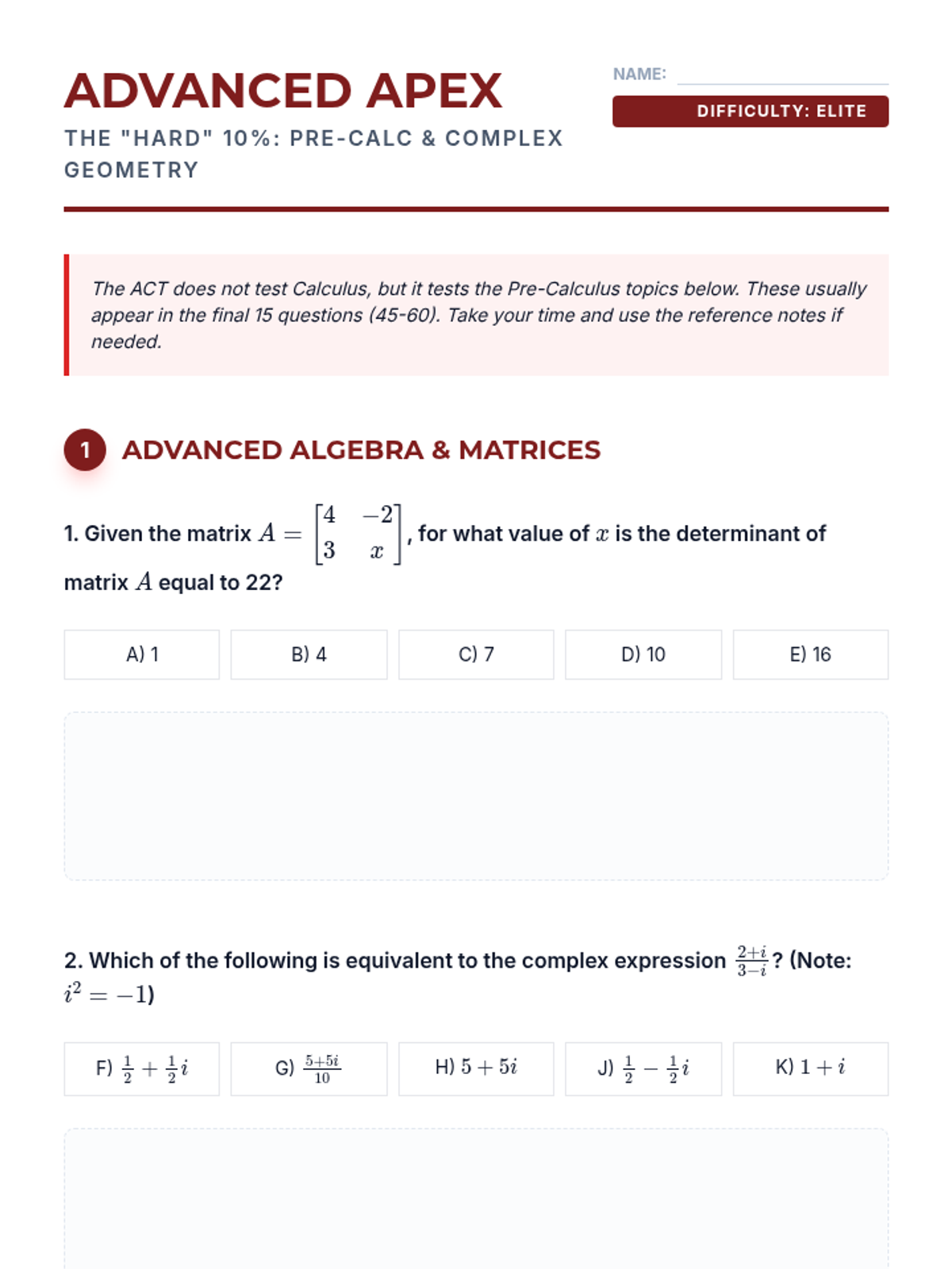 Master the most challenging topics on the ACT, including Pre-Calculus concepts (matrices, vectors, complex numbers) and high-difficulty Geometry (Law of Sines/Cosines, ellipses).