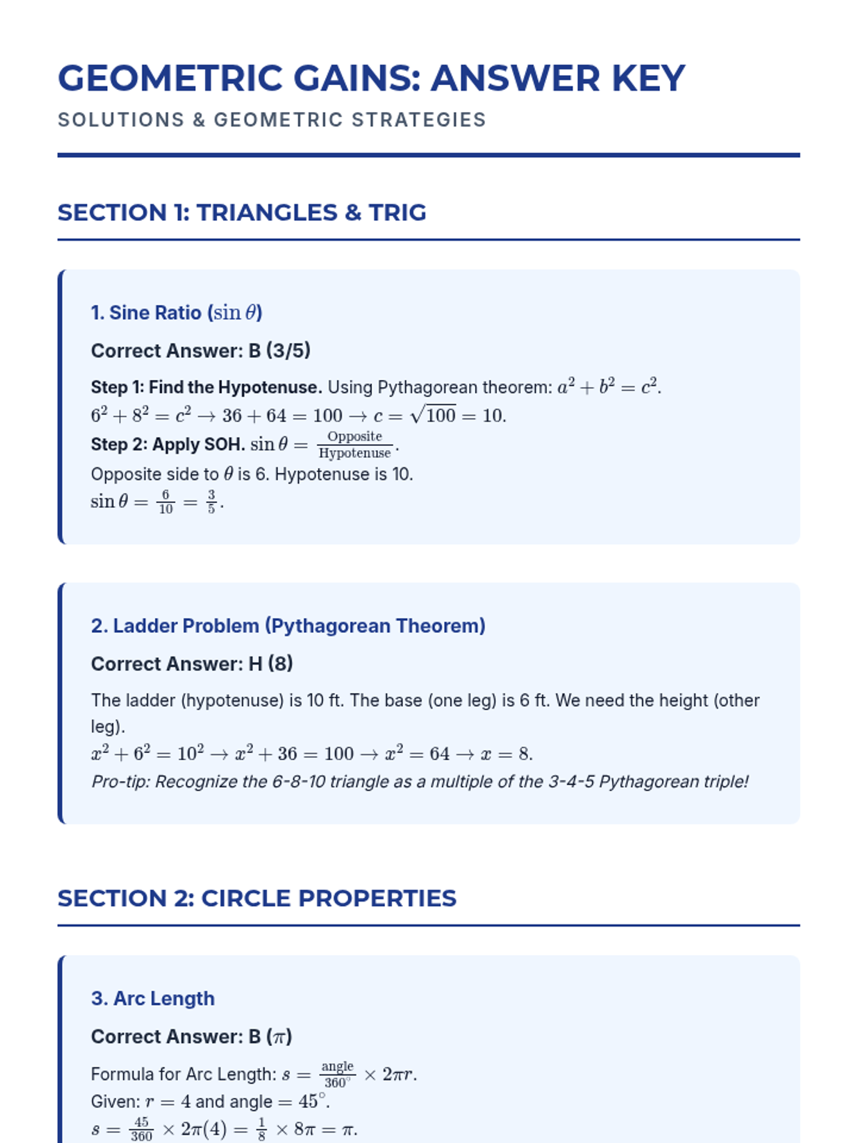 Review critical Geometry and Trigonometry concepts, from SOH CAH TOA to circle properties and coordinate geometry.