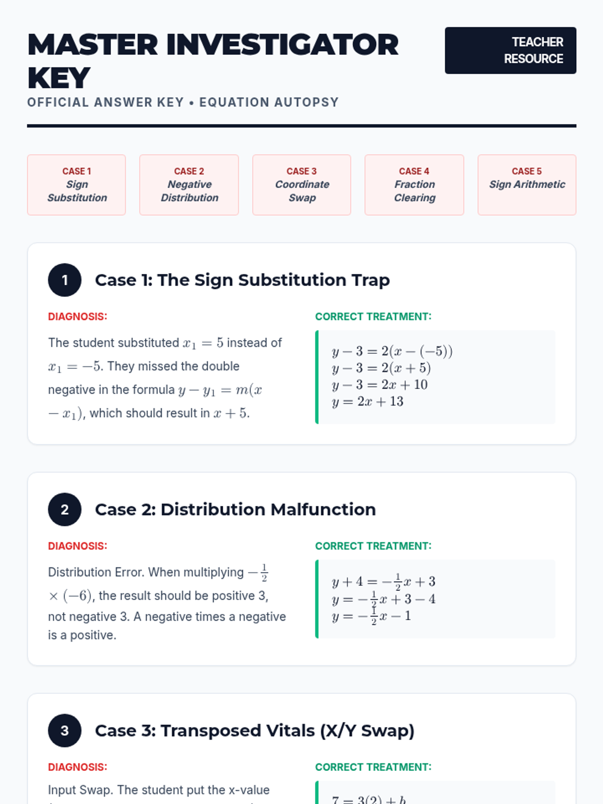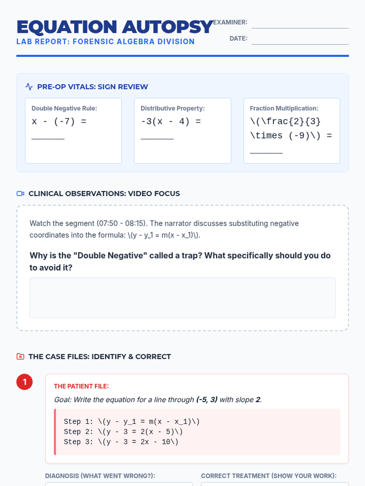 A lesson where students diagnose and correct common algebraic mistakes in linear equations, focusing on sign errors and distribution.