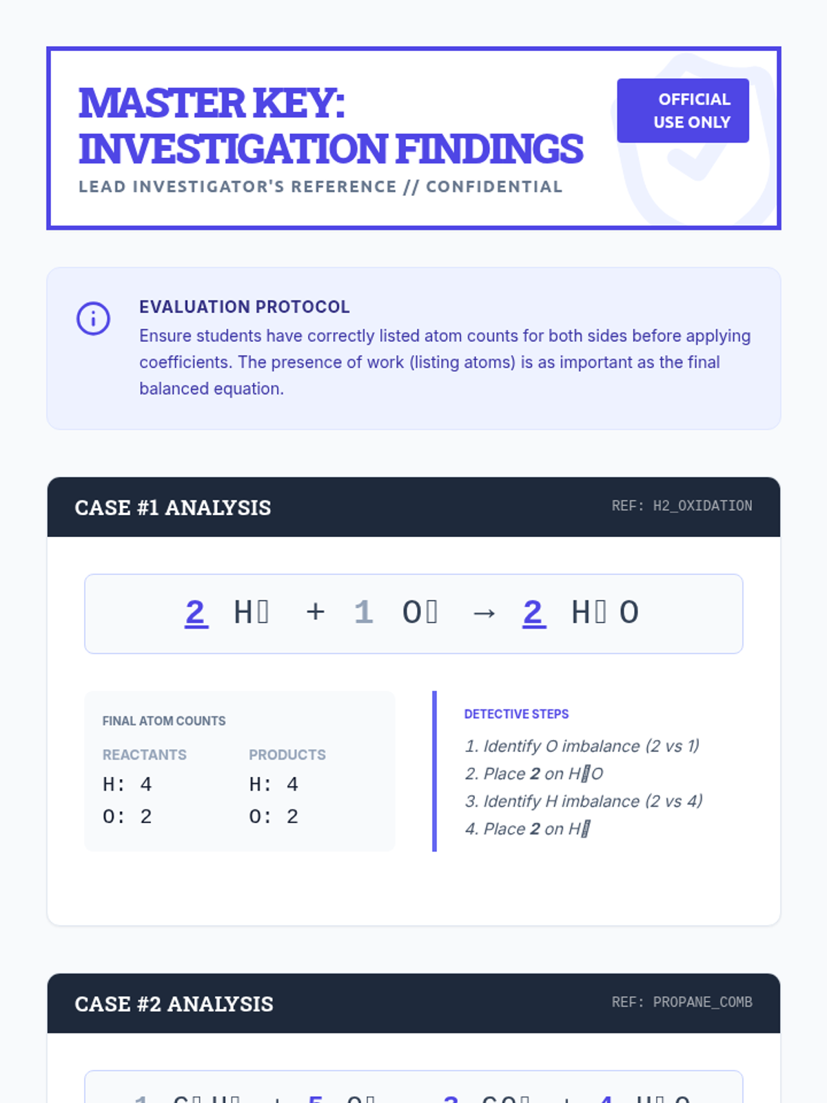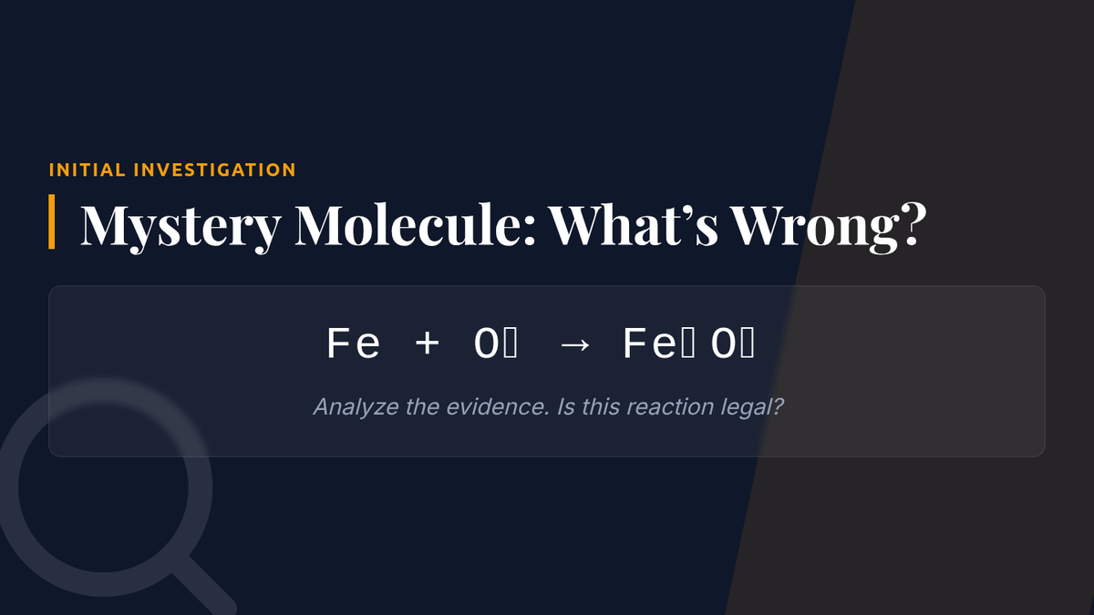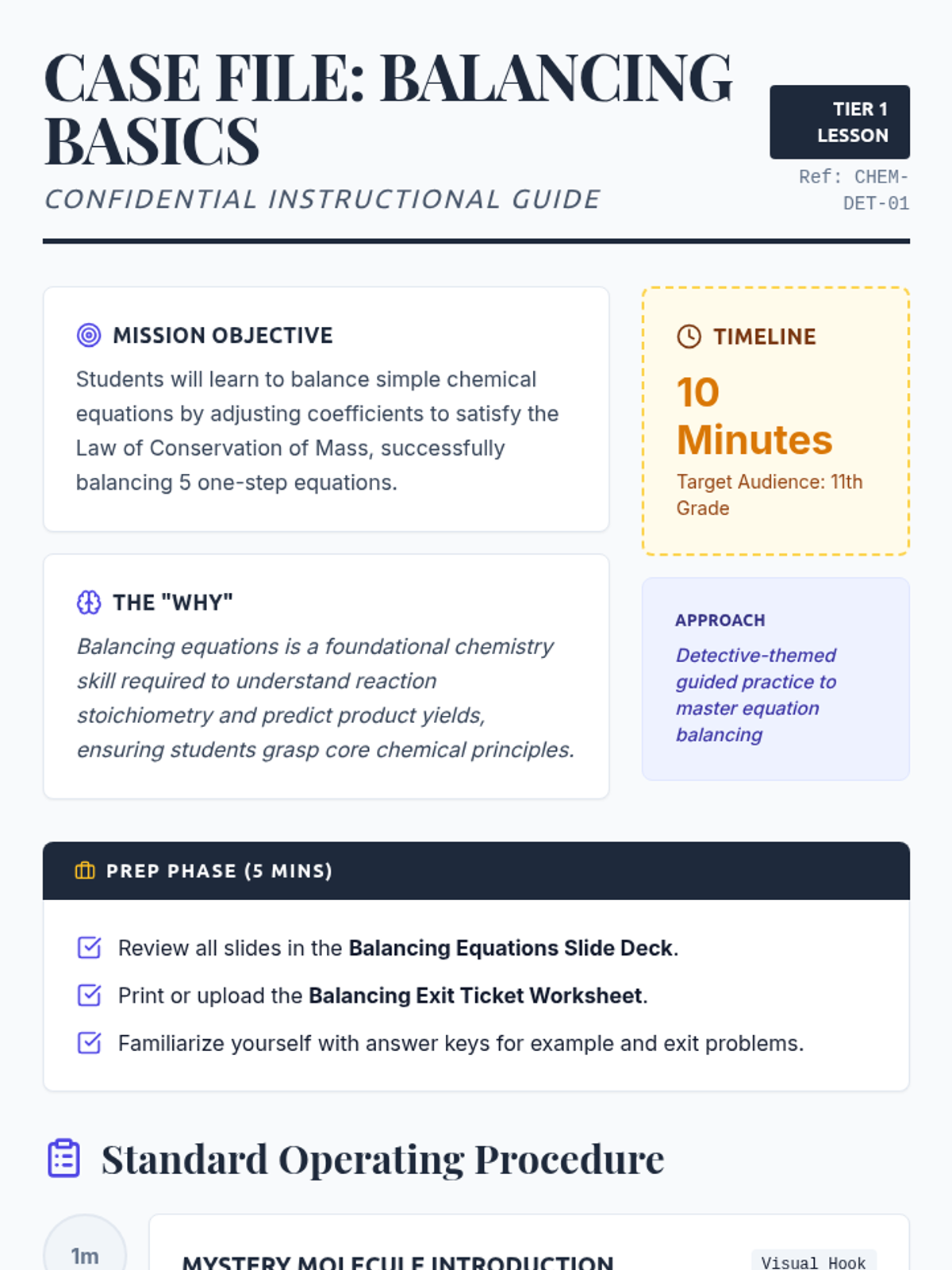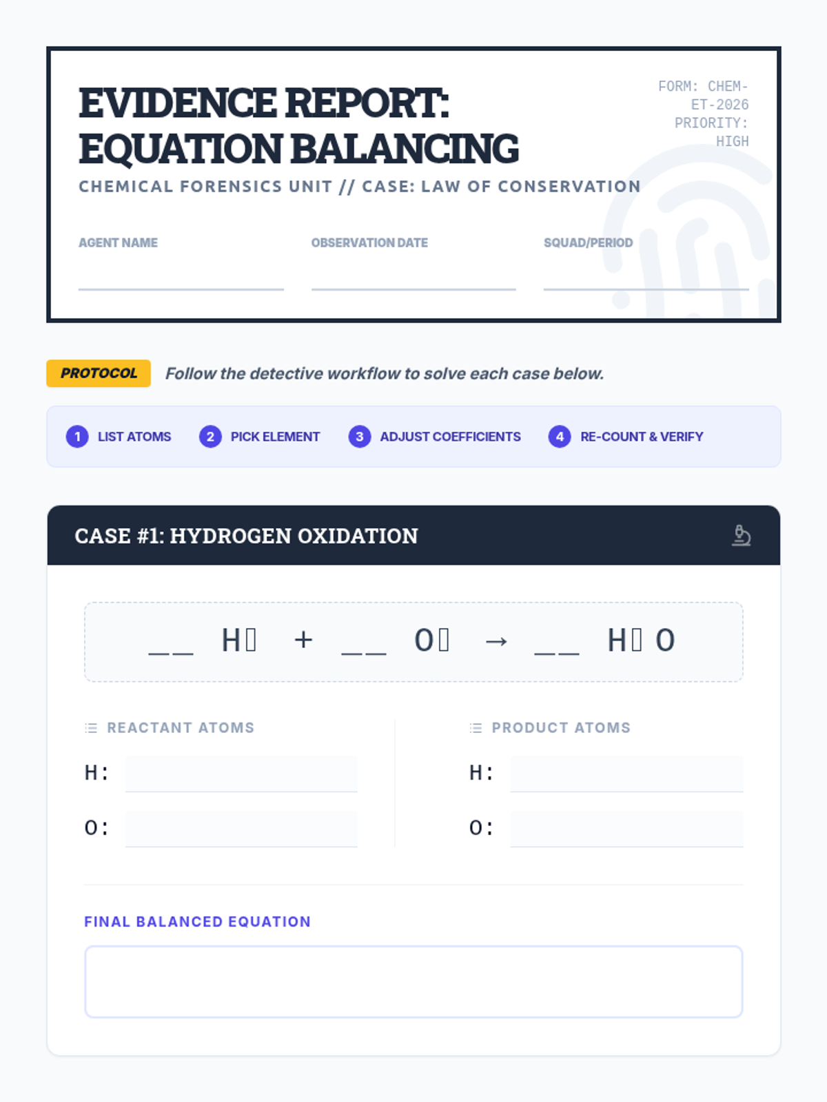 A concise 10-minute chemistry lesson where 11th graders use a detective-themed approach to master balancing chemical equations using the Law of Conservation of Mass.