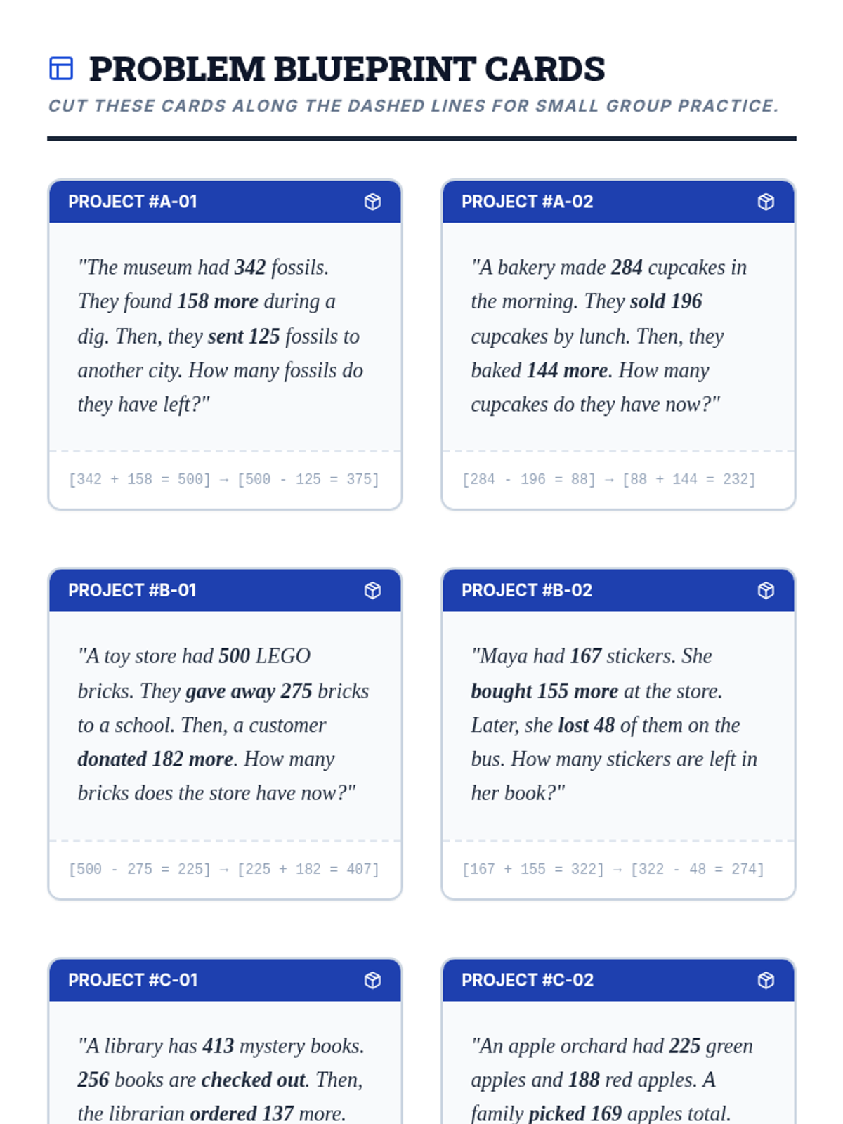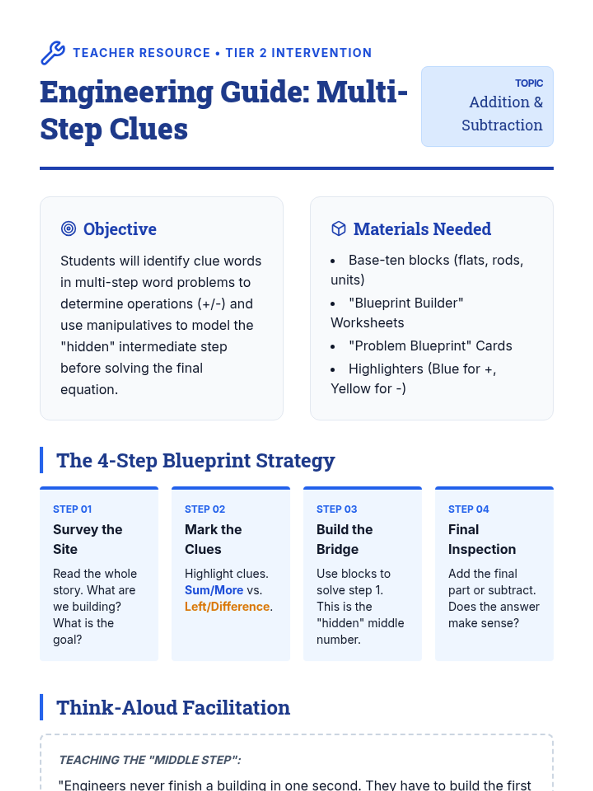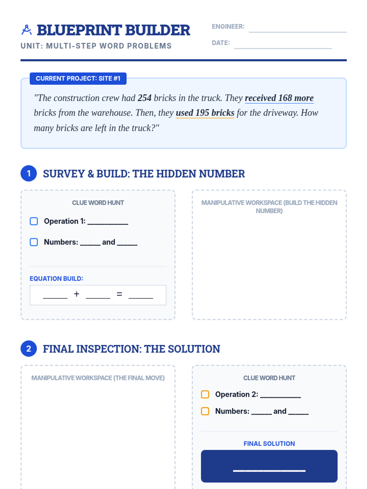 A Tier 2 intervention lesson designed to help students bridge the gap between word problem clues and multi-step equations using a 'Blueprint' engineering theme. Students use manipulatives to model the 'building' of equations through addition and subtraction with regrouping.
