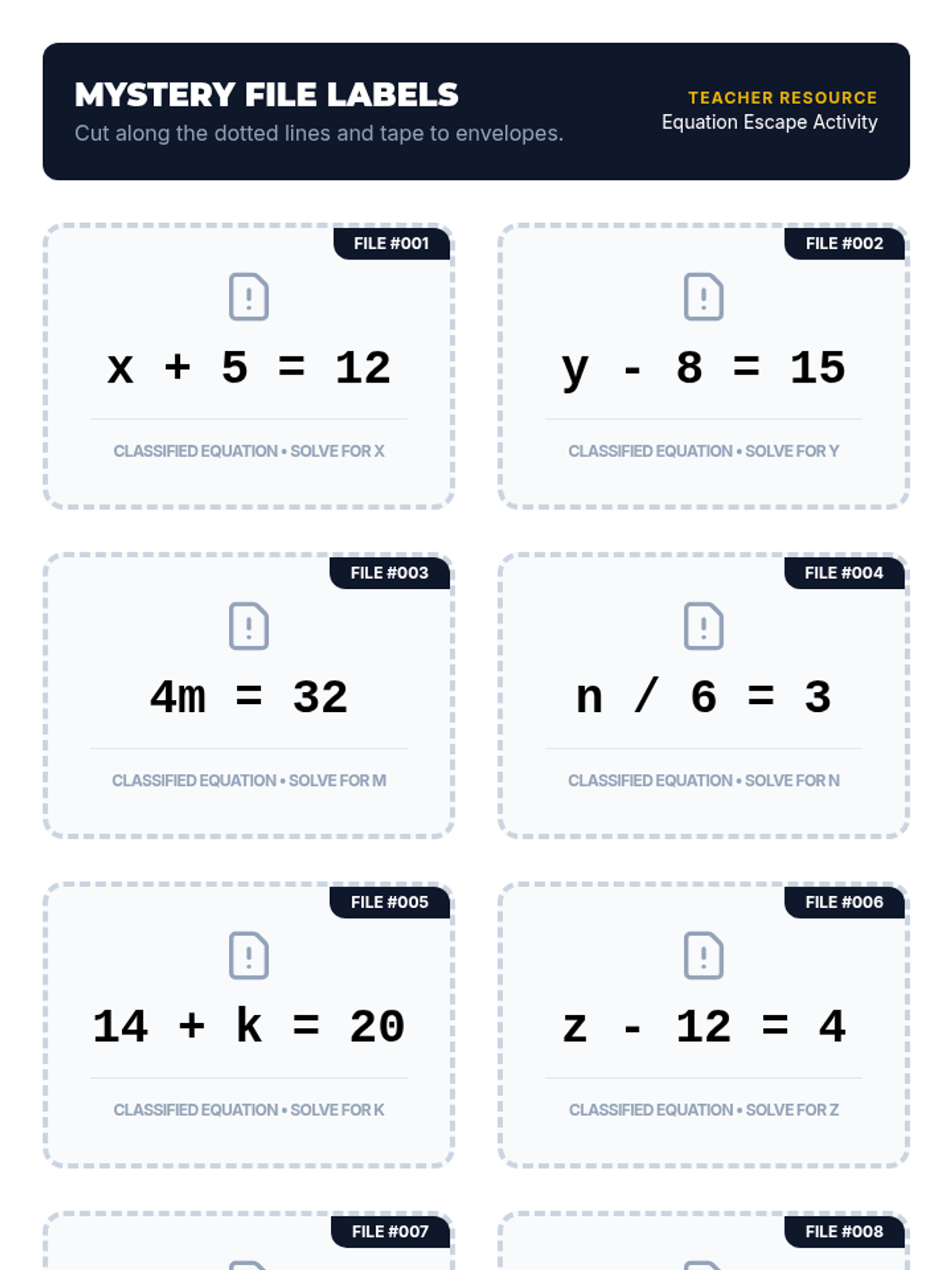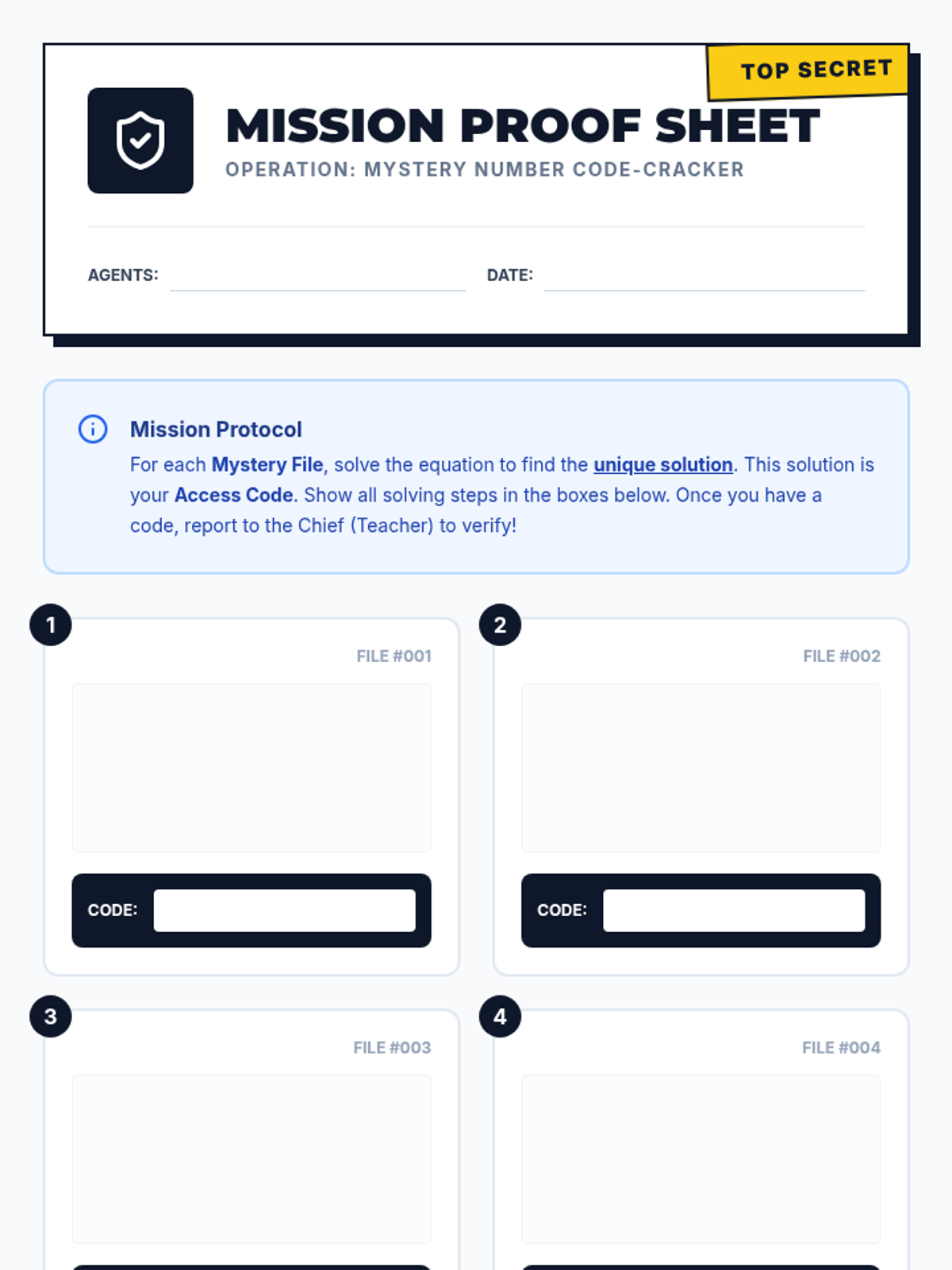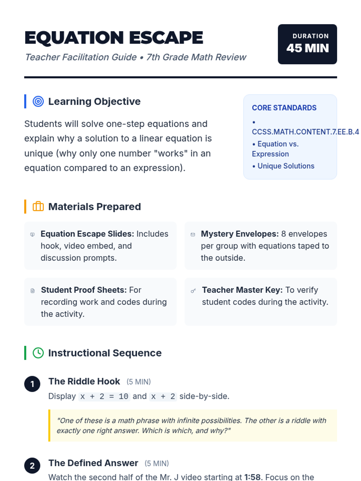 A 7th-grade review lesson on one-step equations and expressions, focusing on the uniqueness of solutions. Students will distinguish between math 'phrases' and 'sentences' and solve for mystery codes in an engaging group activity.