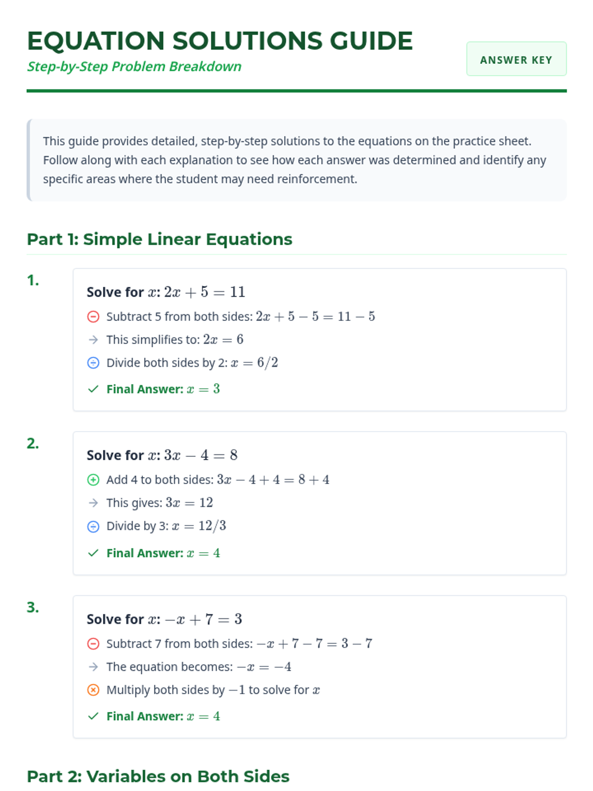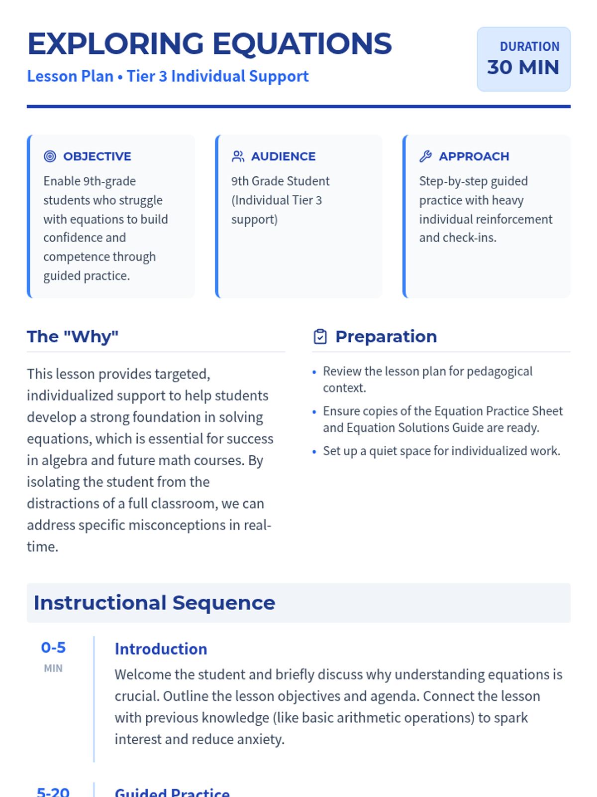 A 30-minute Tier 3 individual support lesson for 9th-grade students struggling with equations. This session provides step-by-step guided practice and personalized support to build confidence in solving linear equations.
