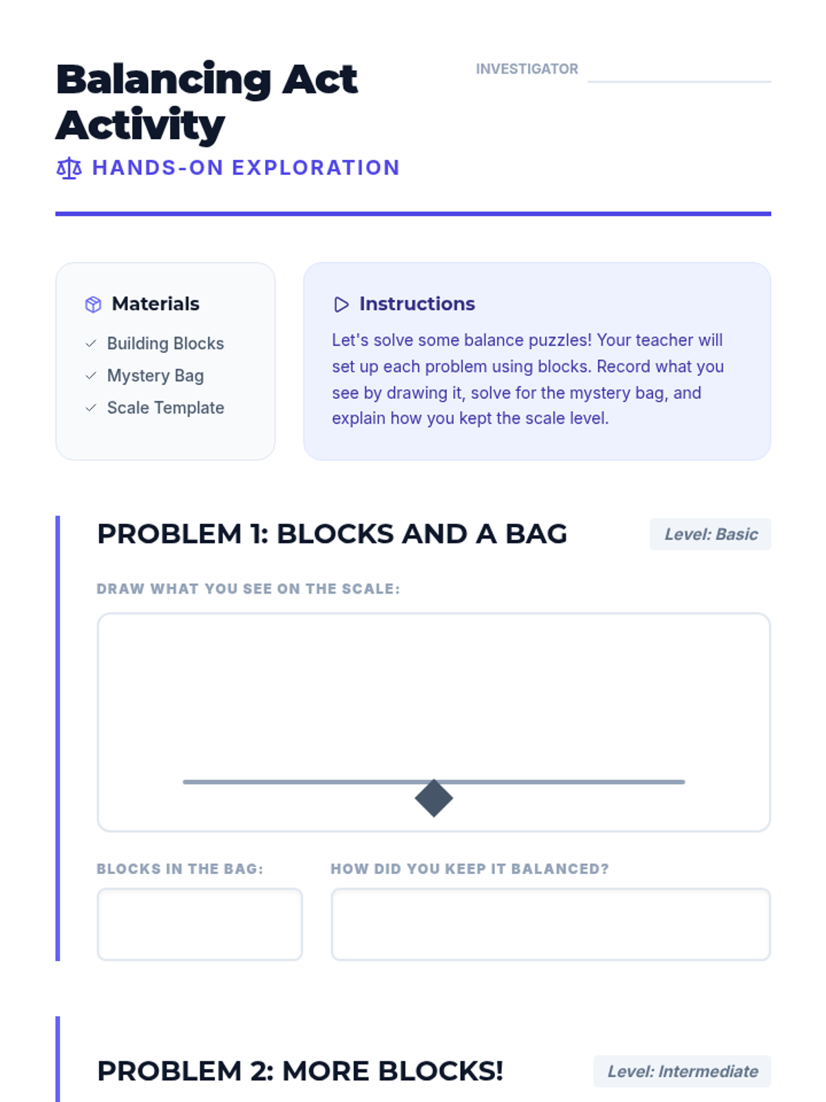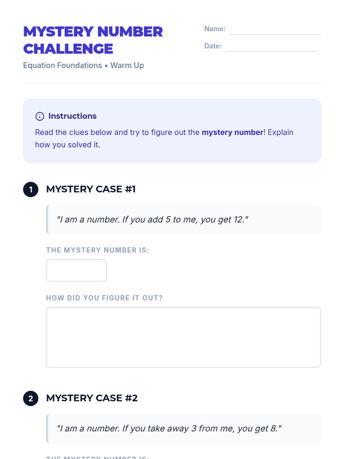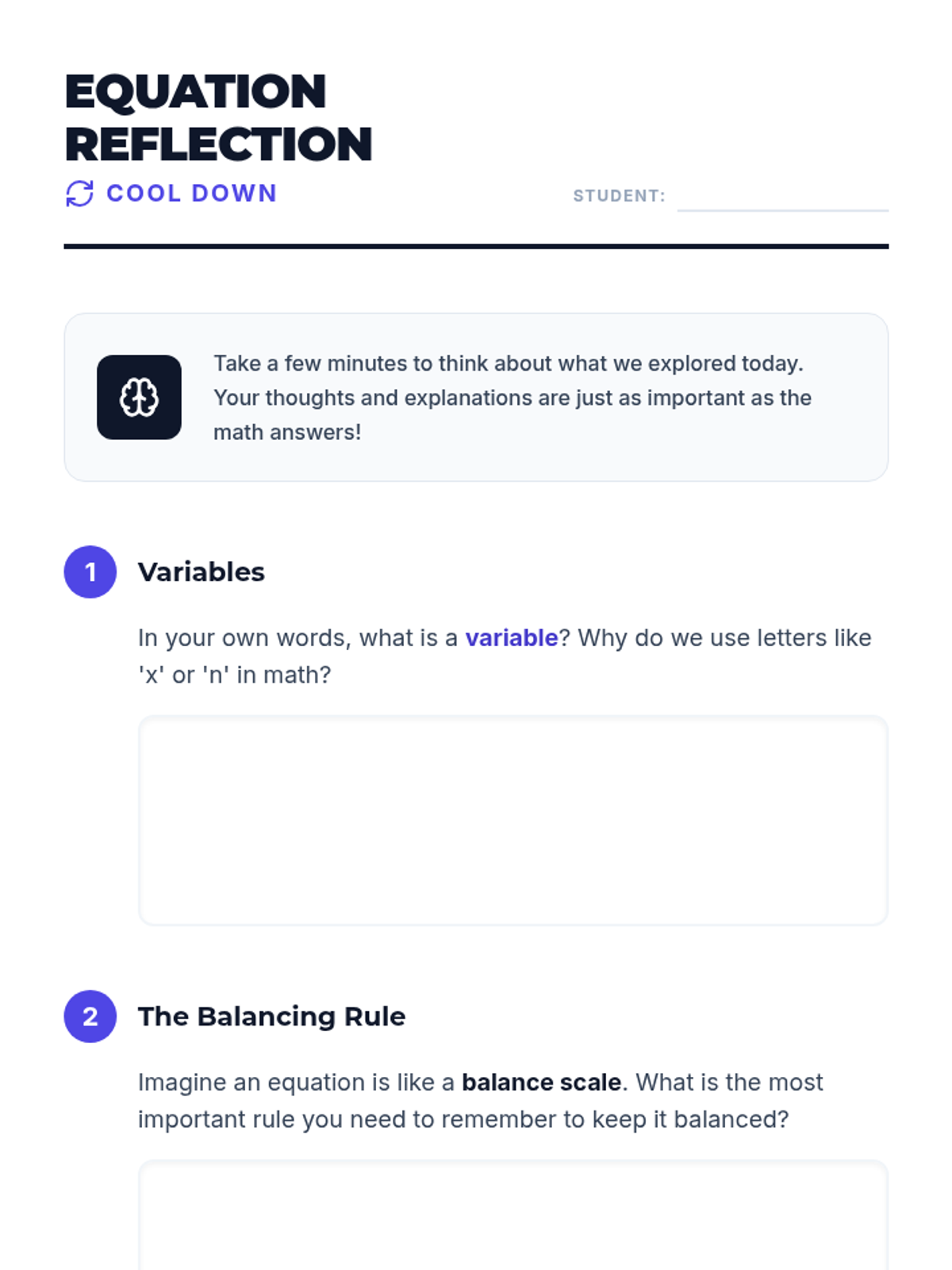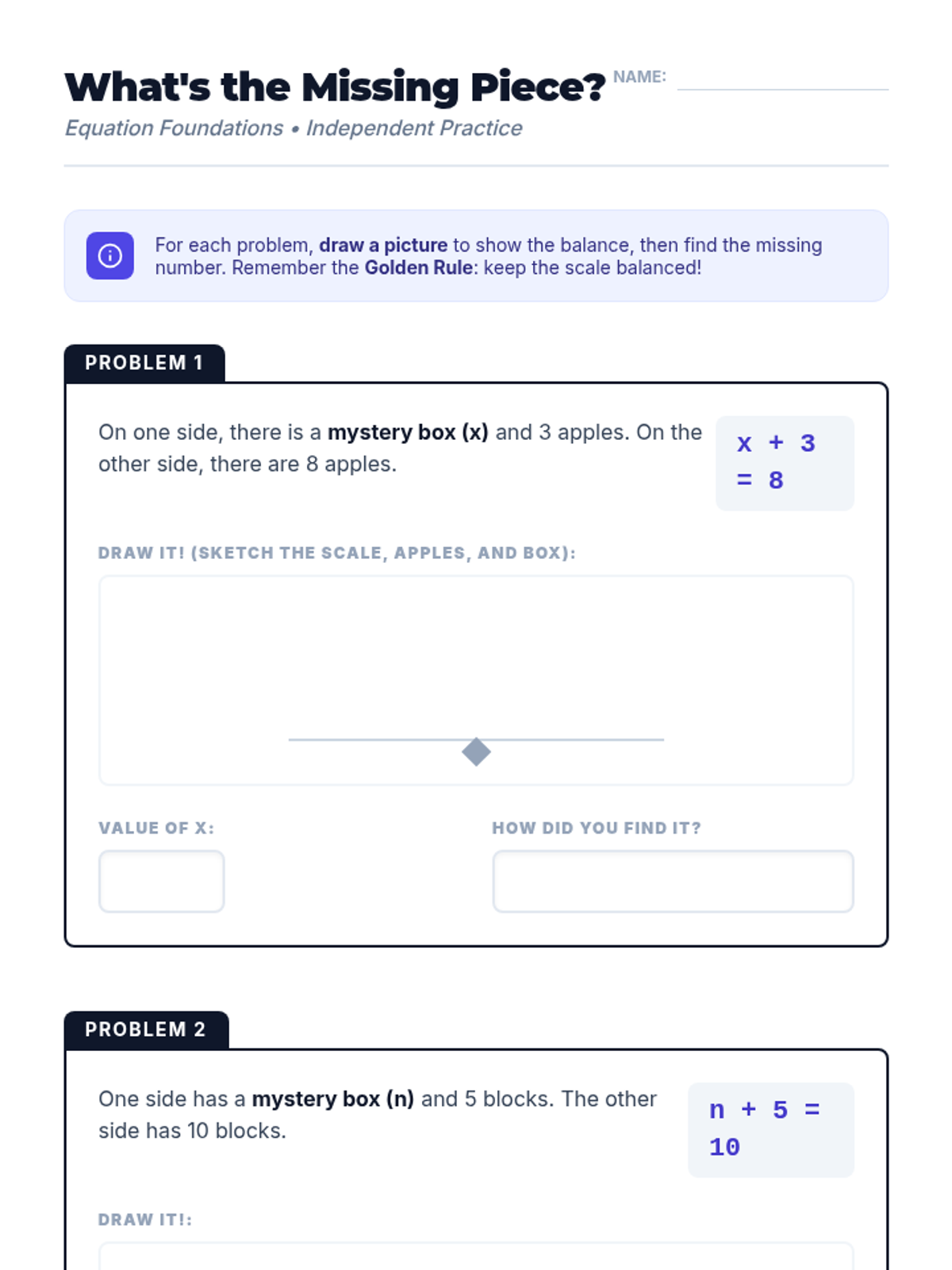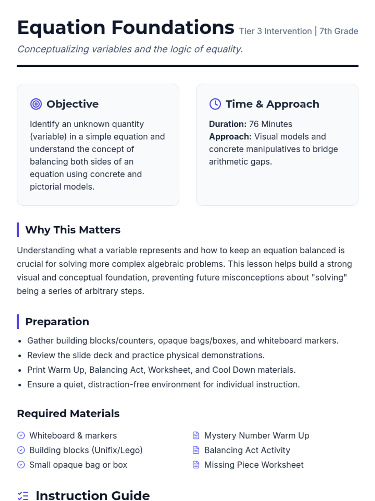A Tier 3 intervention lesson for 7th-grade students focusing on the conceptual foundation of variables and equation balancing using concrete and visual models.