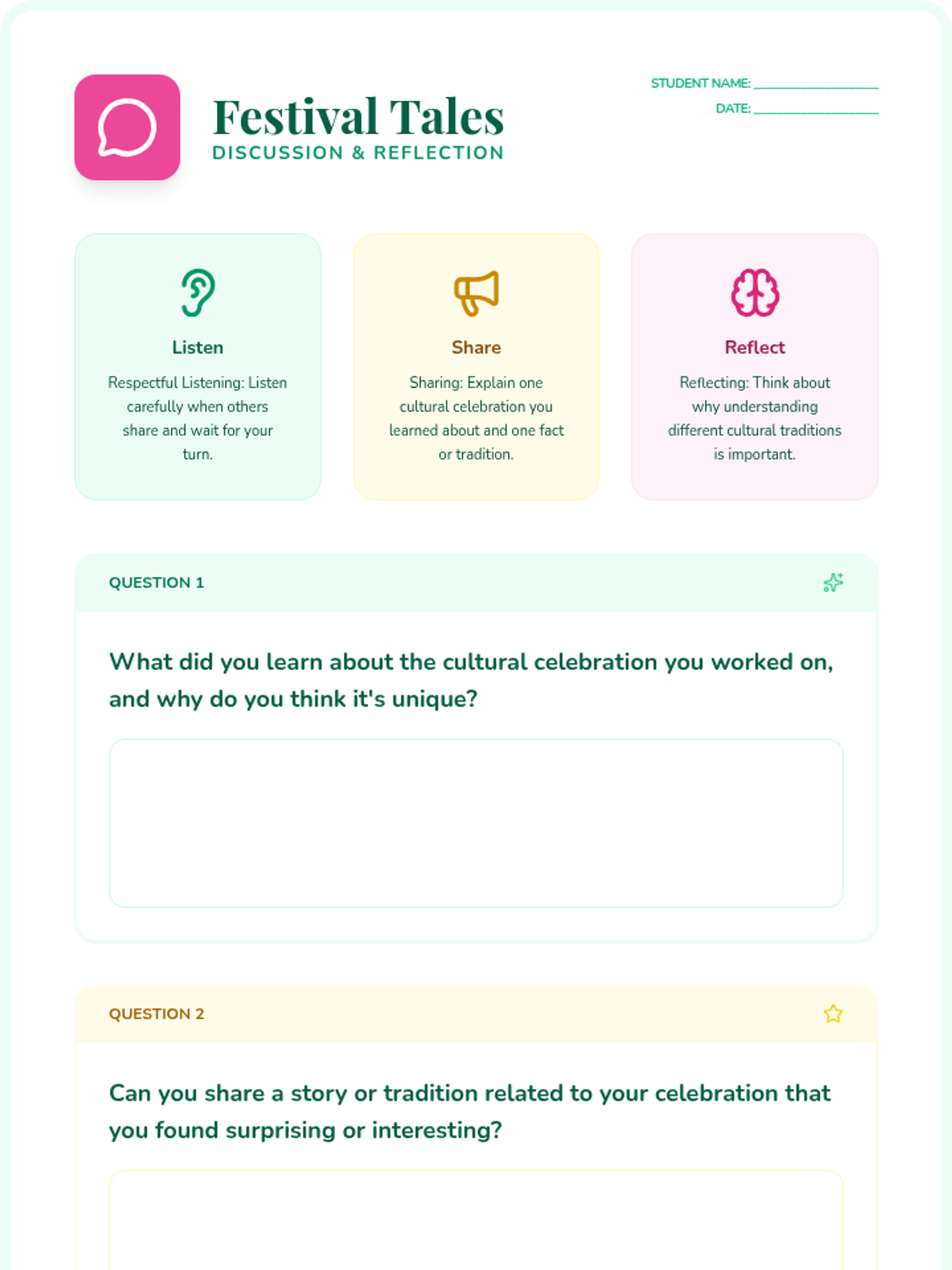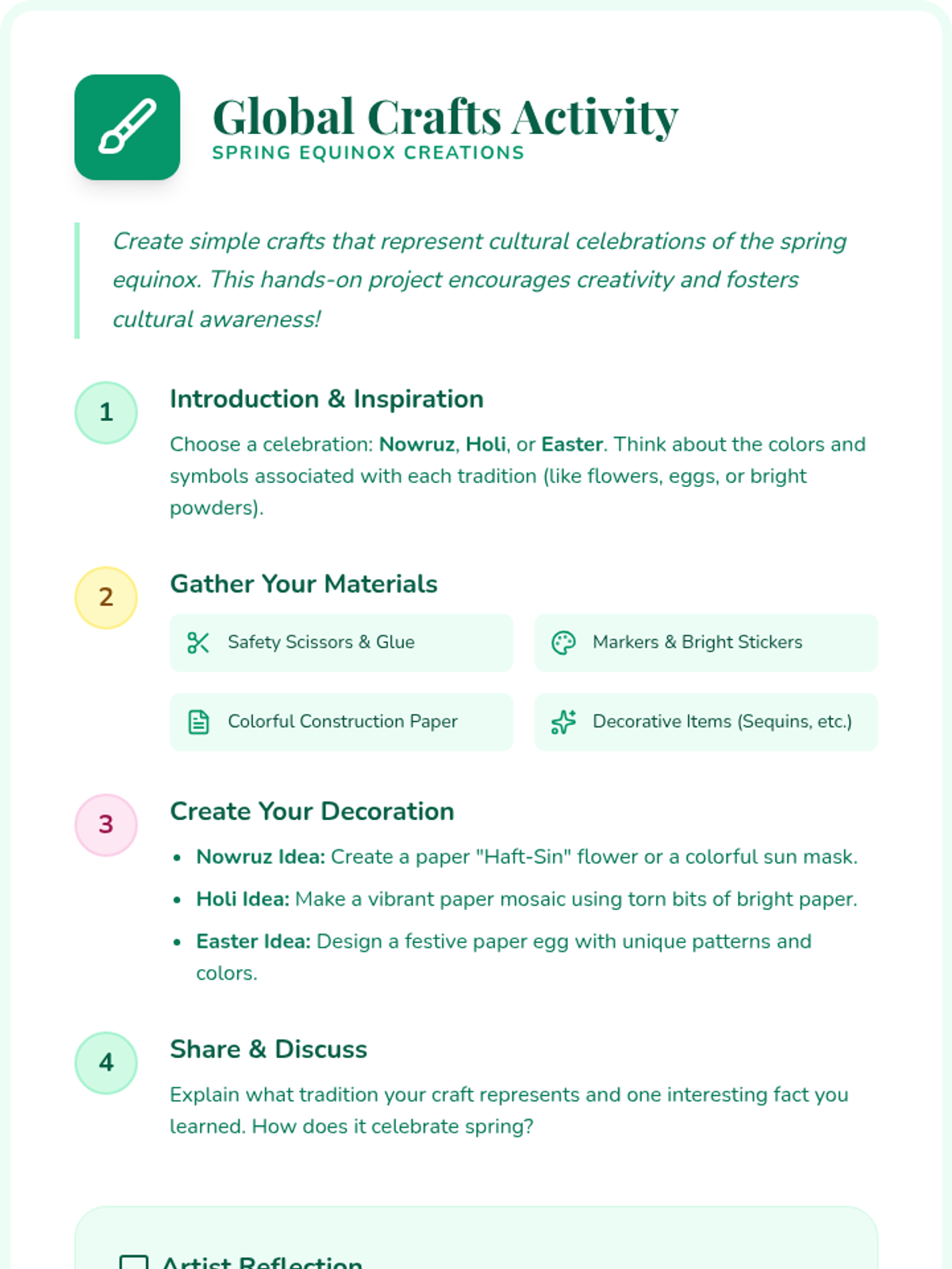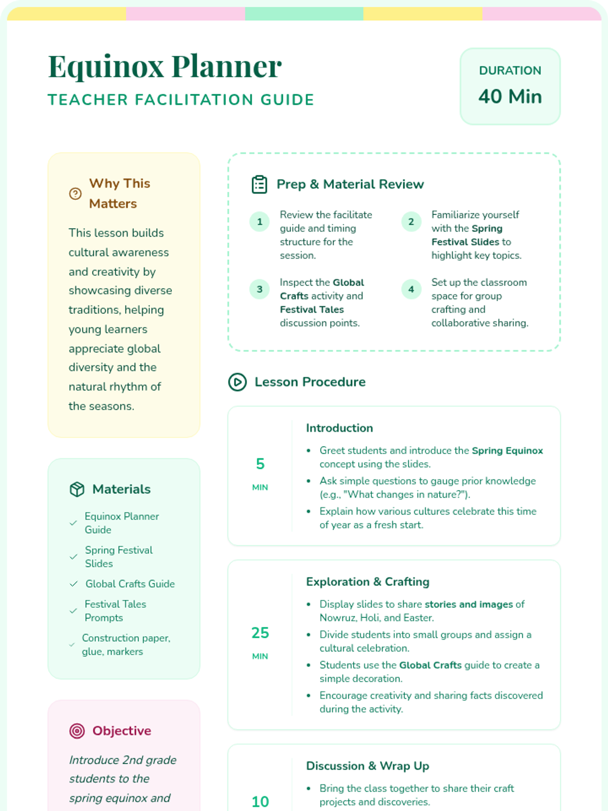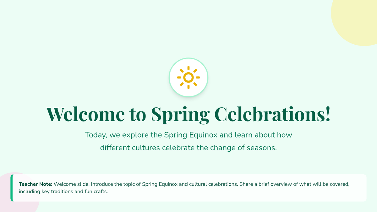 A 40-minute lesson for 2nd graders exploring the Spring Equinox through cultural traditions, hands-on crafting, and storytelling. Students learn about Nowruz, Holi, and Easter to build global awareness.