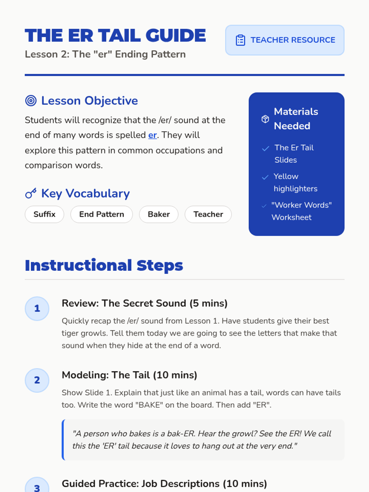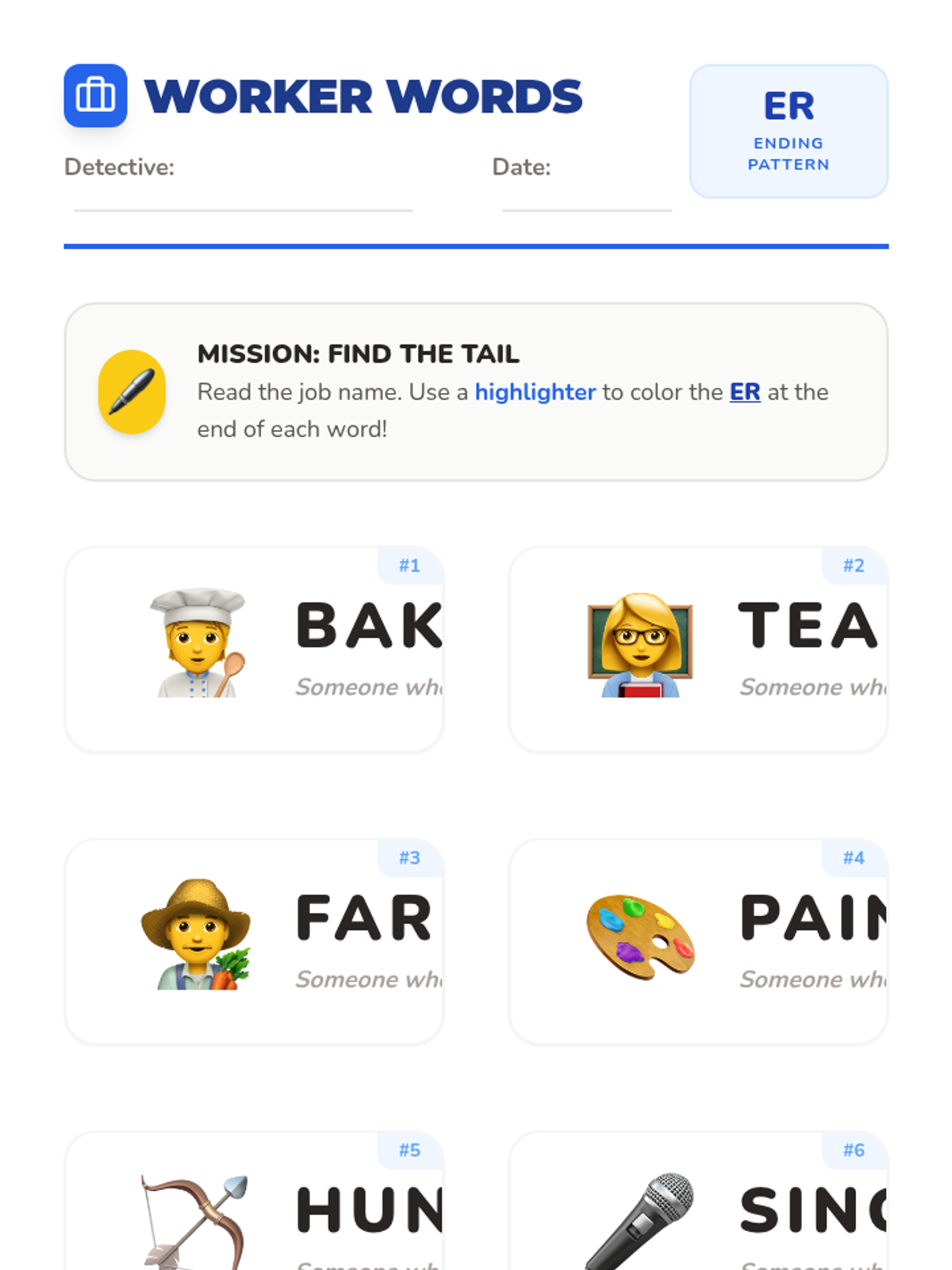 Focusing on the 'er' pattern at the ends of words, students learn about occupations and comparative words while practicing identifying the suffix.