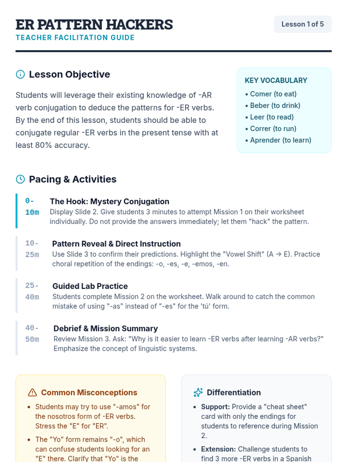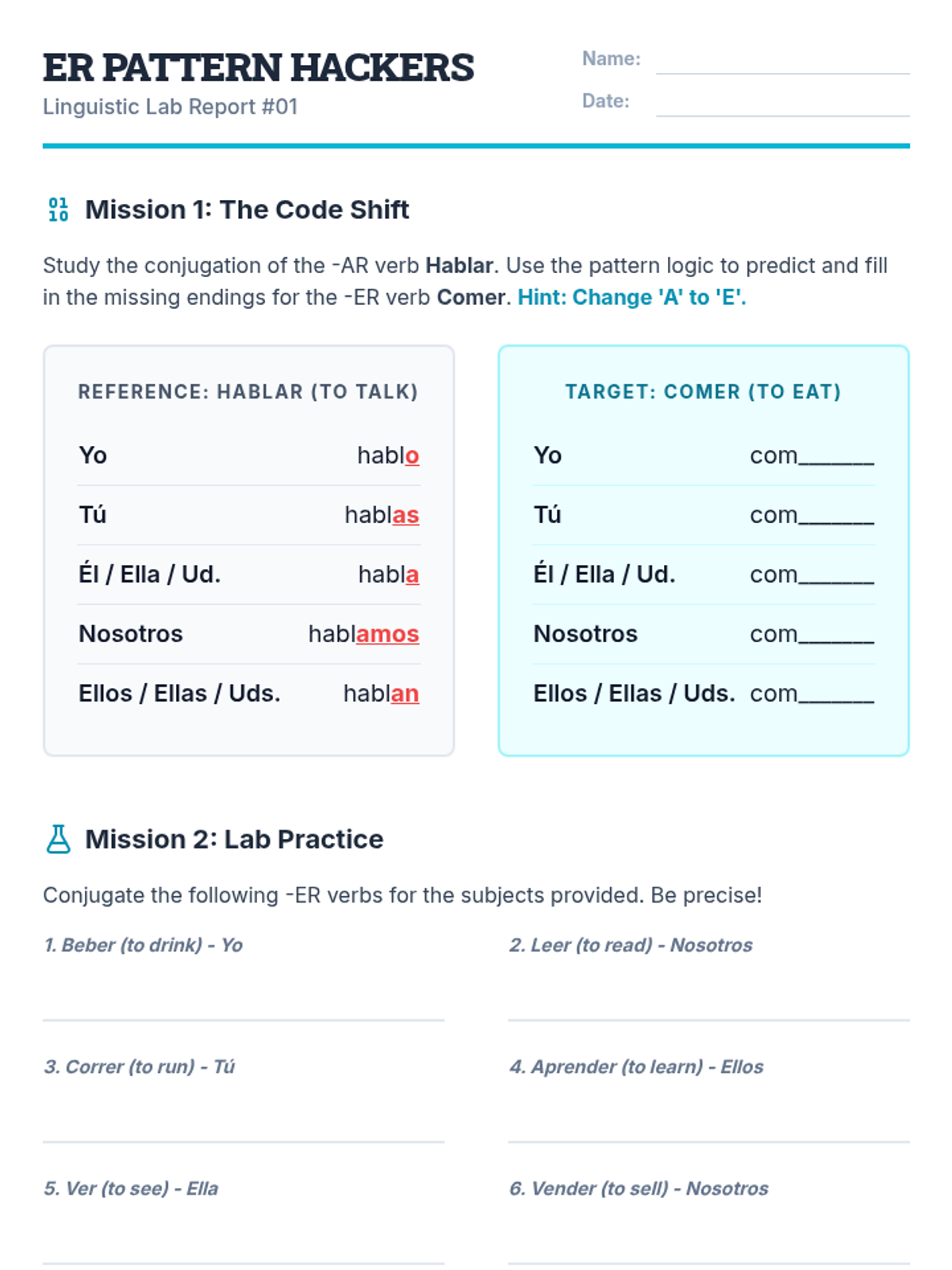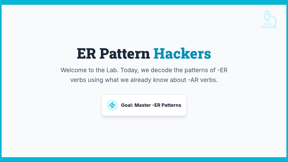 Students contrast the conjugation of -er verbs with -ar verbs, identifying patterns and vowel shifts to build a foundation for second-group verb conjugation.