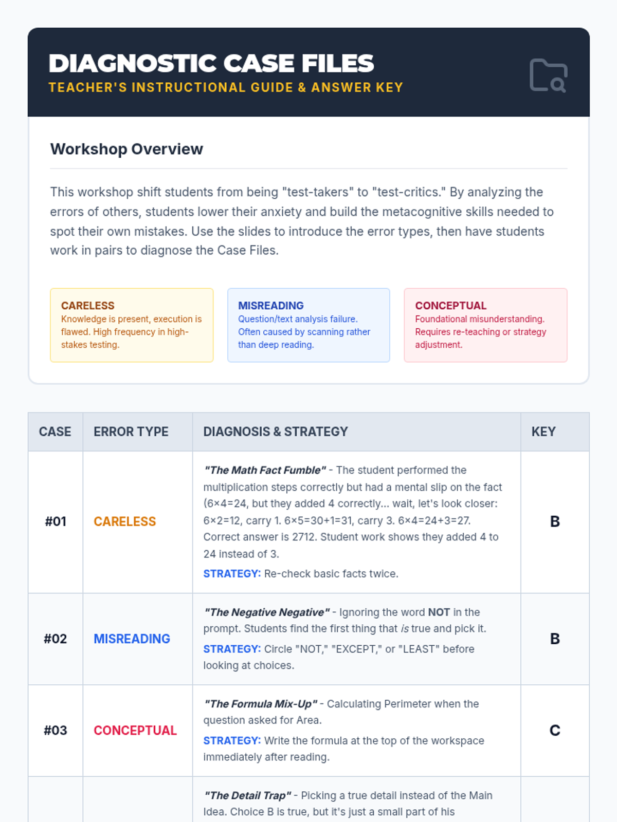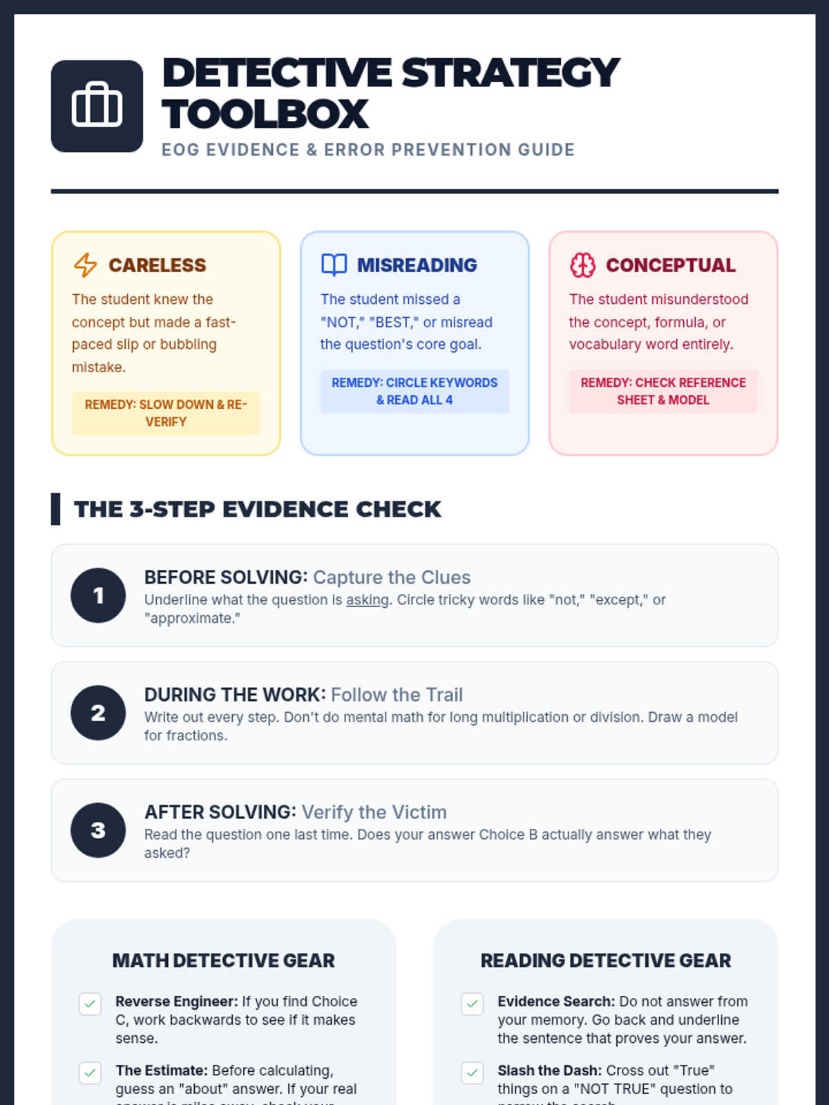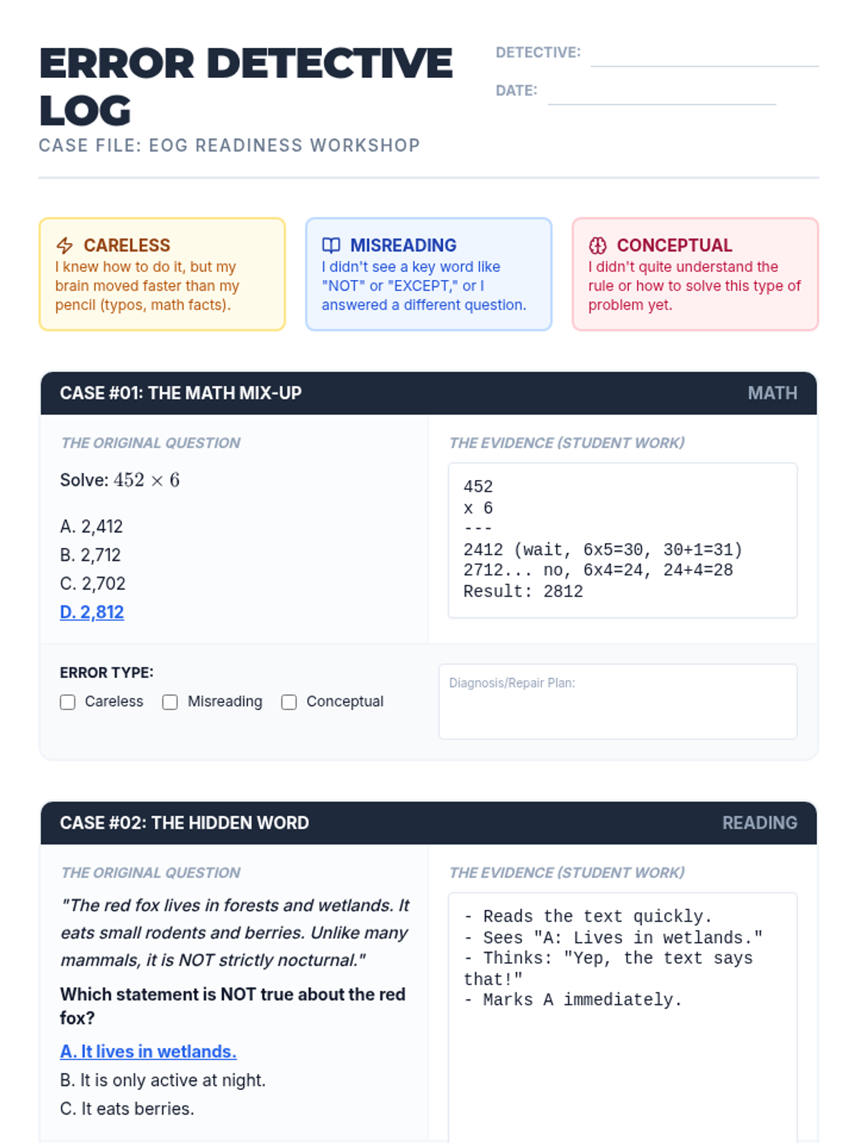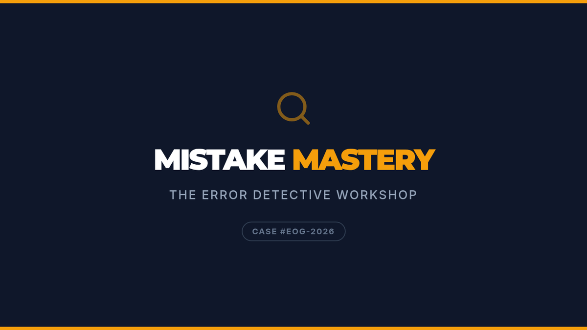 A hands-on workshop where students become 'Error Detectives' to analyze common test-taking mistakes. Students identify careless, conceptual, and misreading errors in EOG-style problems to build robust self-correction habits.