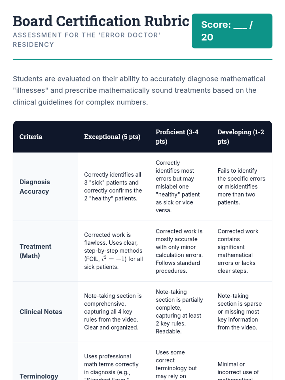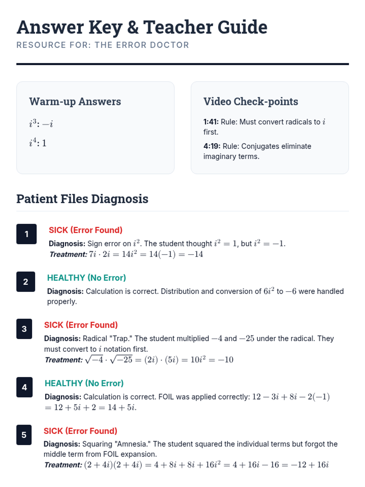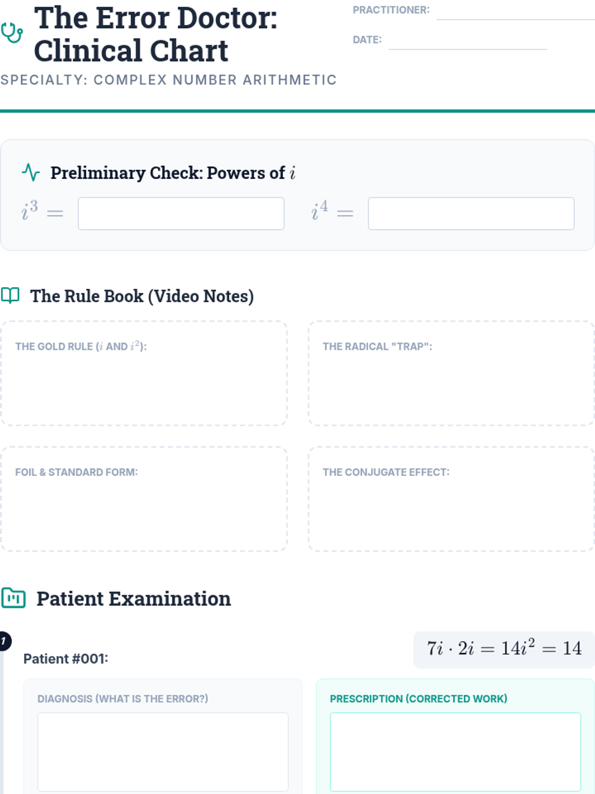 Students step into the role of an 'Error Doctor' to diagnose and treat common misconceptions in complex number multiplication. This lesson uses a targeted tutorial video to establish rules before applying them to critique and correct solved problems.