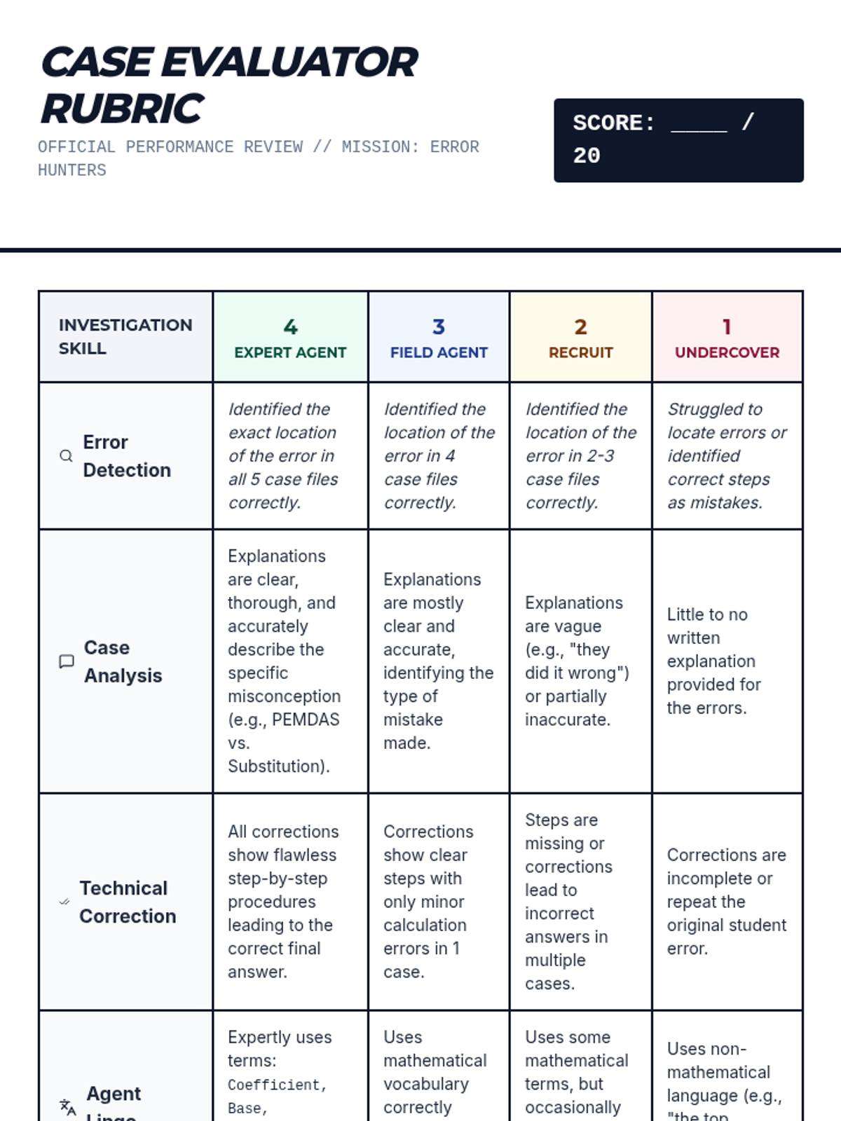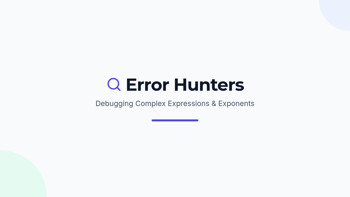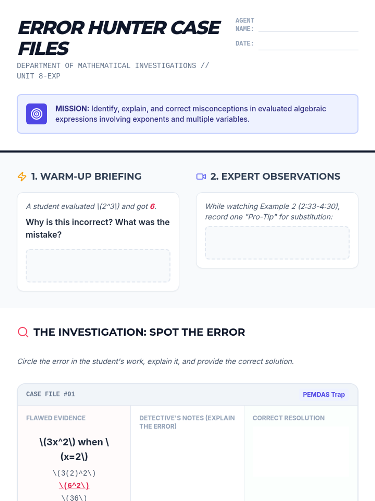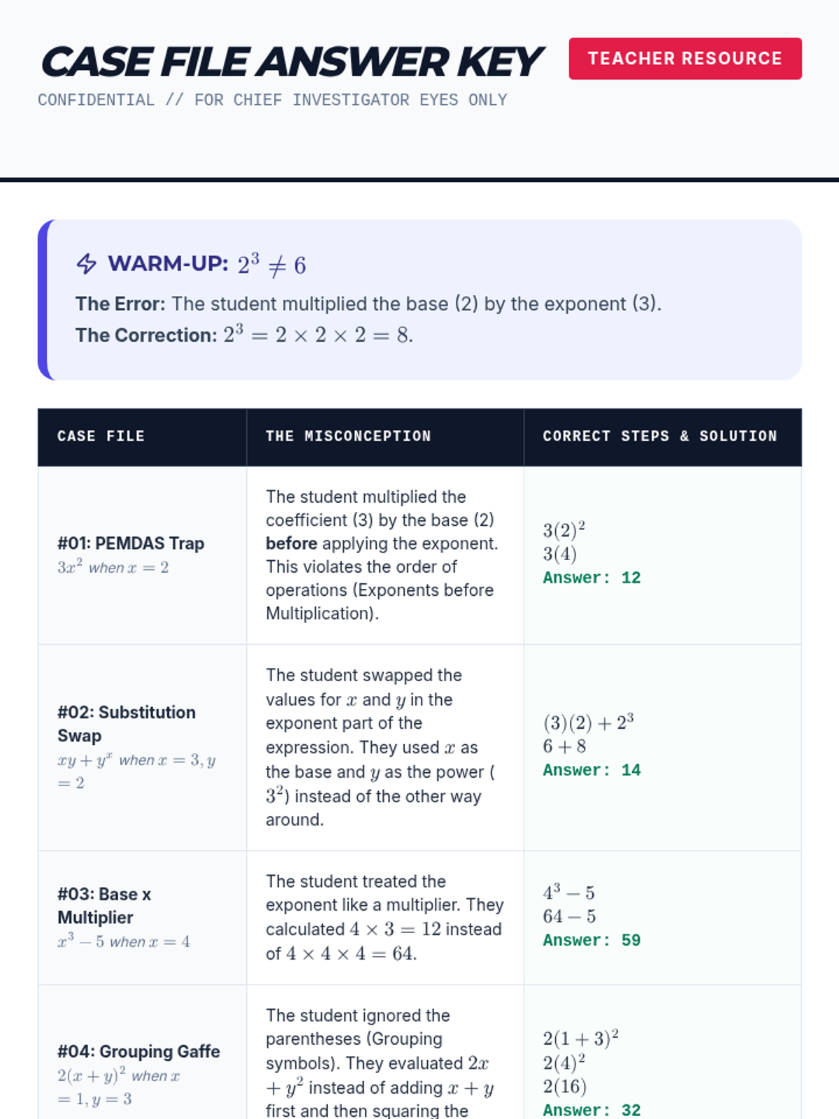 A lesson focused on identifying and correcting common misconceptions when evaluating expressions with exponents and multiple variables. Students act as 'Math Detectives' to debug solved problems.