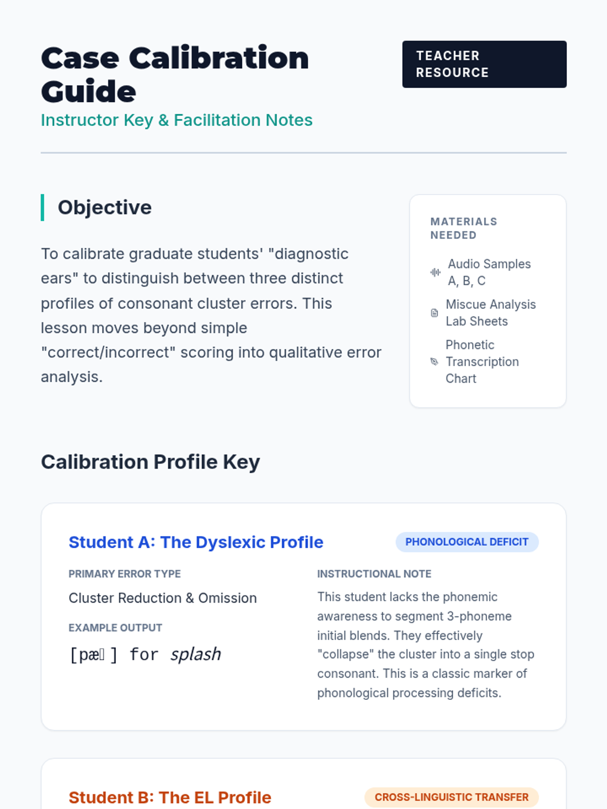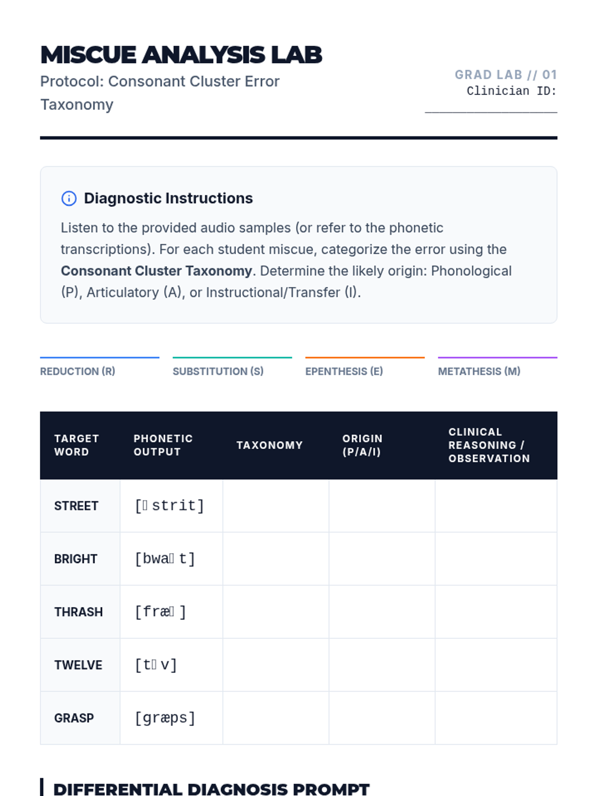 Graduate students will classify reading errors into categories such as cluster reduction, substitution, and deletion, using case studies to distinguish between phonological processing issues and speech-sound disorders.