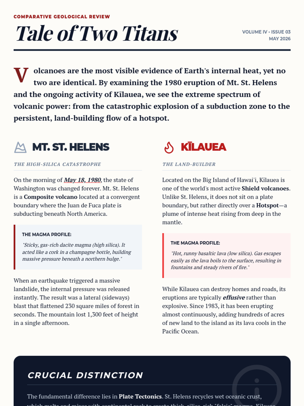 A comparative analysis of the 1980 Mt. St. Helens eruption and Kilauea's ongoing activity to highlight the differences between convergent boundary and hotspot volcanism.