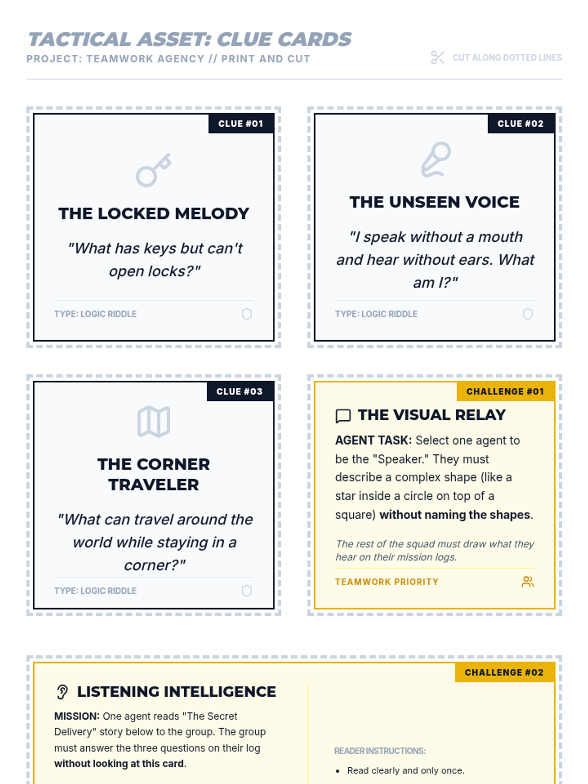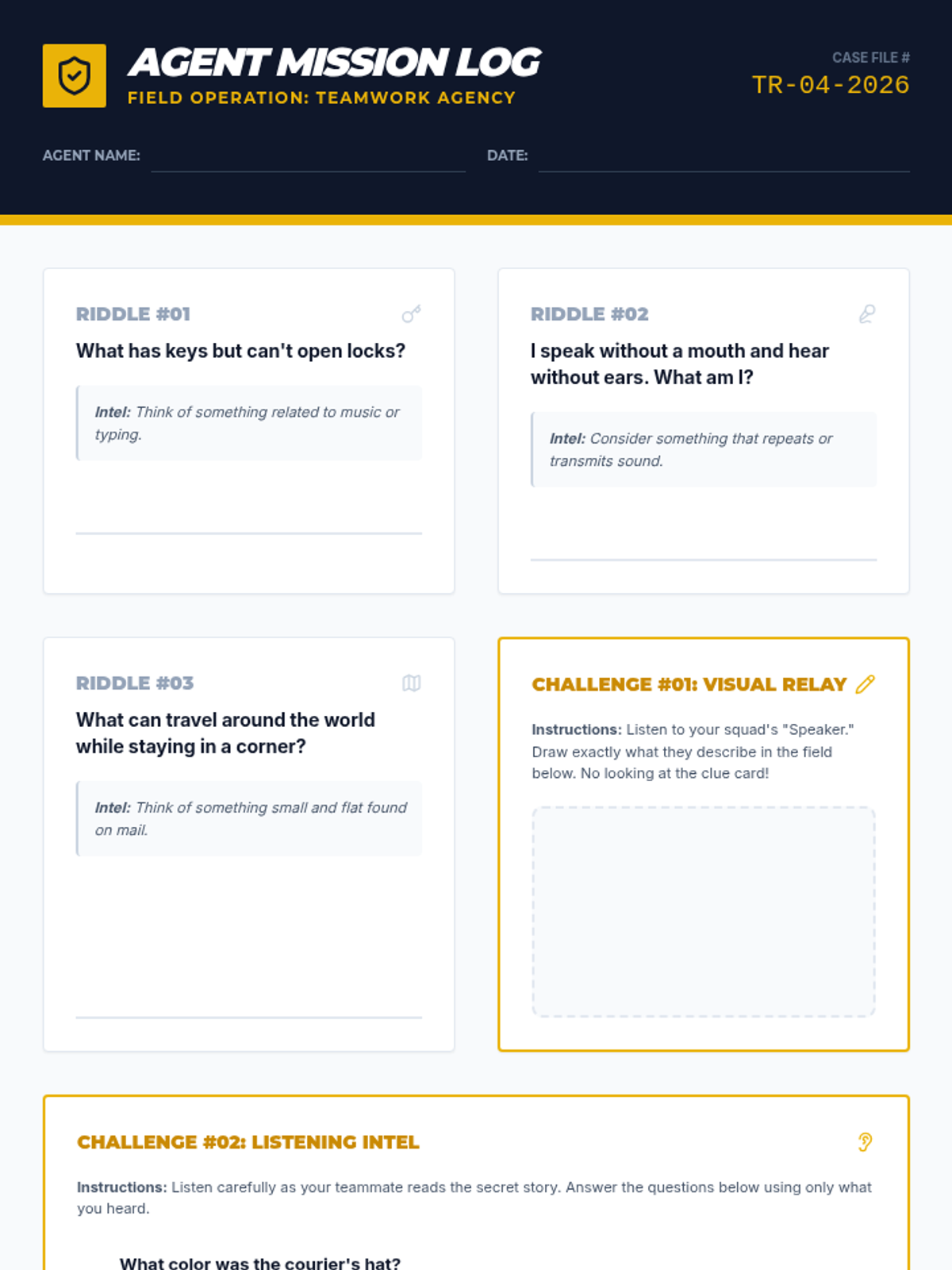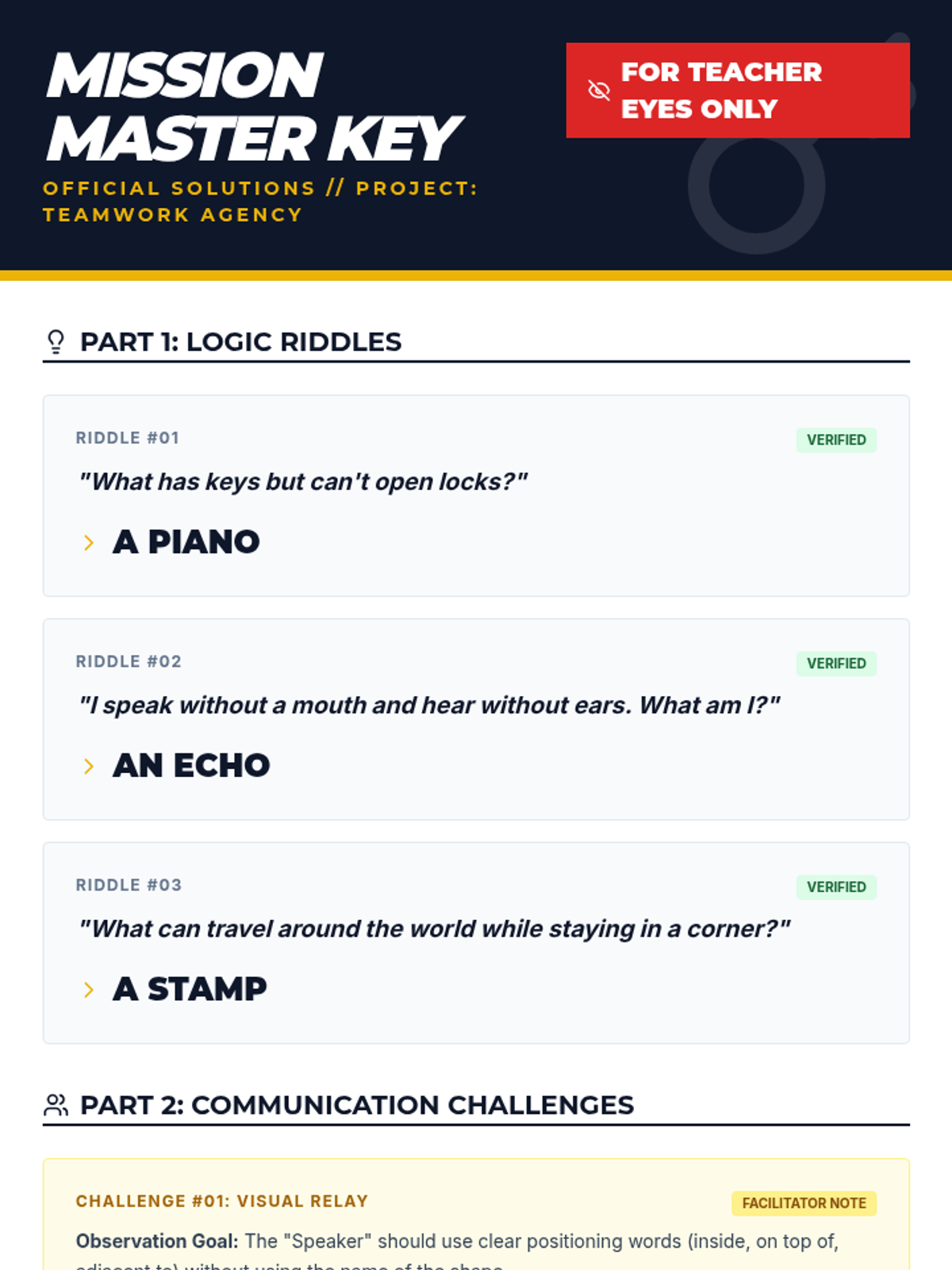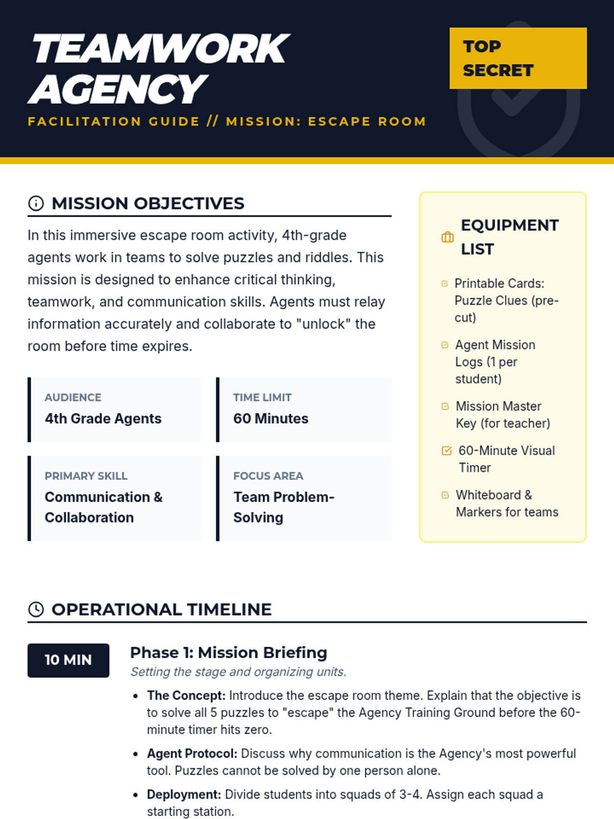 An immersive, spy-themed escape room experience for 4th graders that focuses on building communication and collaborative problem-solving skills. Students work in teams to decode clues and complete communication challenges to 'unlock' the room.