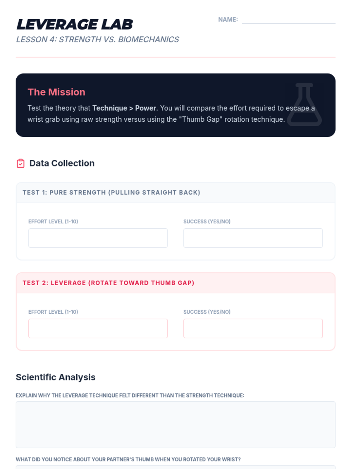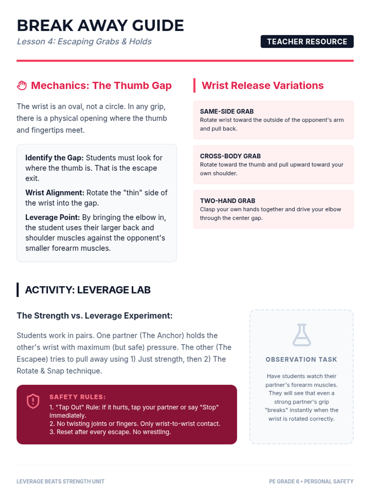 Teaches mechanical releases for common grabs using leverage instead of strength. Students analyze the 'weak links' in a grip to facilitate safe escapes.