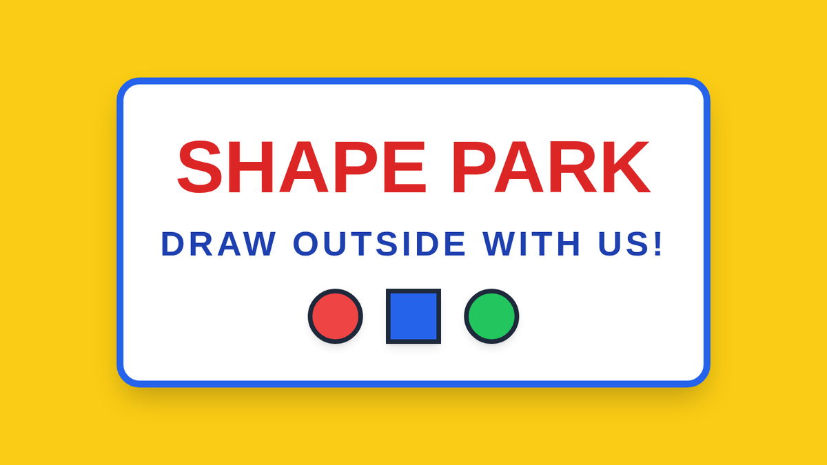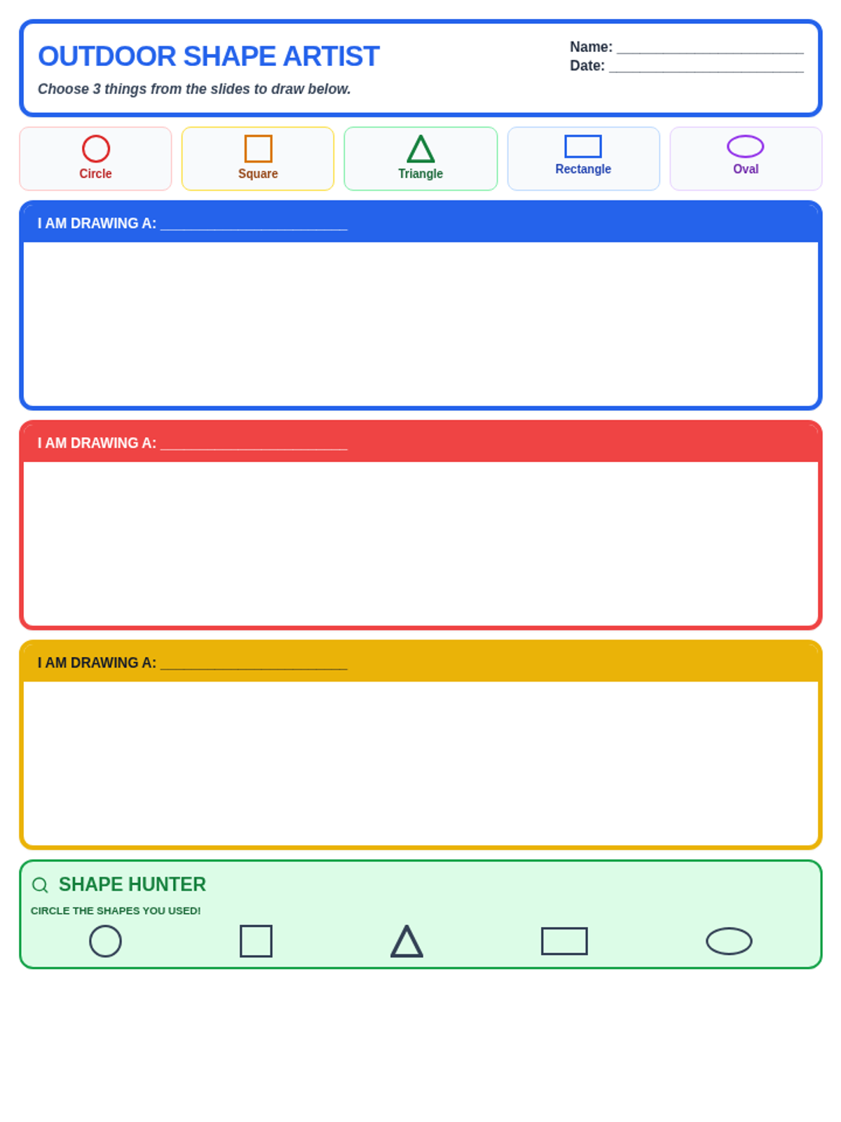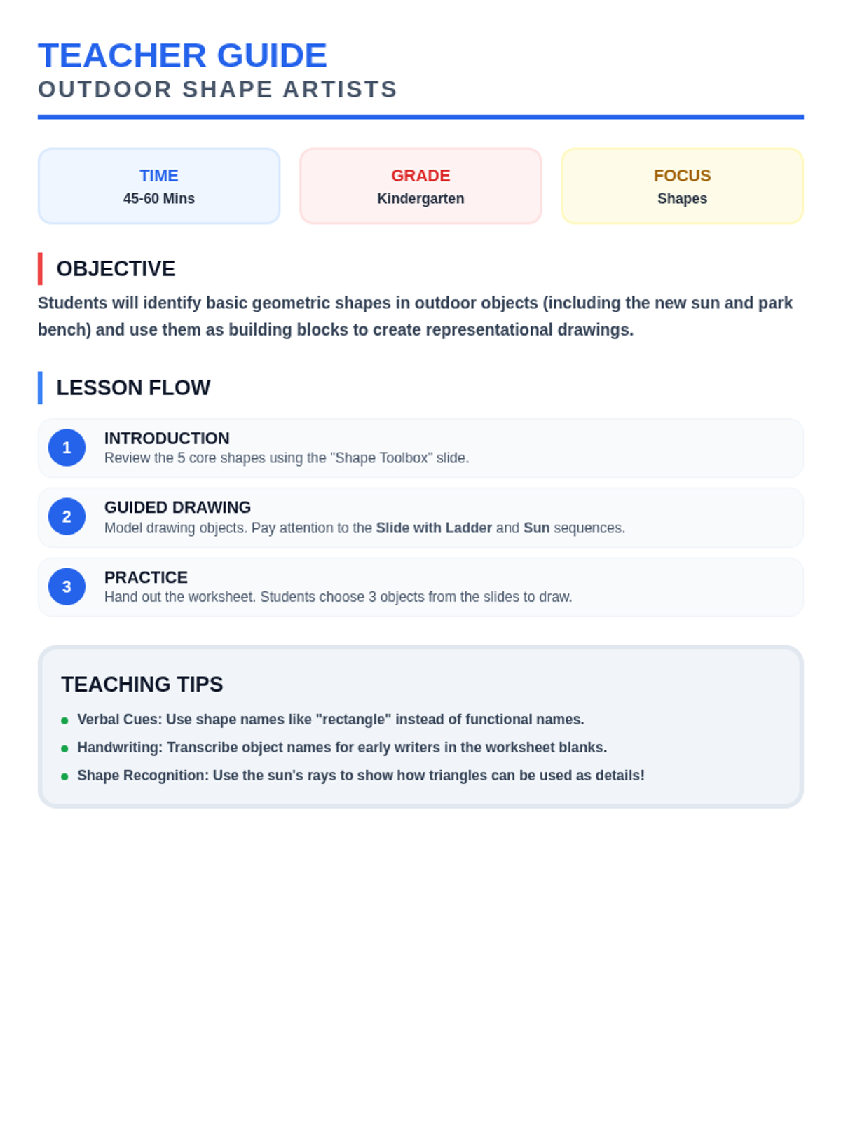 A kindergarten lesson focused on identifying and using basic geometric shapes (circle, square, triangle, rectangle, oval) to draw familiar outdoor objects. Students follow three-step visual guides to build their artistic confidence through shape recognition.