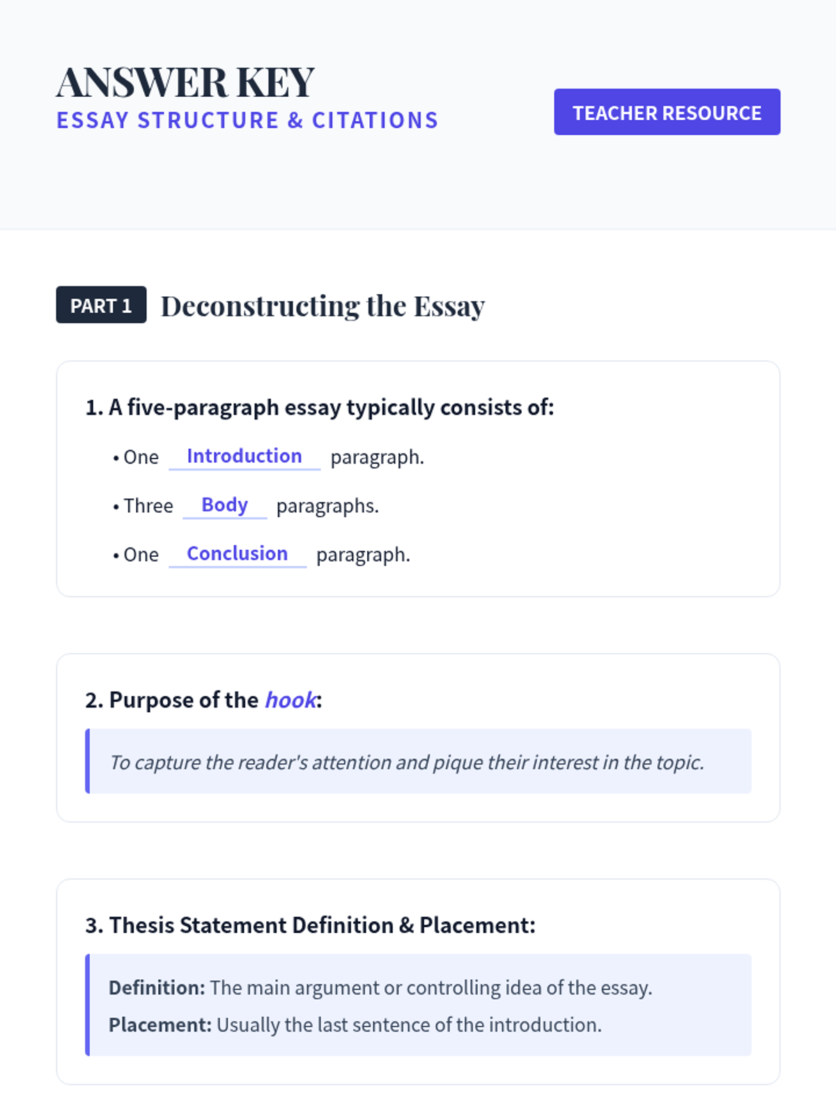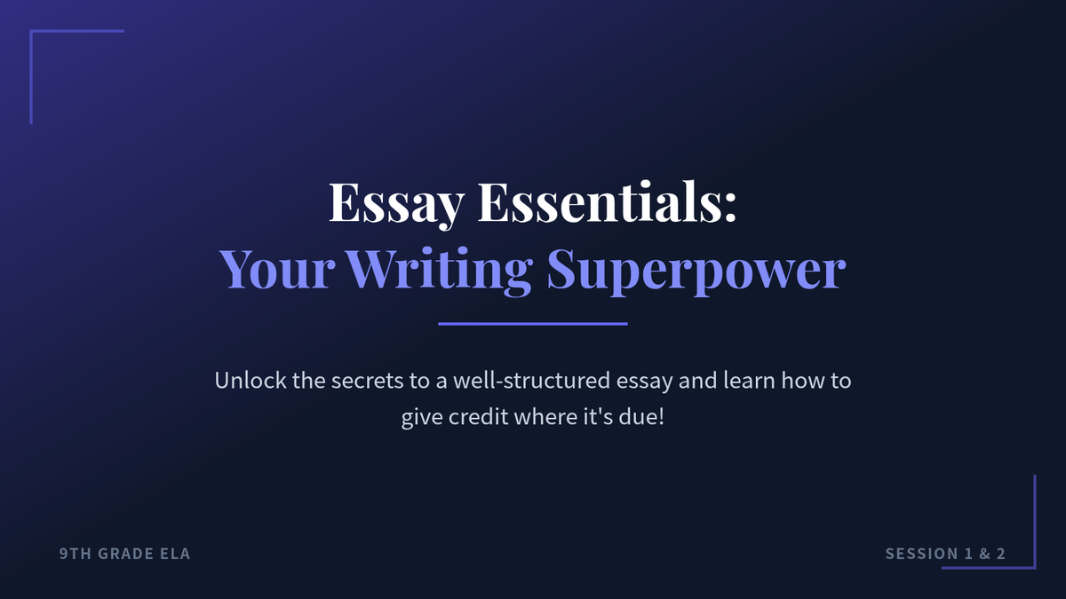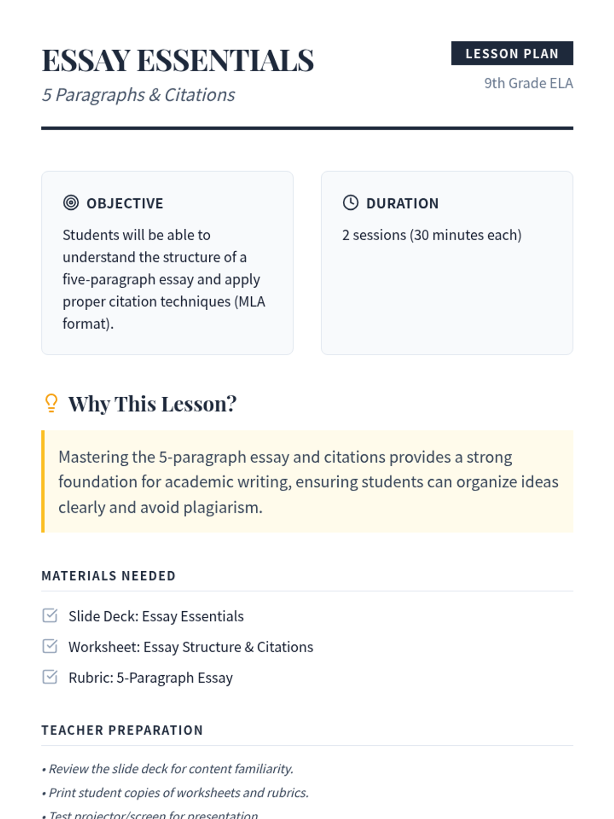 This two-session lesson empowers 9th-grade students to master the foundational structure of a 5-paragraph essay and the crucial skill of MLA citations. Students will learn the TEEL structure for body paragraphs and practice integrating evidence with proper credit.