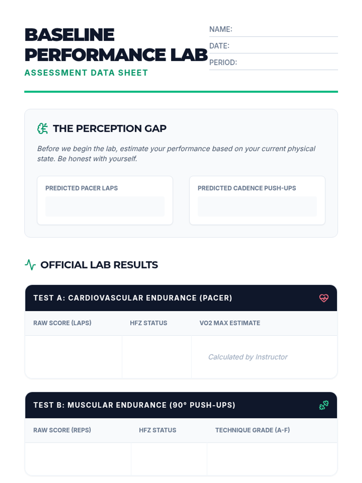Students rotate through a series of standardized fitness protocols, including the pacer test for cardiovascular endurance and cadence push-ups for muscular endurance. They record their raw data and compare it against healthy fitness zone charts to identify specific areas of strength and areas needing improvement.