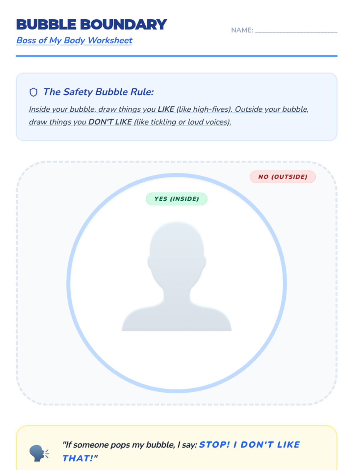 Students visualize their 'personal safety bubble' and practice assertive communication to set boundaries and exercise body autonomy.