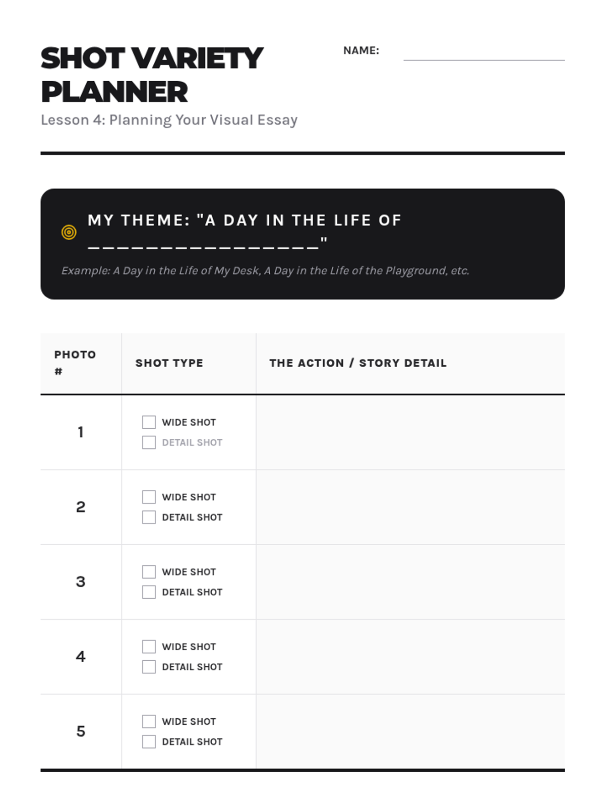 Students learn to use wide shots for context and detail shots for specific information to add variety to their stories.