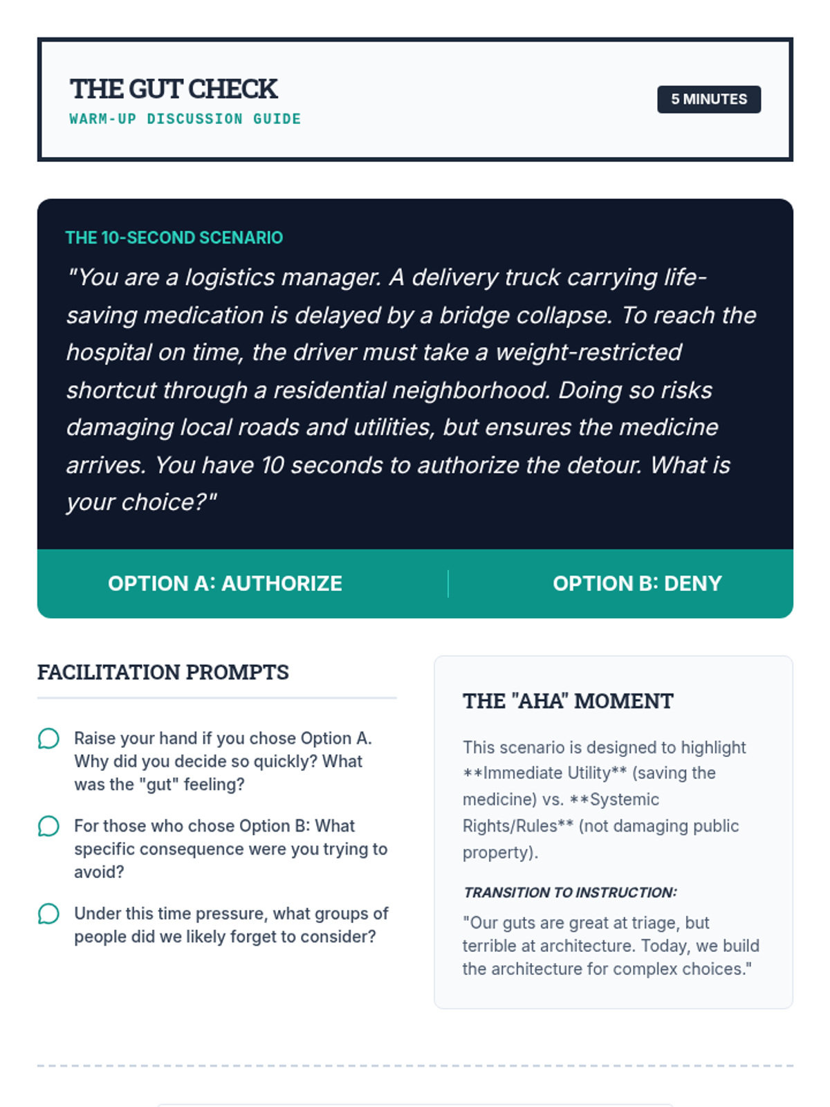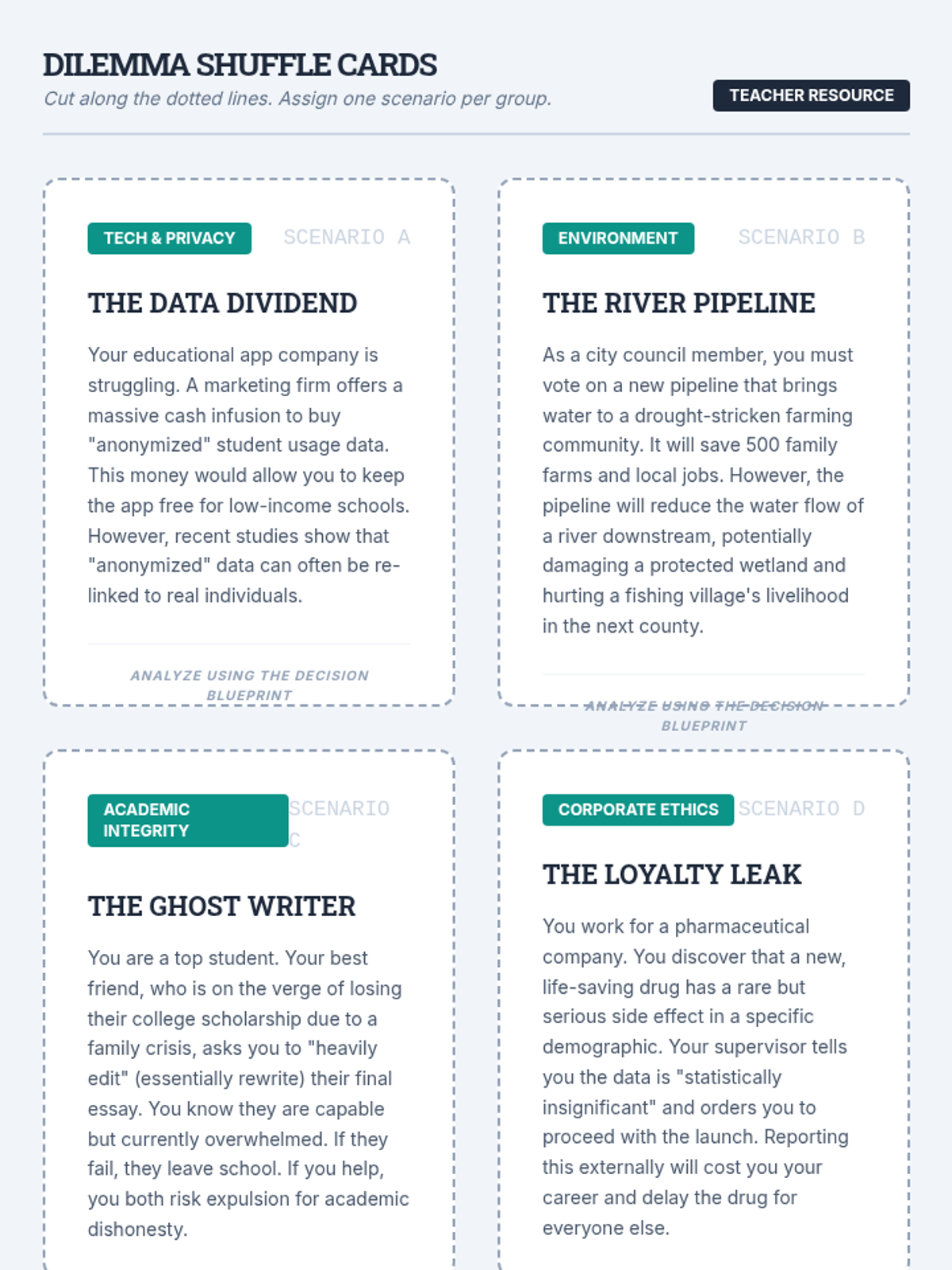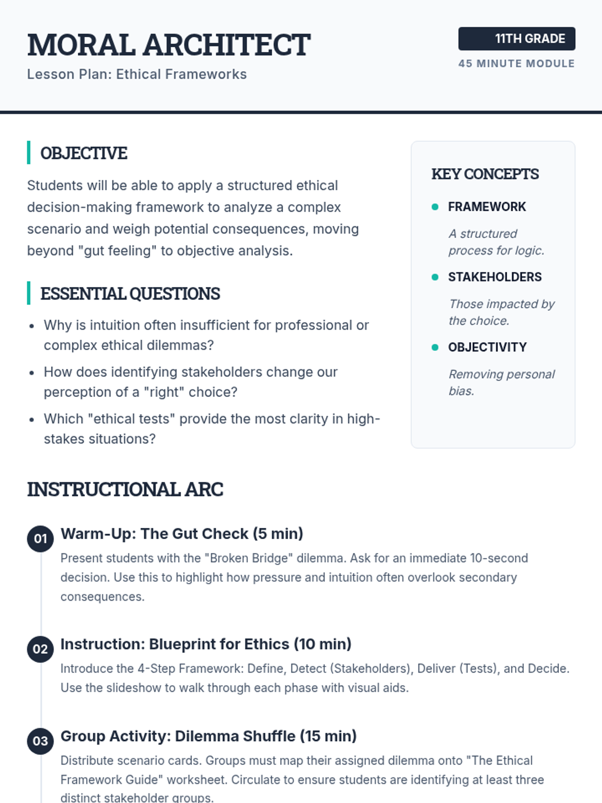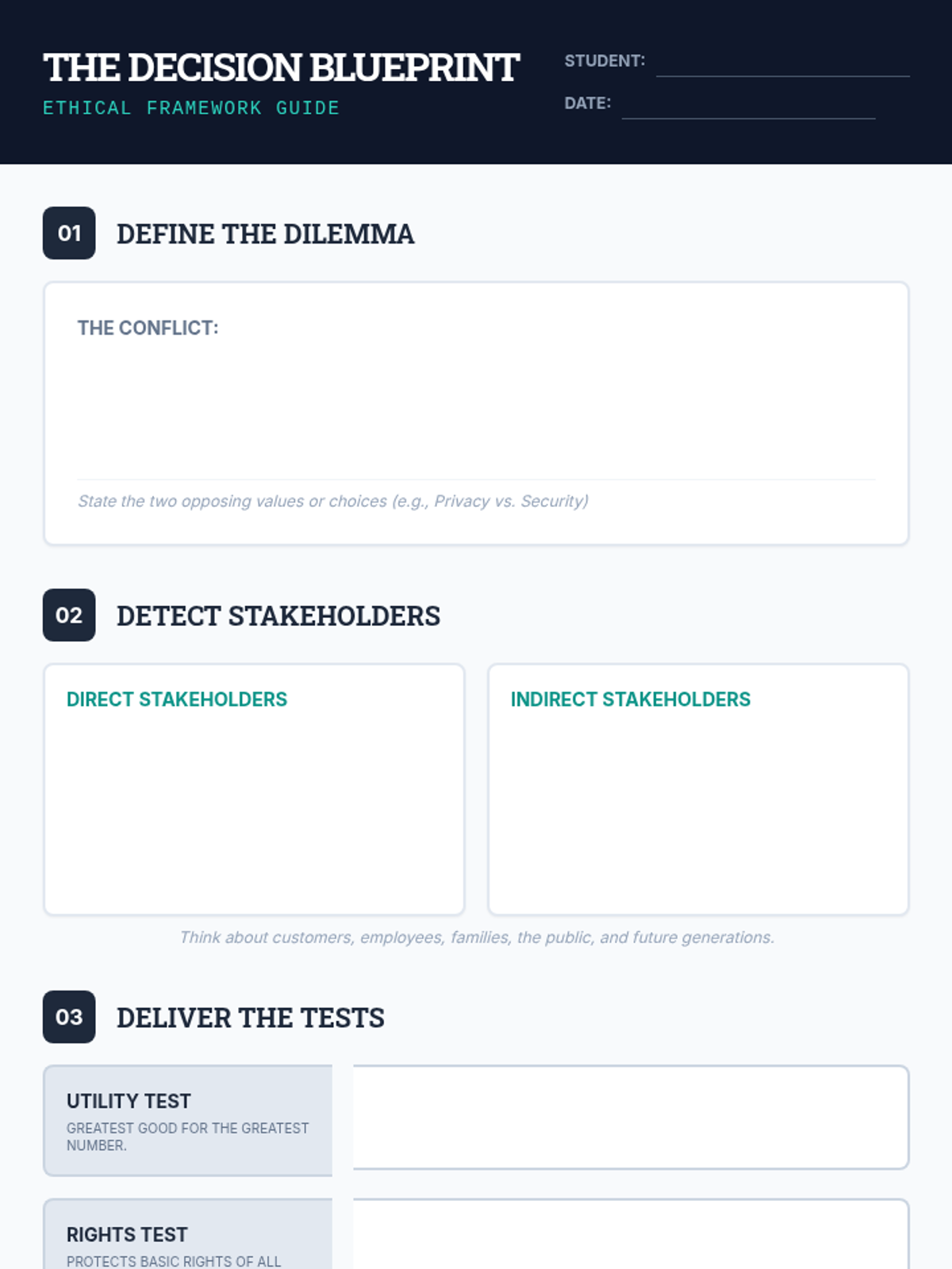 Students explore structured ethical decision-making beyond intuition, using a framework to navigate complex scenarios, identify stakeholders, and evaluate consequences.