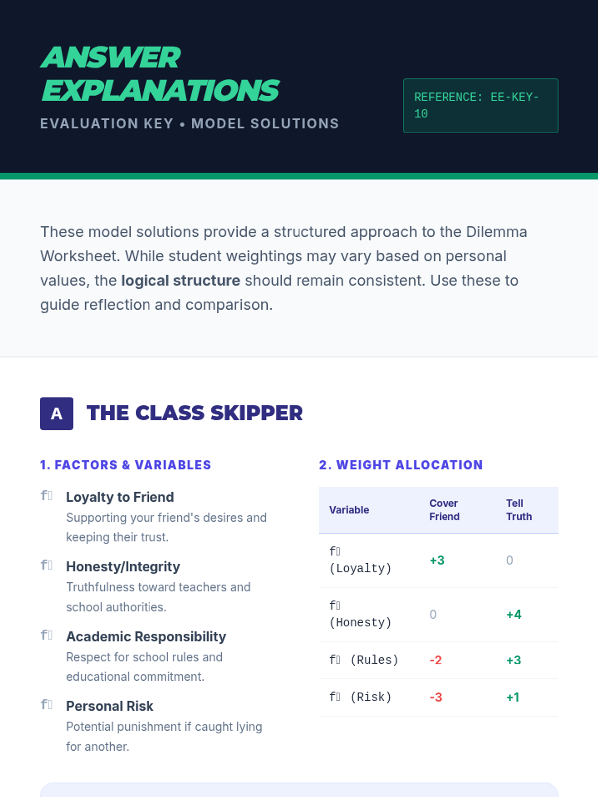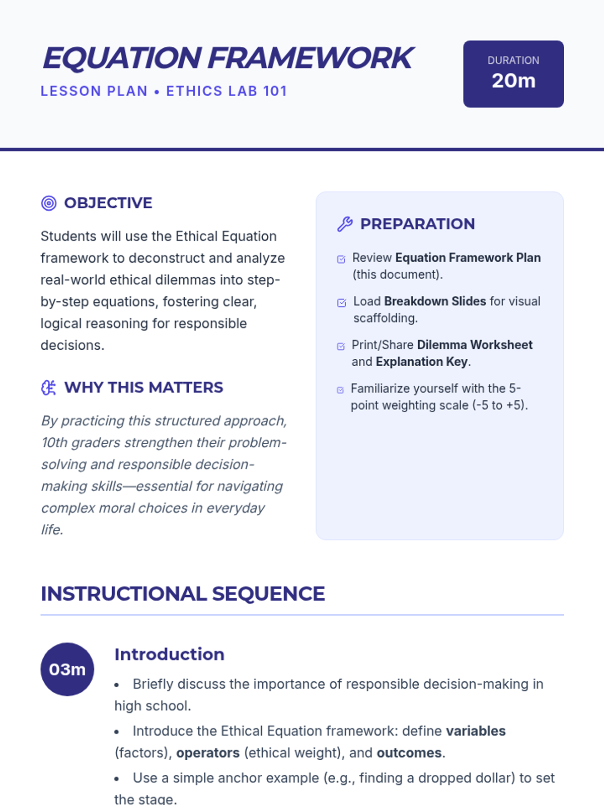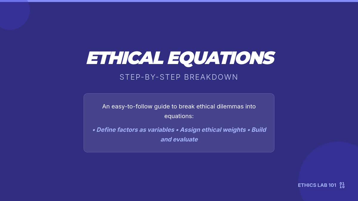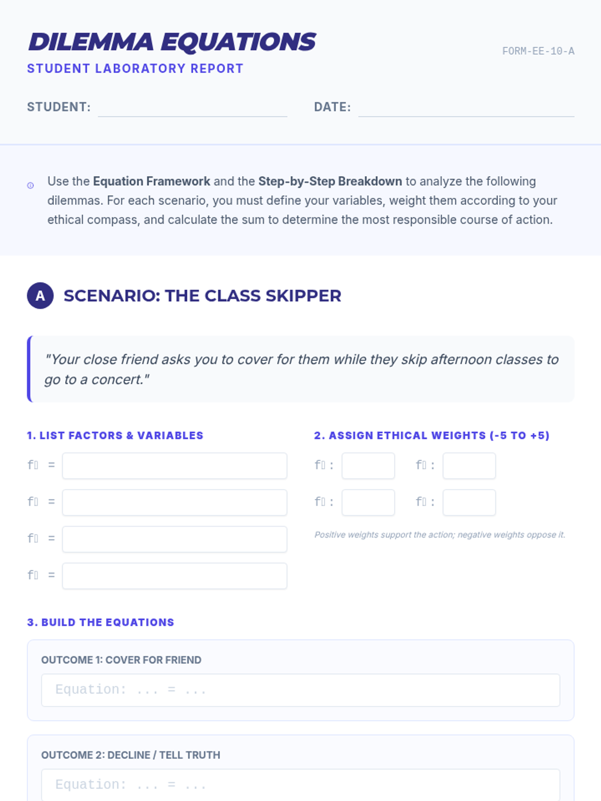 A 20-minute individual lesson for 10th graders that uses a mathematical framework to deconstruct complex ethical dilemmas into logical equations for responsible decision-making.