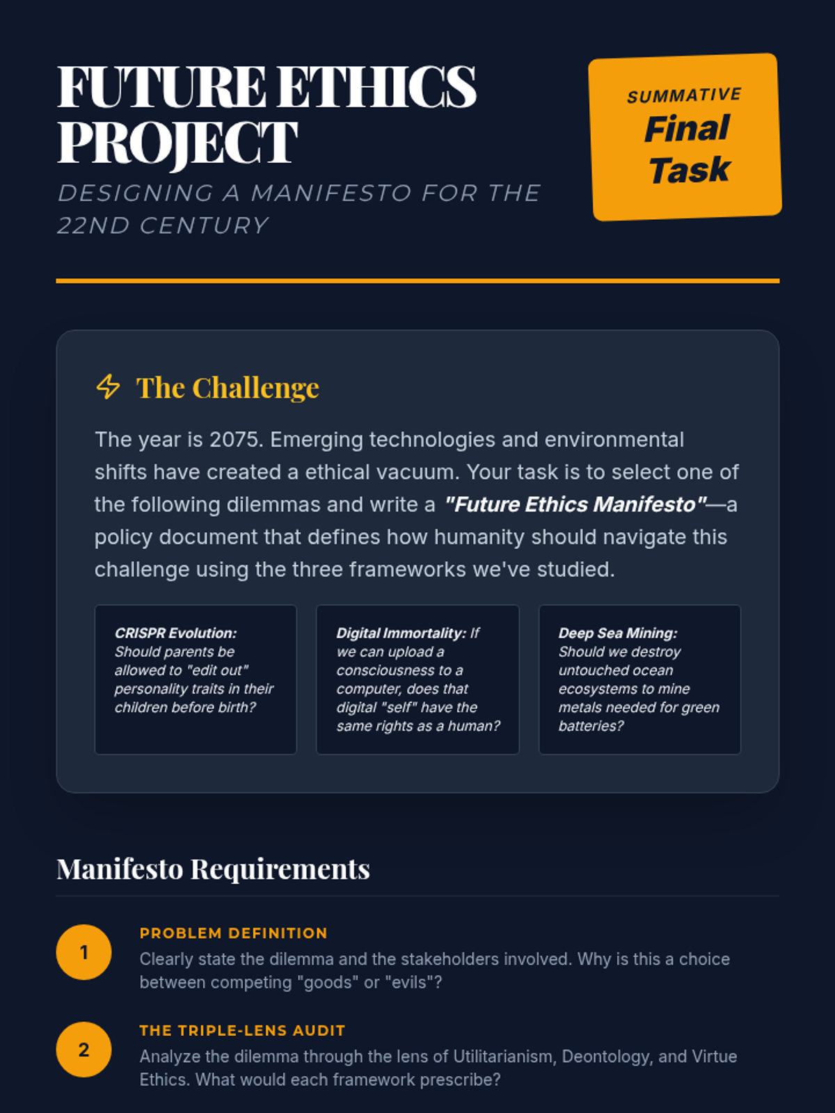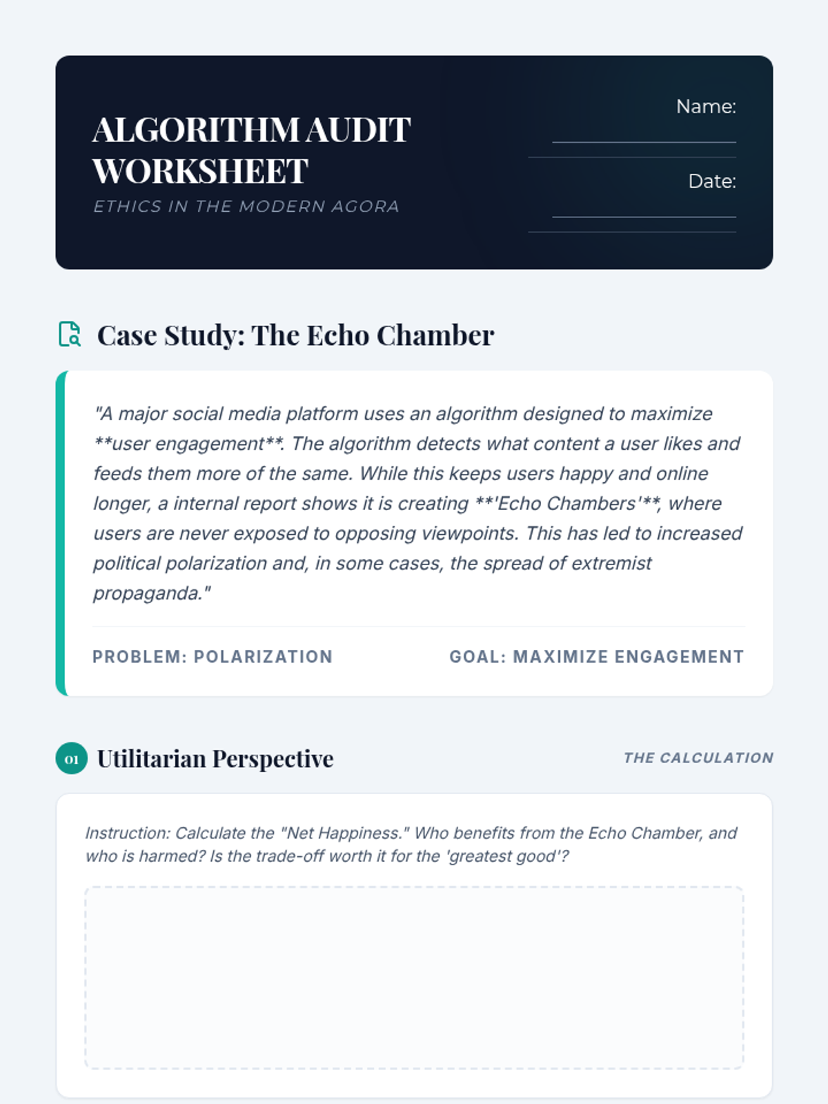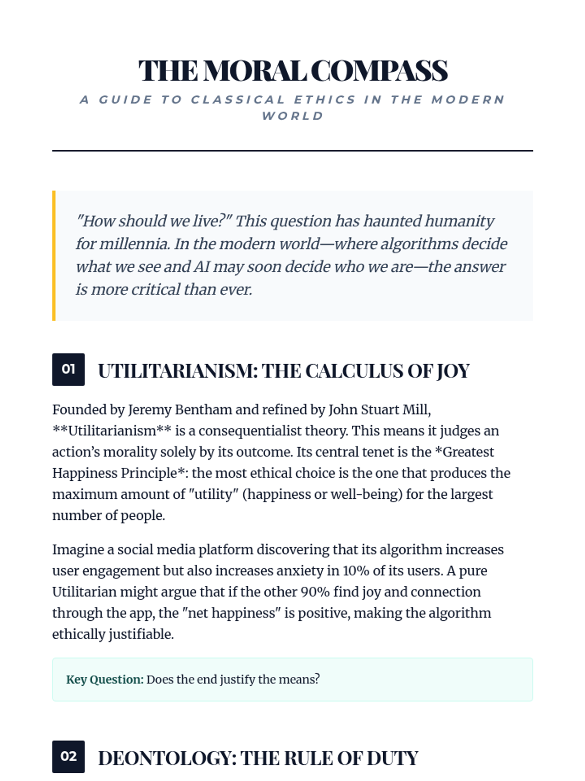 A deep dive into contemporary ethical challenges using classical philosophical frameworks. Students will analyze AI, environmental justice, and social media through the lenses of Utilitarianism, Deontology, and Virtue Ethics.