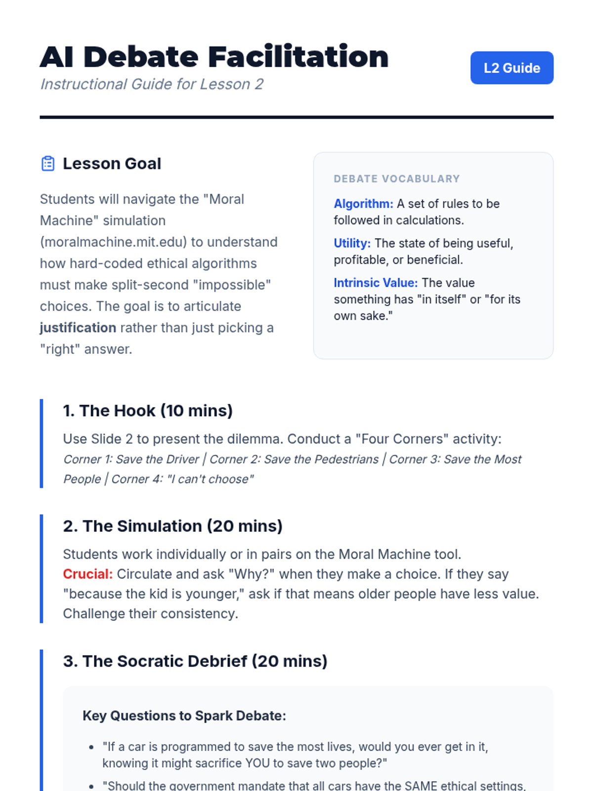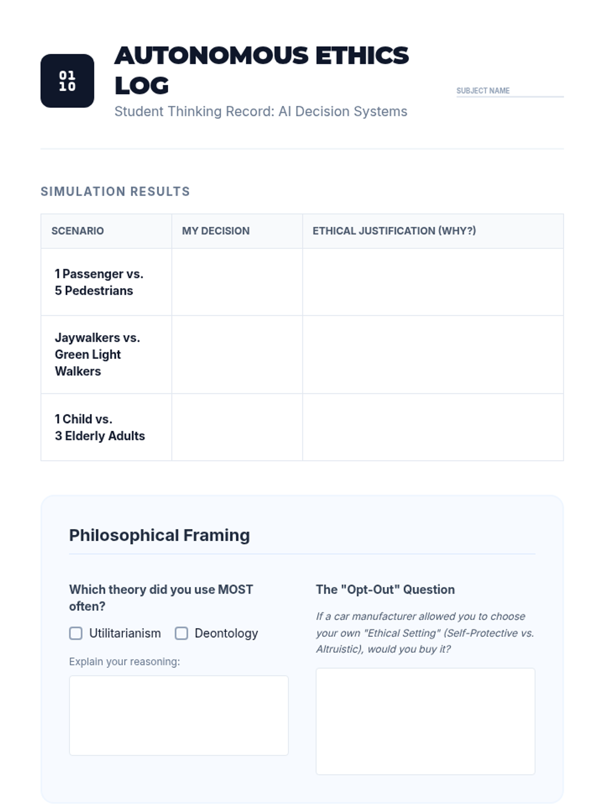 Using the 'Moral Machine' simulation, students grapple with the ethical programming of self-driving cars, debating utilitarian versus deontological approaches to unavoidable accidents.