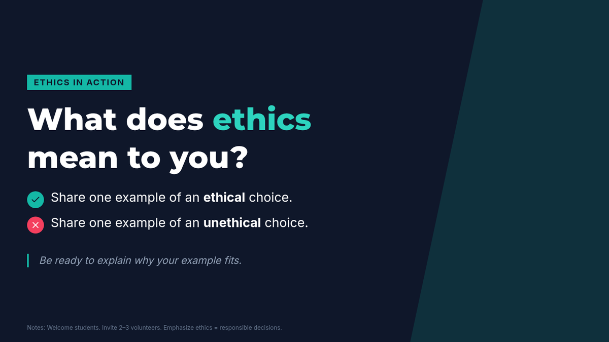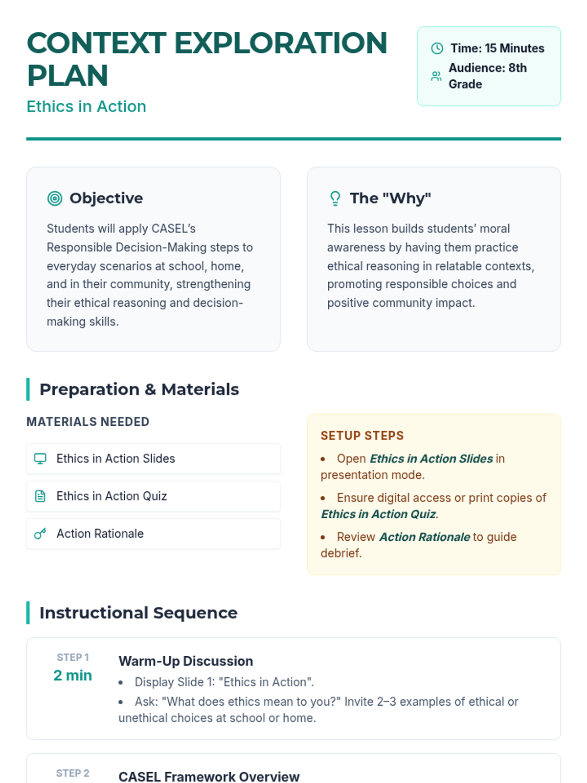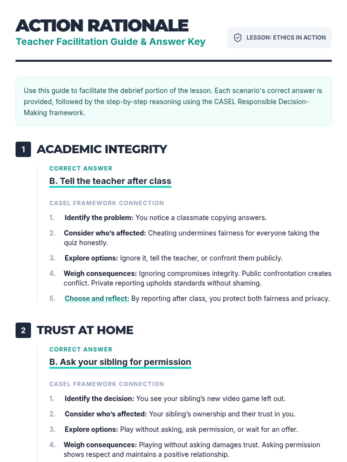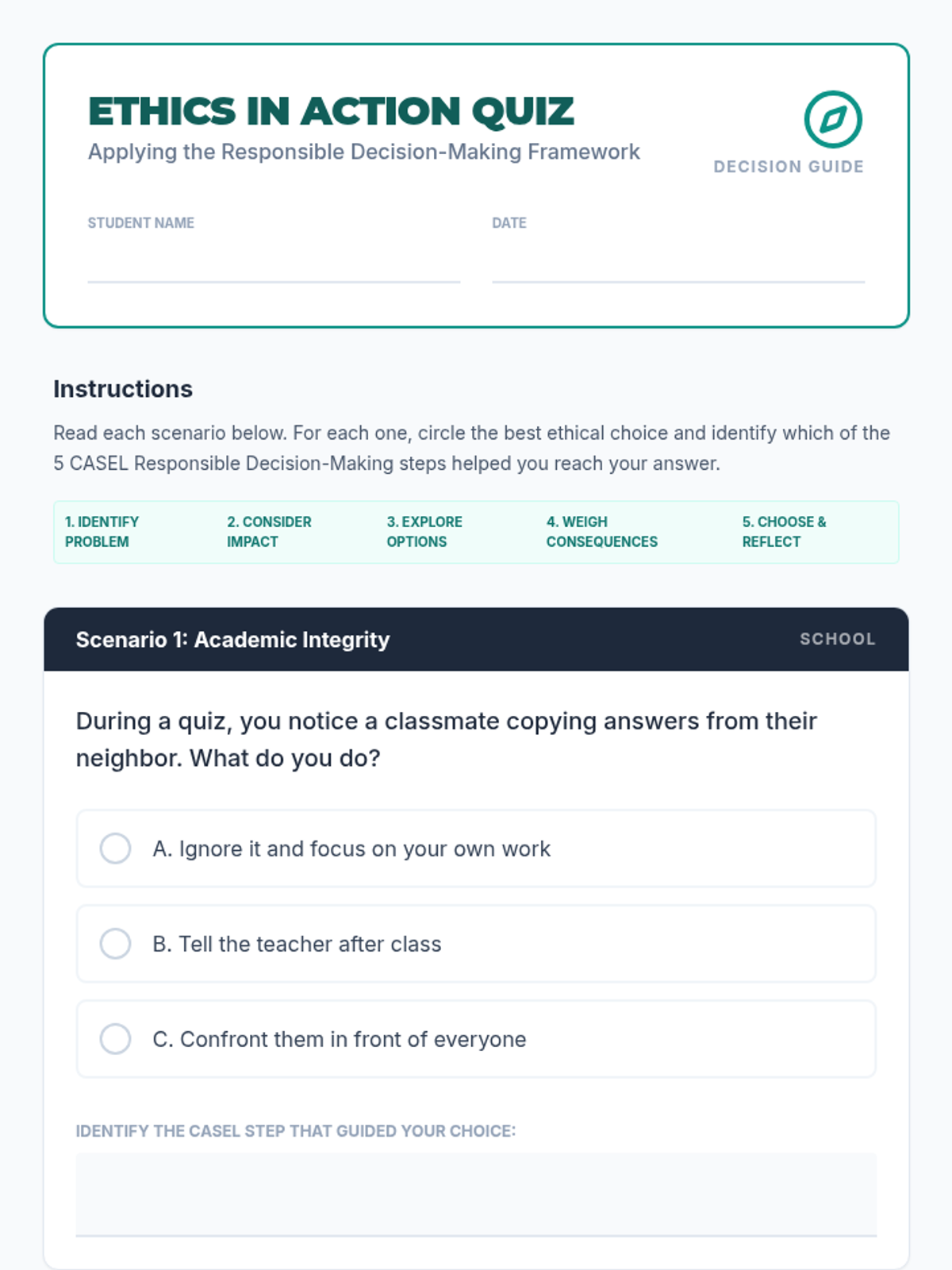 A 15-minute Tier 1 lesson for 8th graders to explore ethical reasoning through CASEL’s Responsible Decision-Making framework using real-life scenarios.