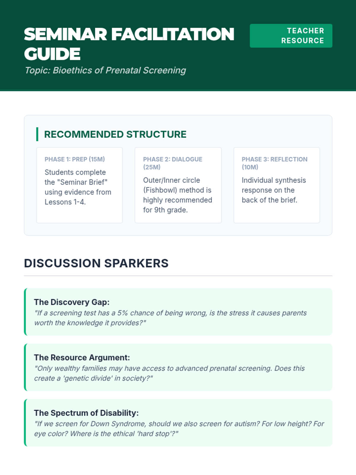 Students engage in a Socratic seminar to debate the ethical complexities of prenatal genetic testing and the implications of knowing genetic information before birth.