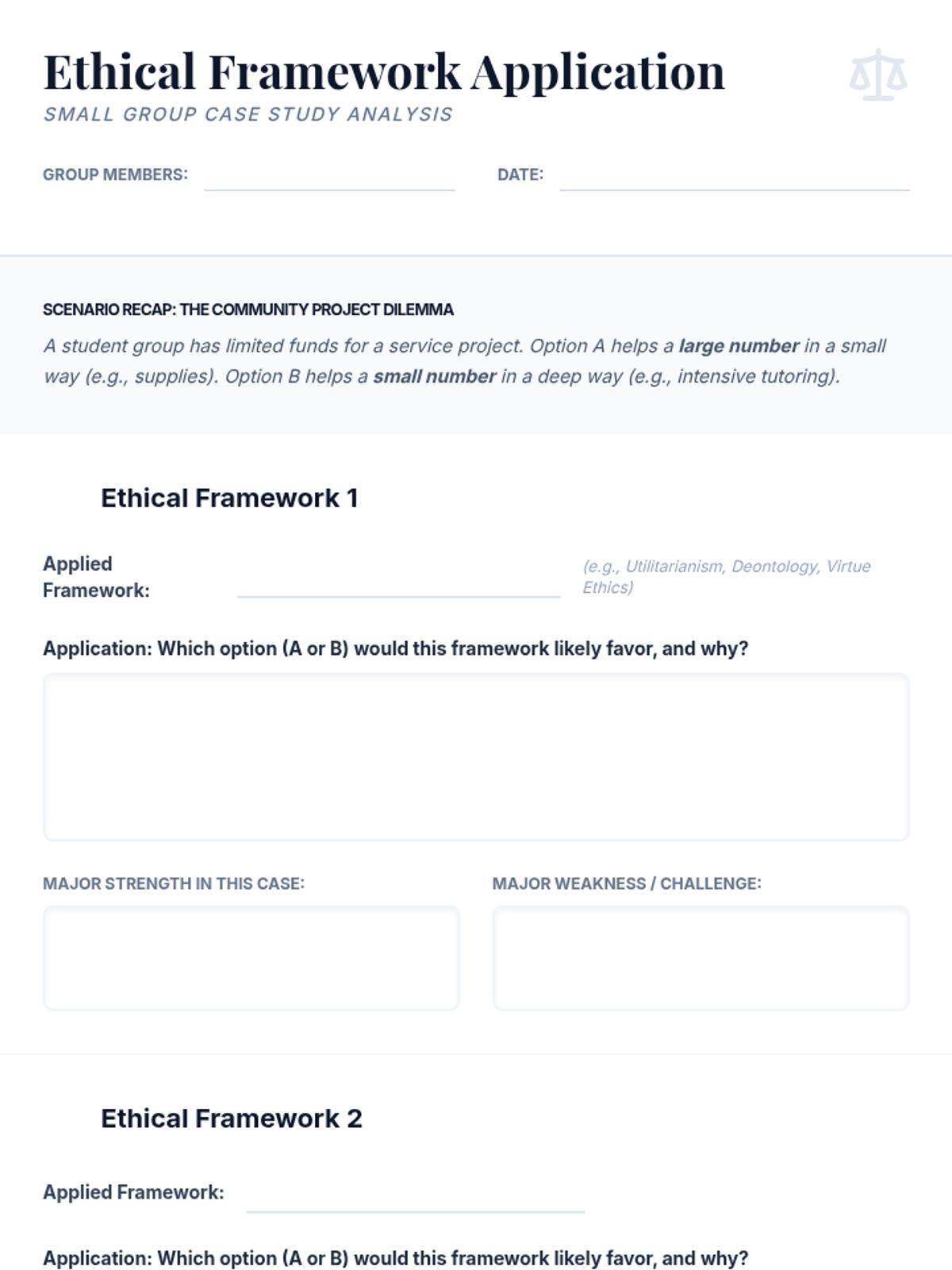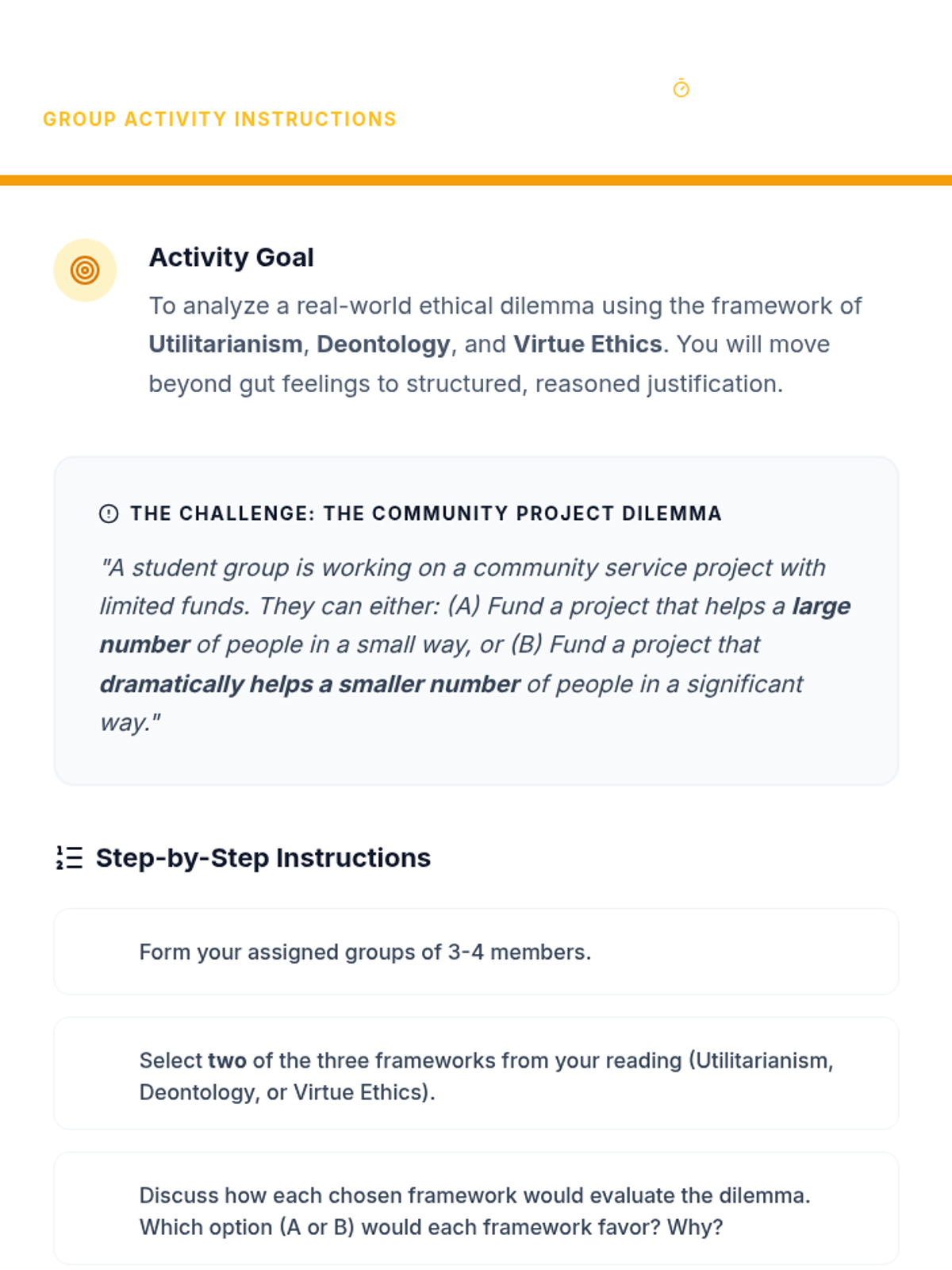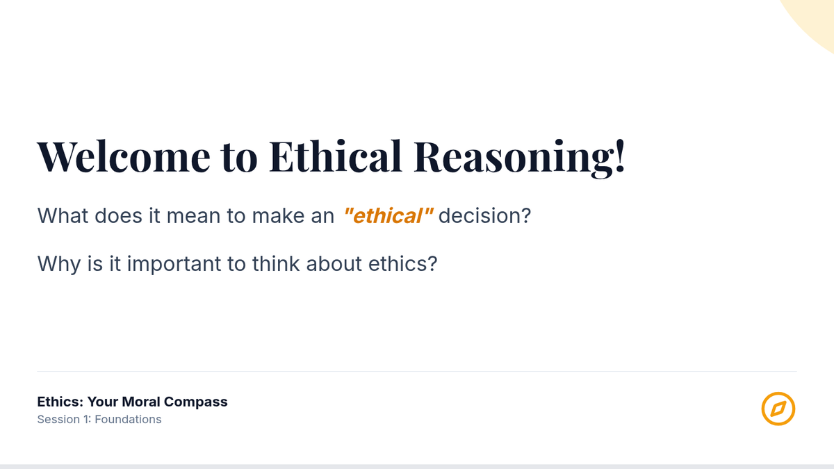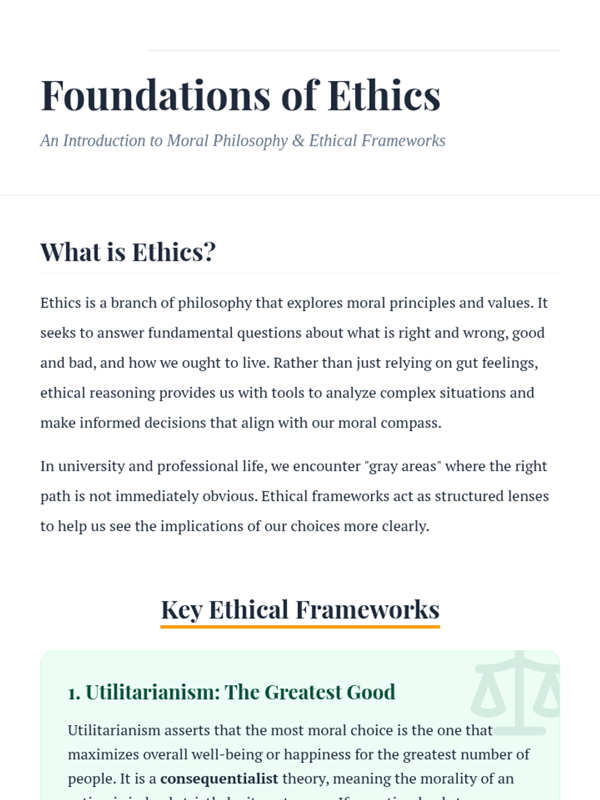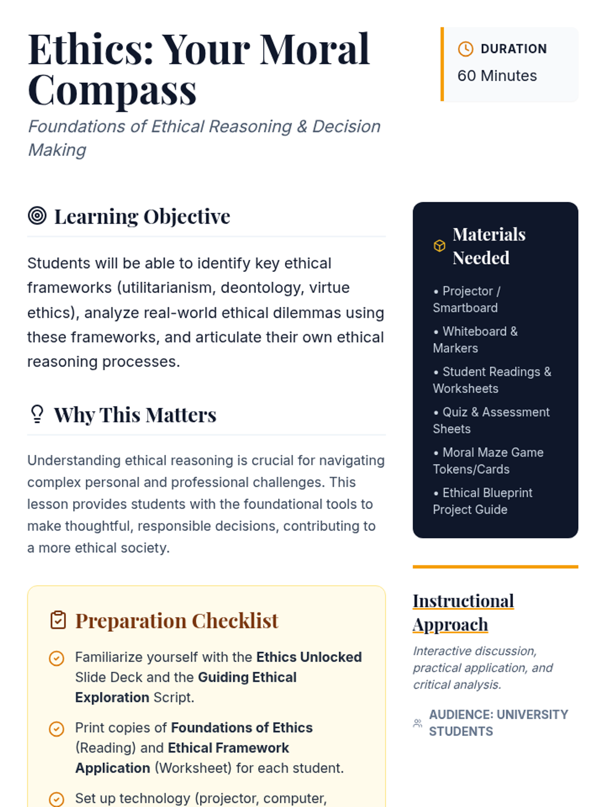 A foundational 60-minute session for university students exploring ethical reasoning through frameworks like utilitarianism, deontology, and virtue ethics. Students apply these tools to real-world dilemmas to foster critical thinking and responsible decision-making.