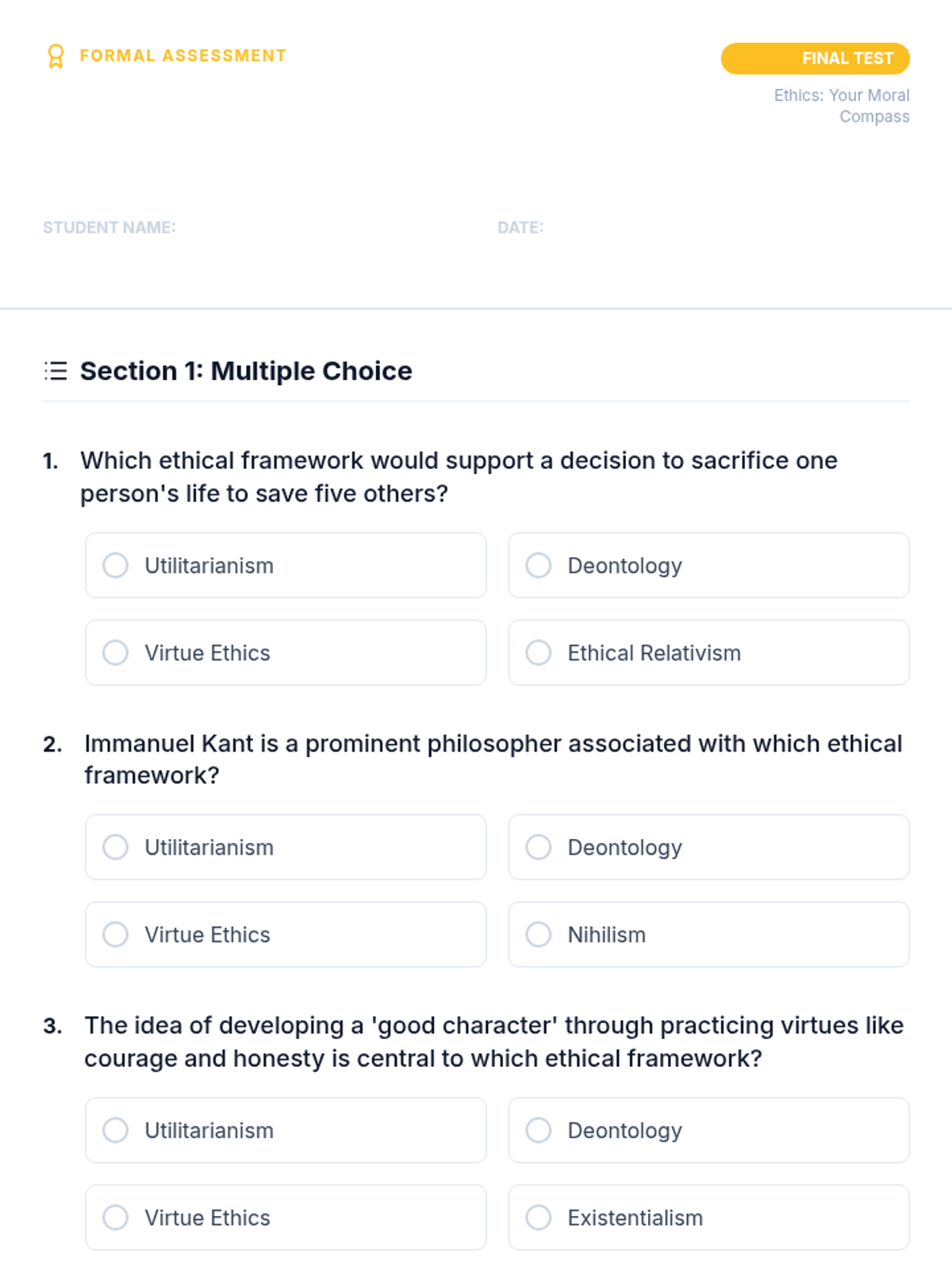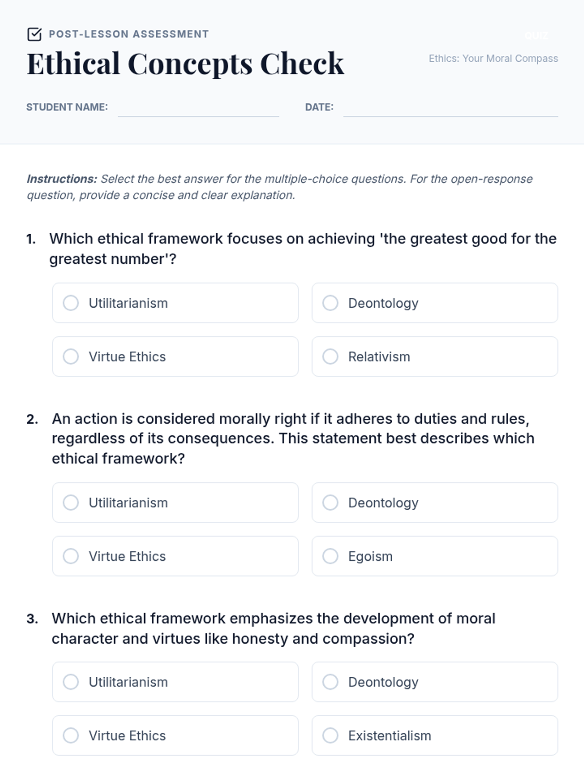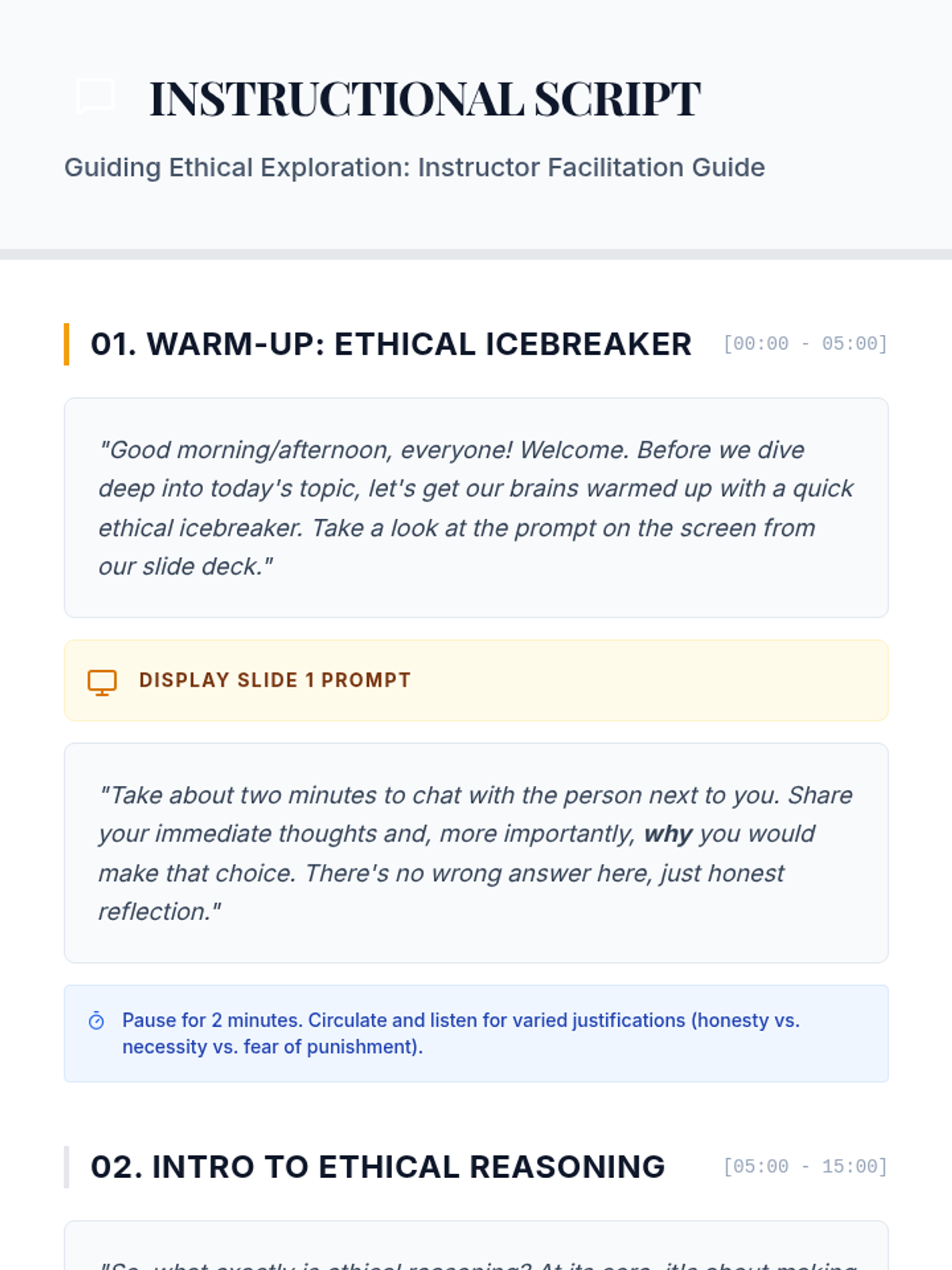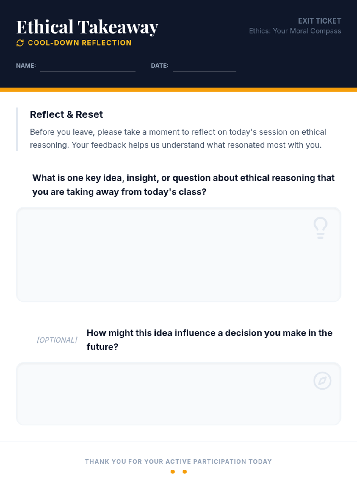 A foundational 60-minute session for university students exploring ethical reasoning through frameworks like utilitarianism, deontology, and virtue ethics. Students apply these tools to real-world dilemmas to foster critical thinking and responsible decision-making.