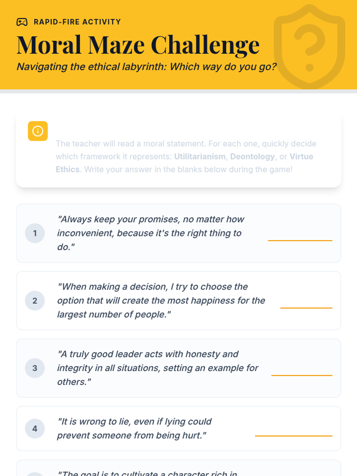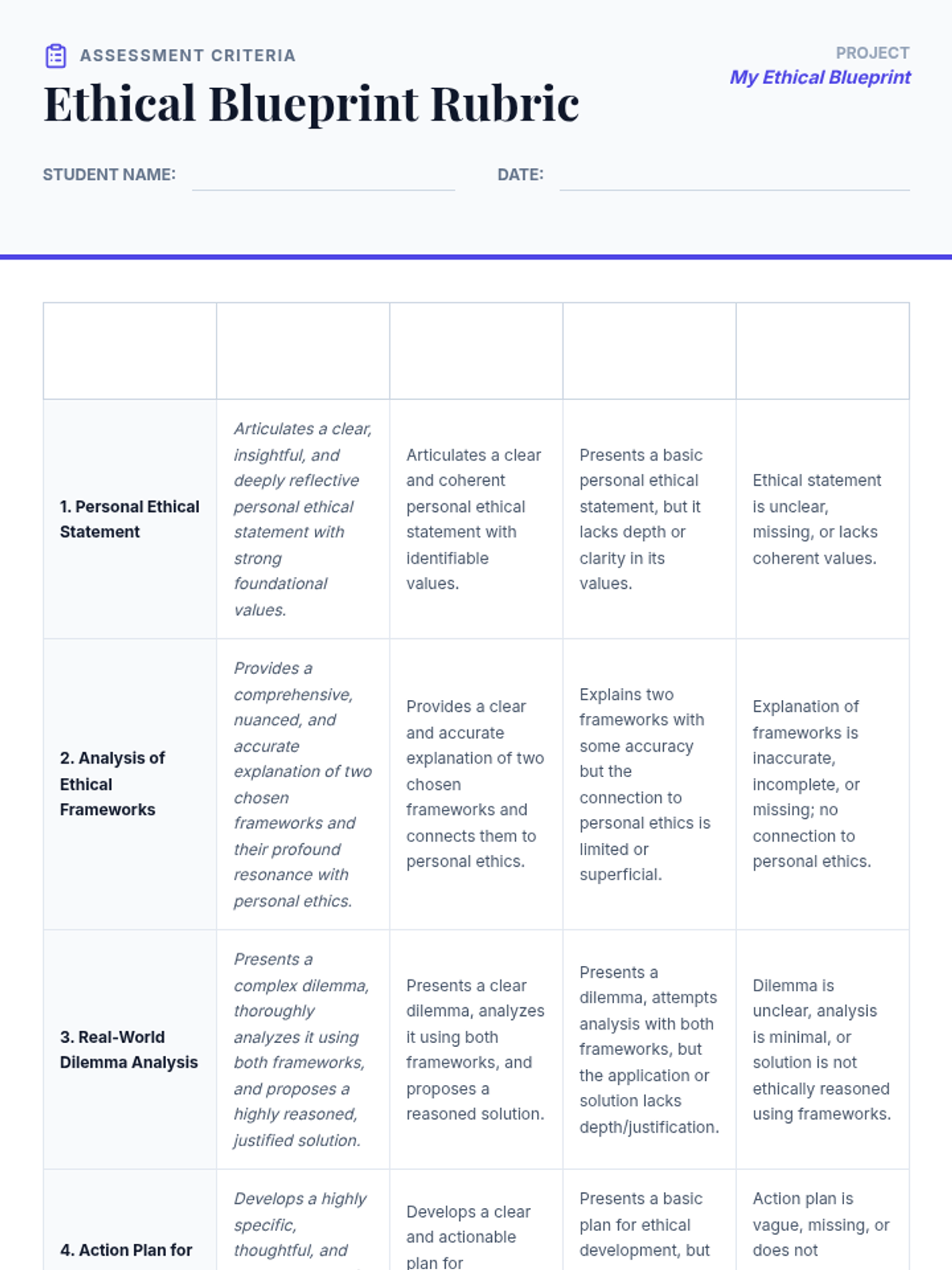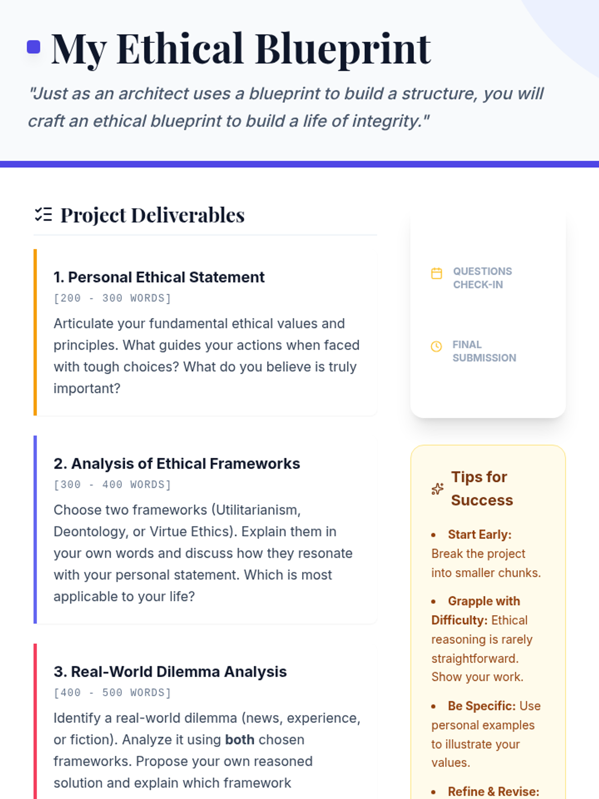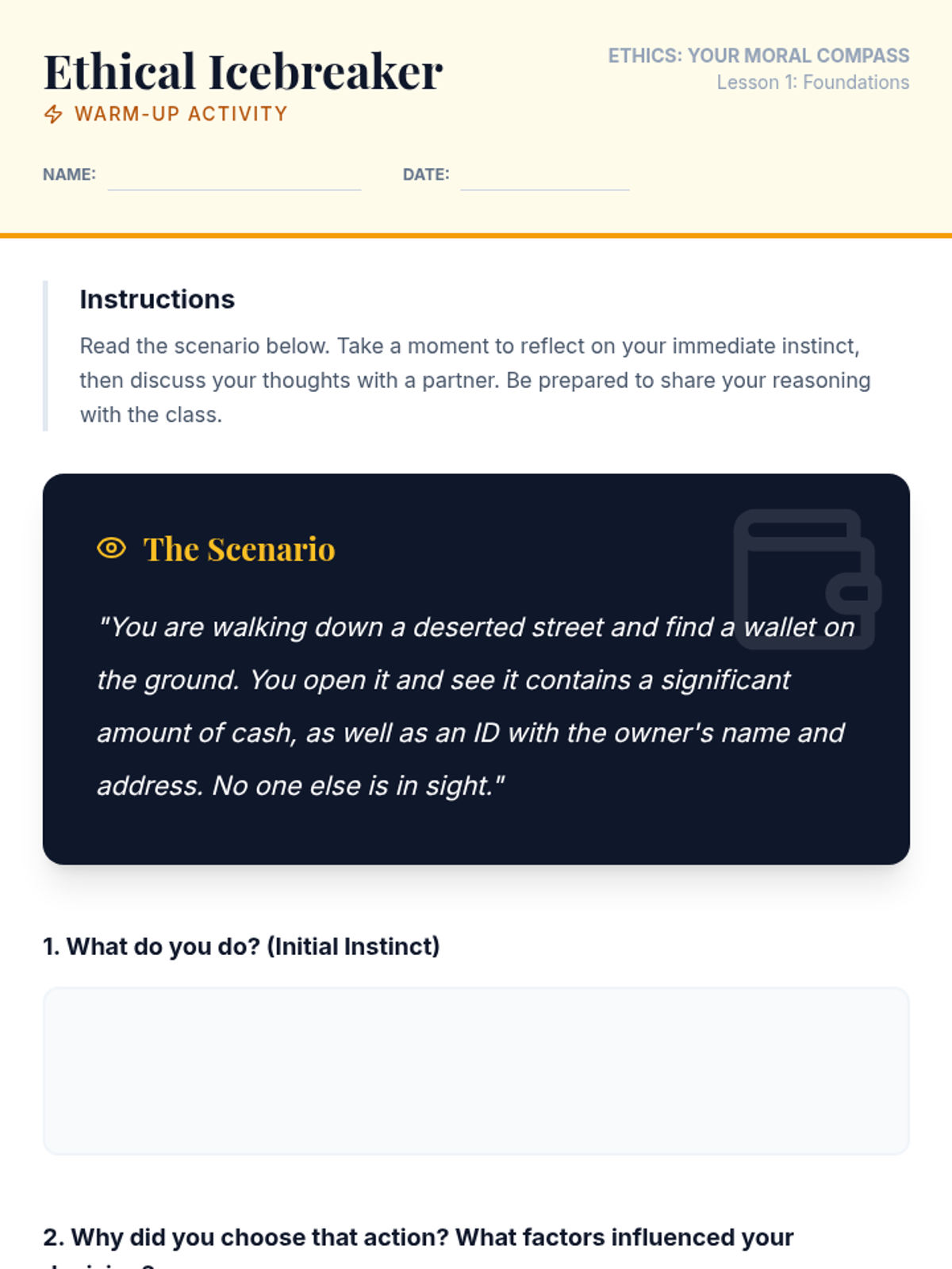 A foundational 60-minute session for university students exploring ethical reasoning through frameworks like utilitarianism, deontology, and virtue ethics. Students apply these tools to real-world dilemmas to foster critical thinking and responsible decision-making.
