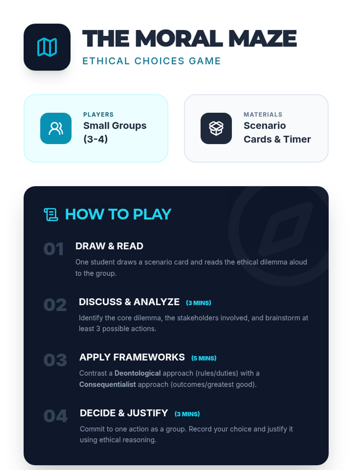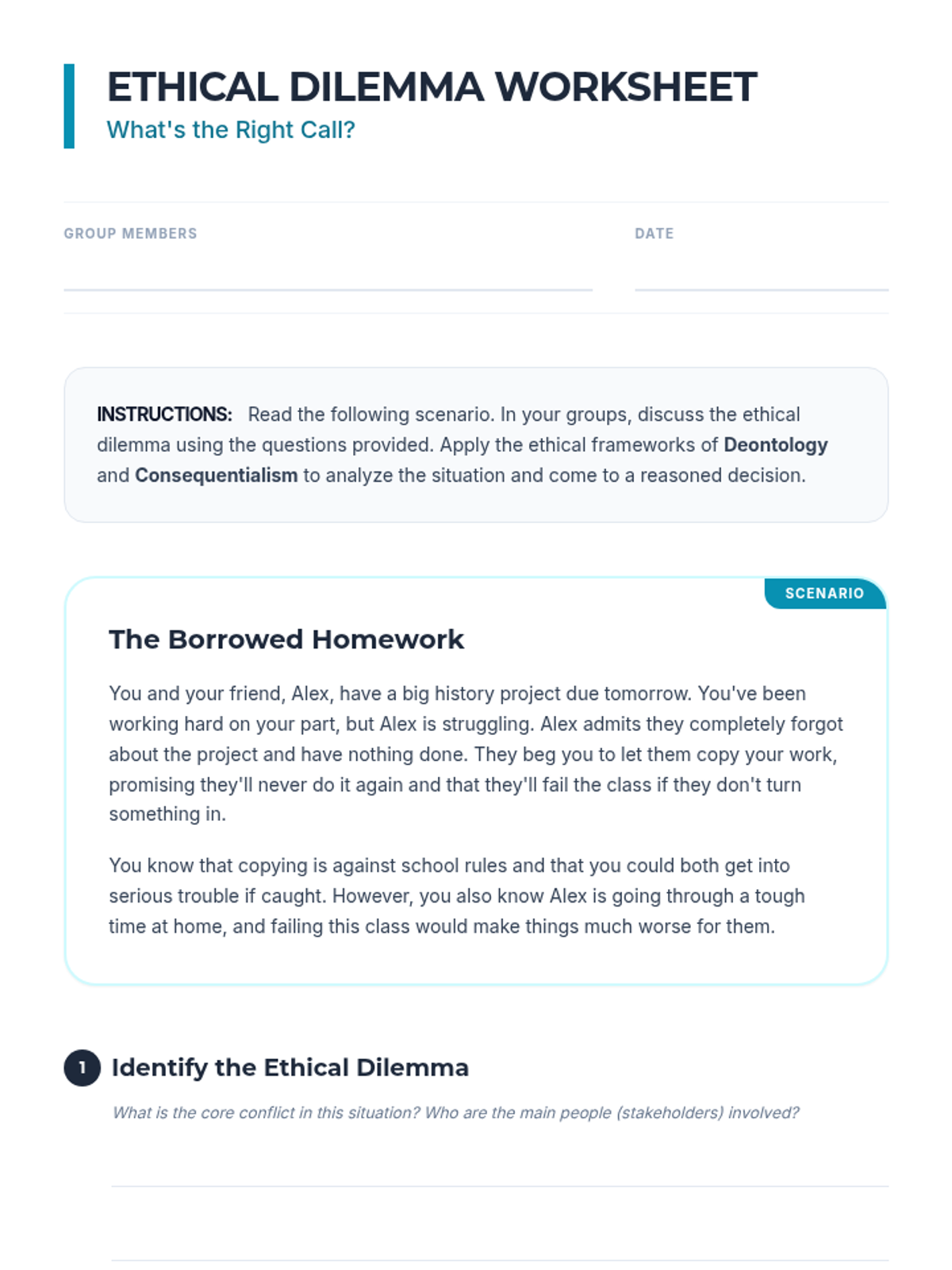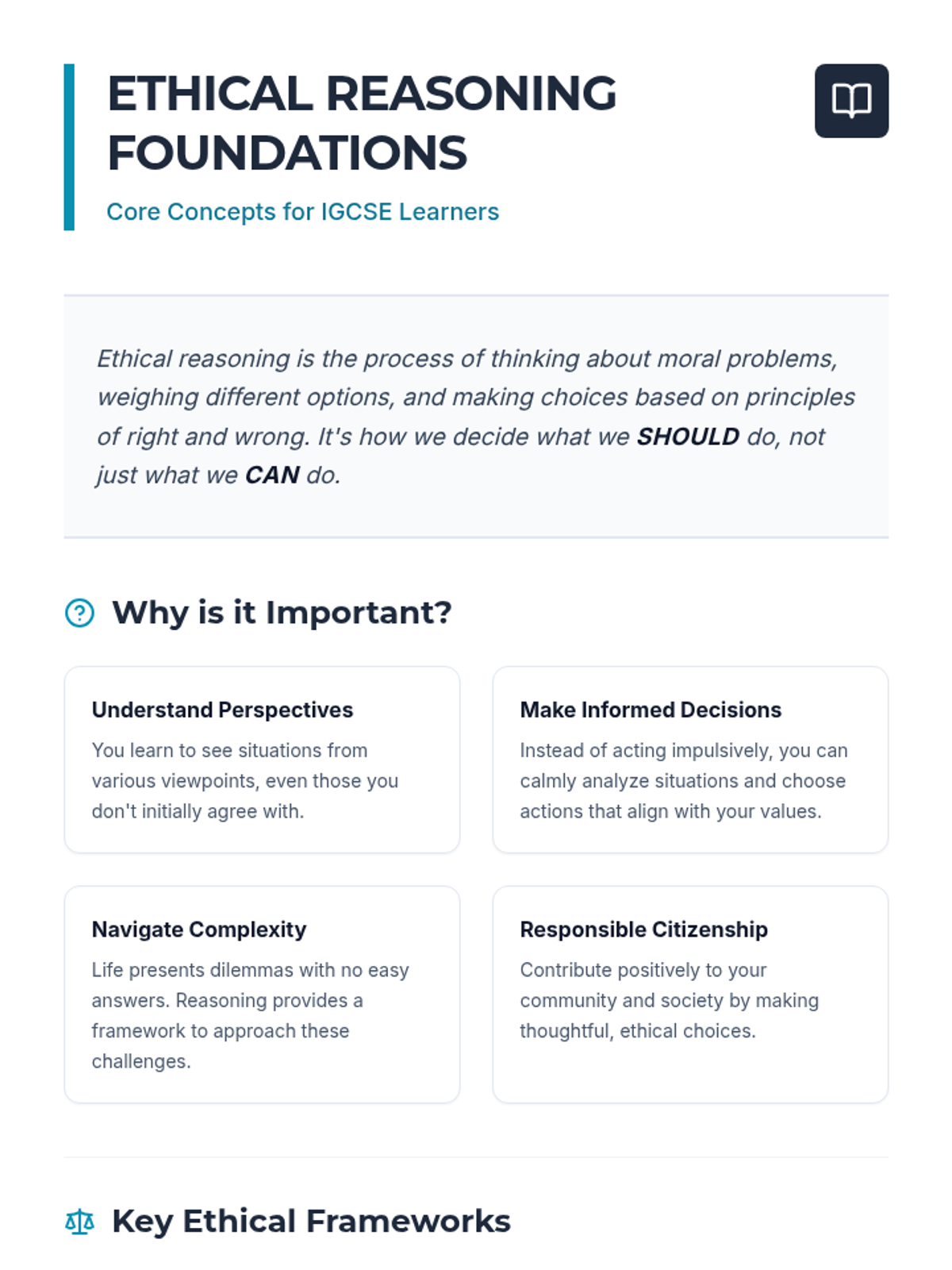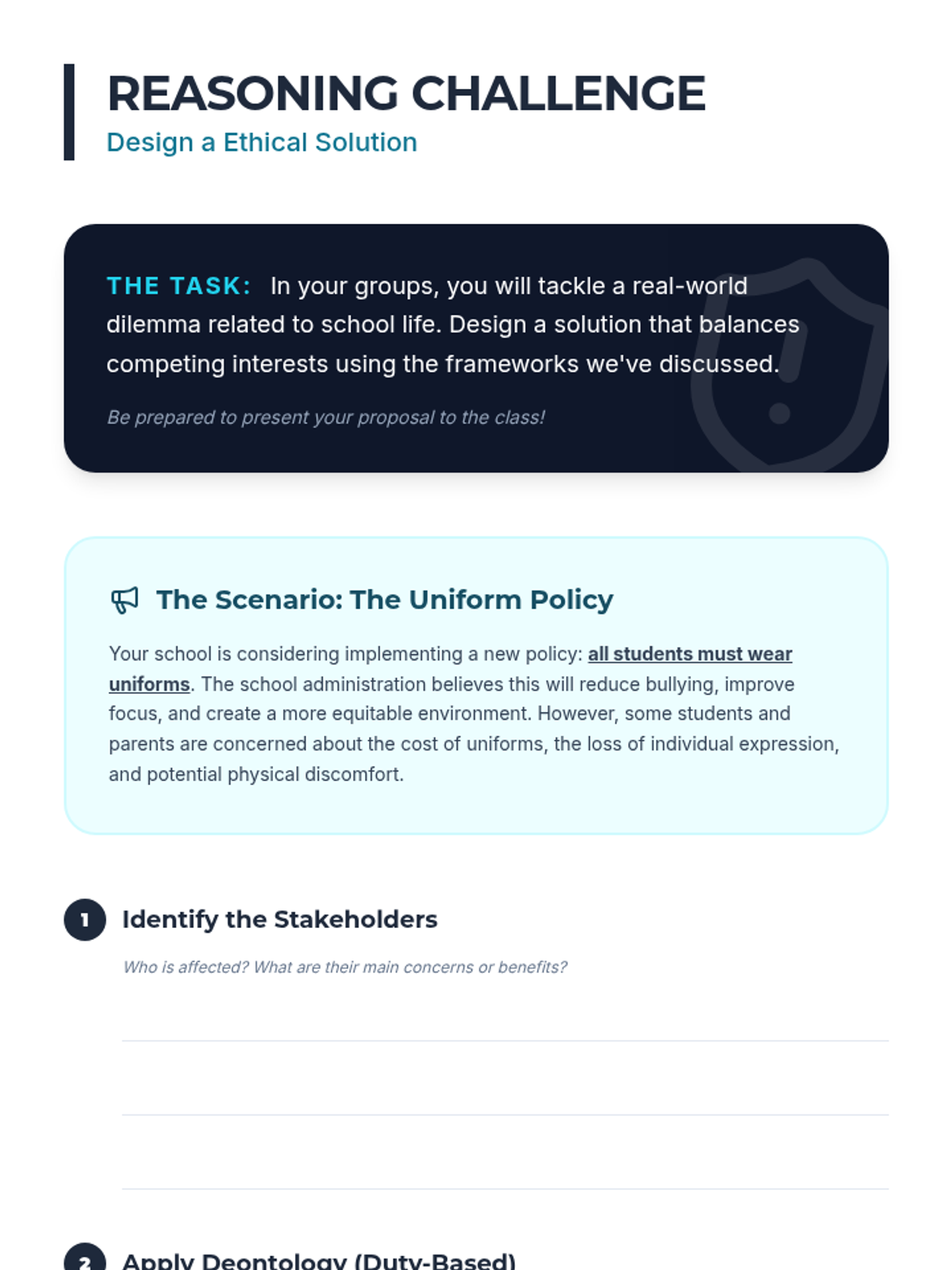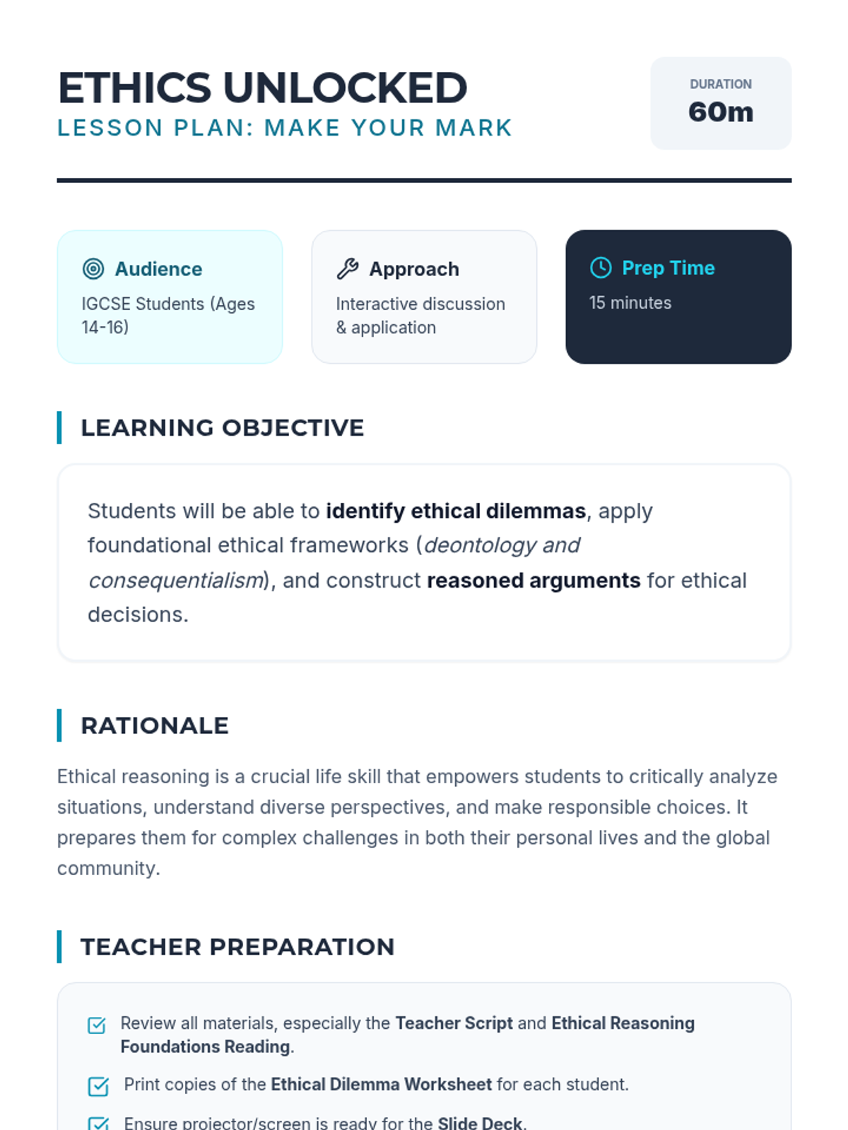 A comprehensive 1-hour lesson for IGCSE students exploring ethical reasoning, deontology, and consequentialism through interactive dilemmas.
